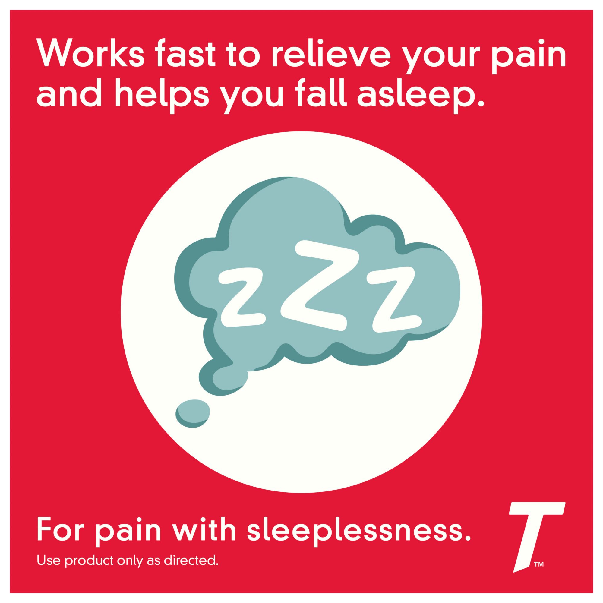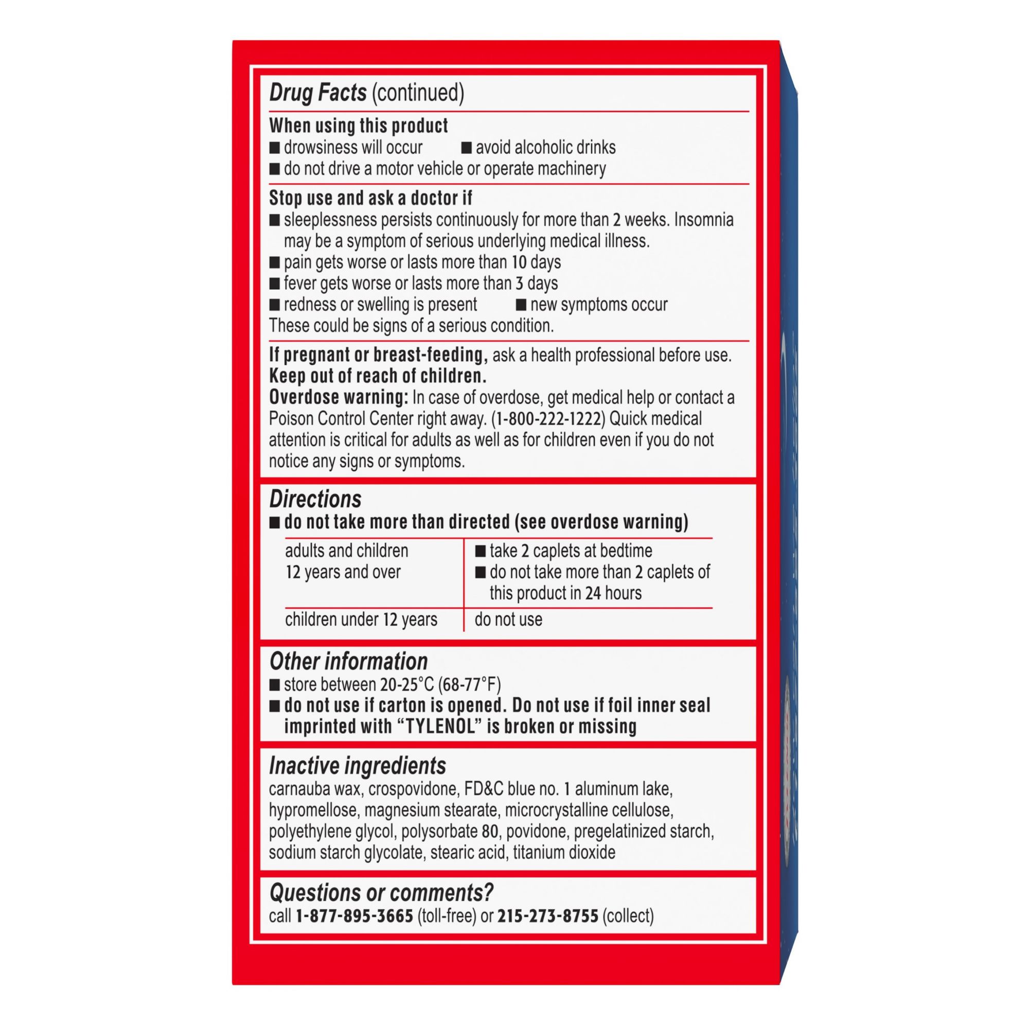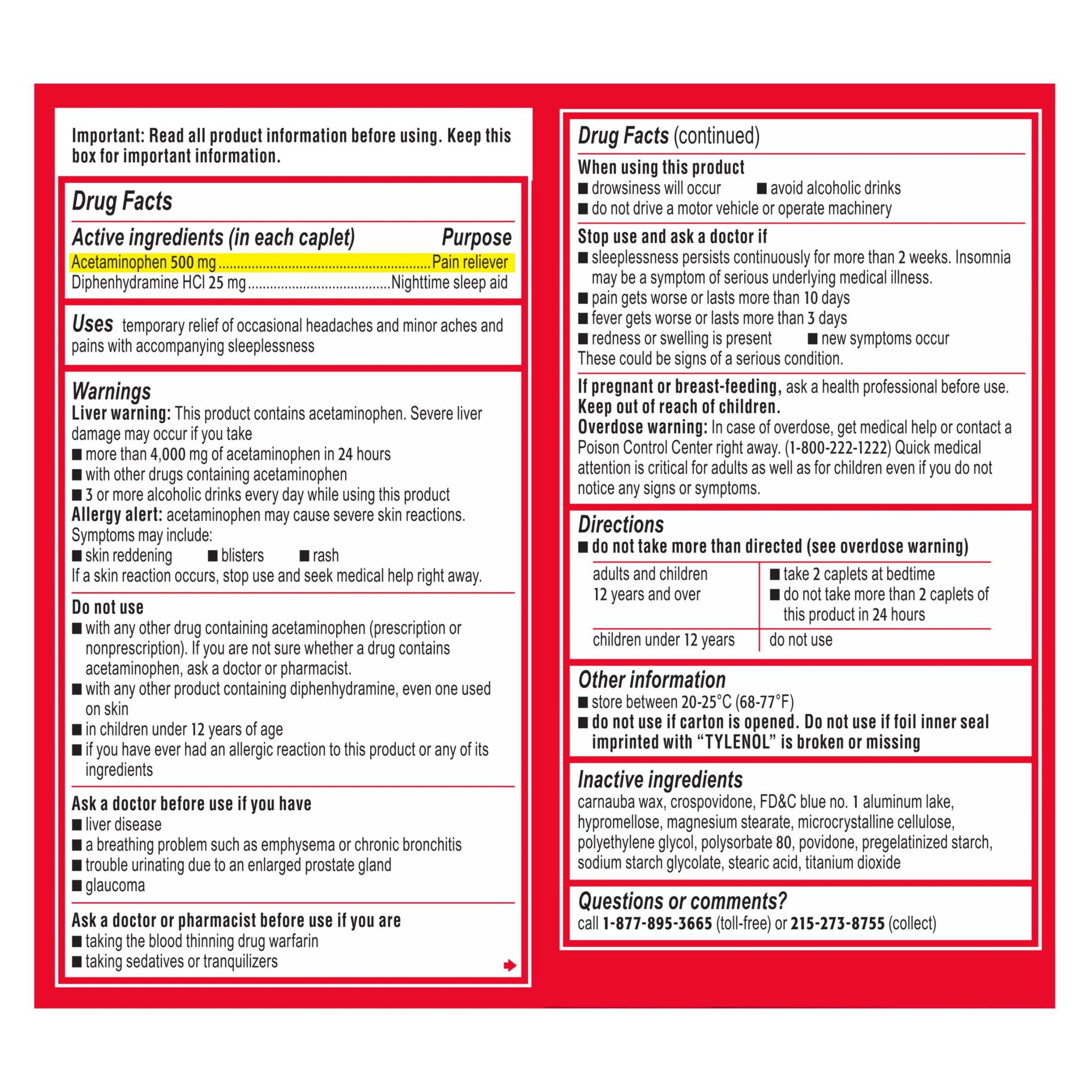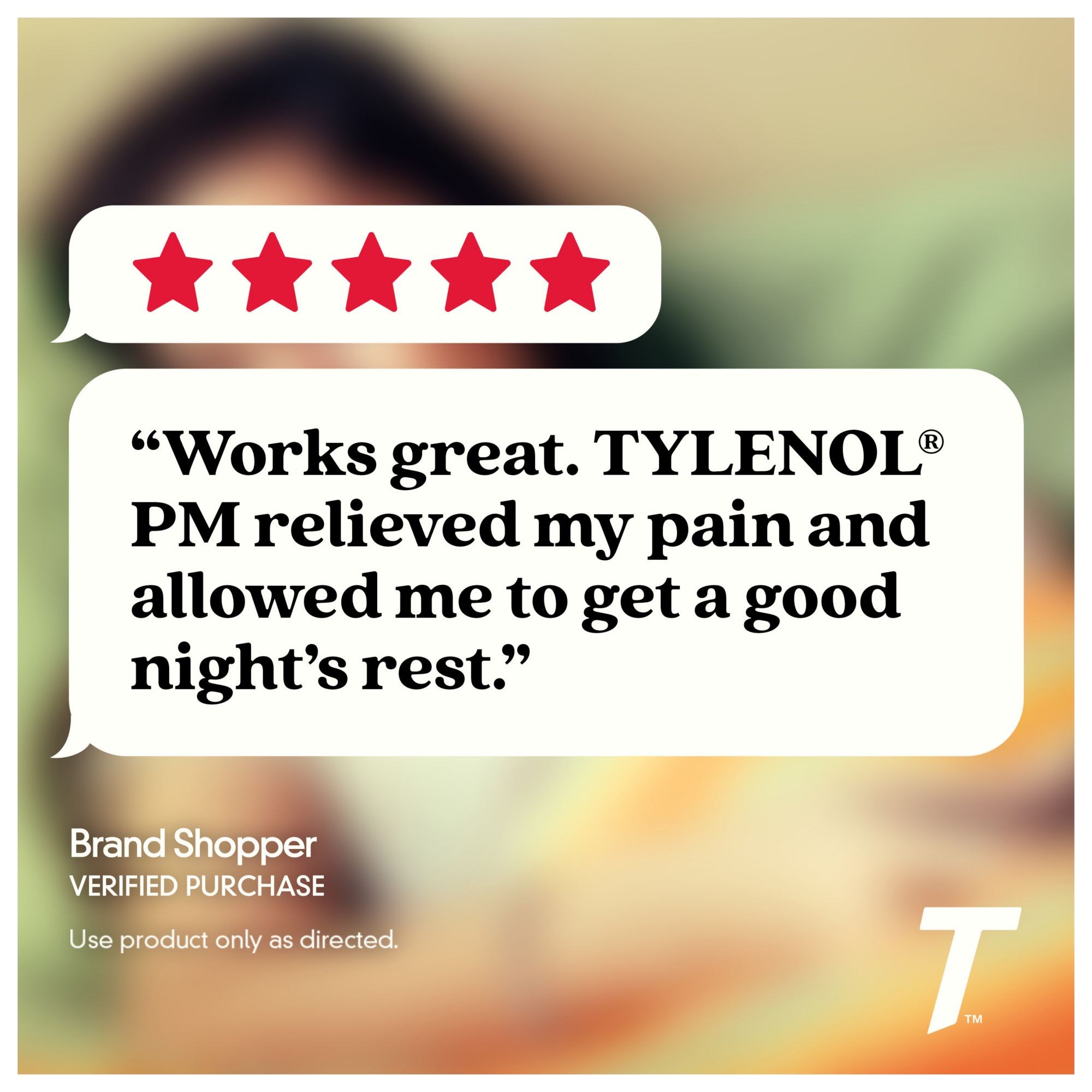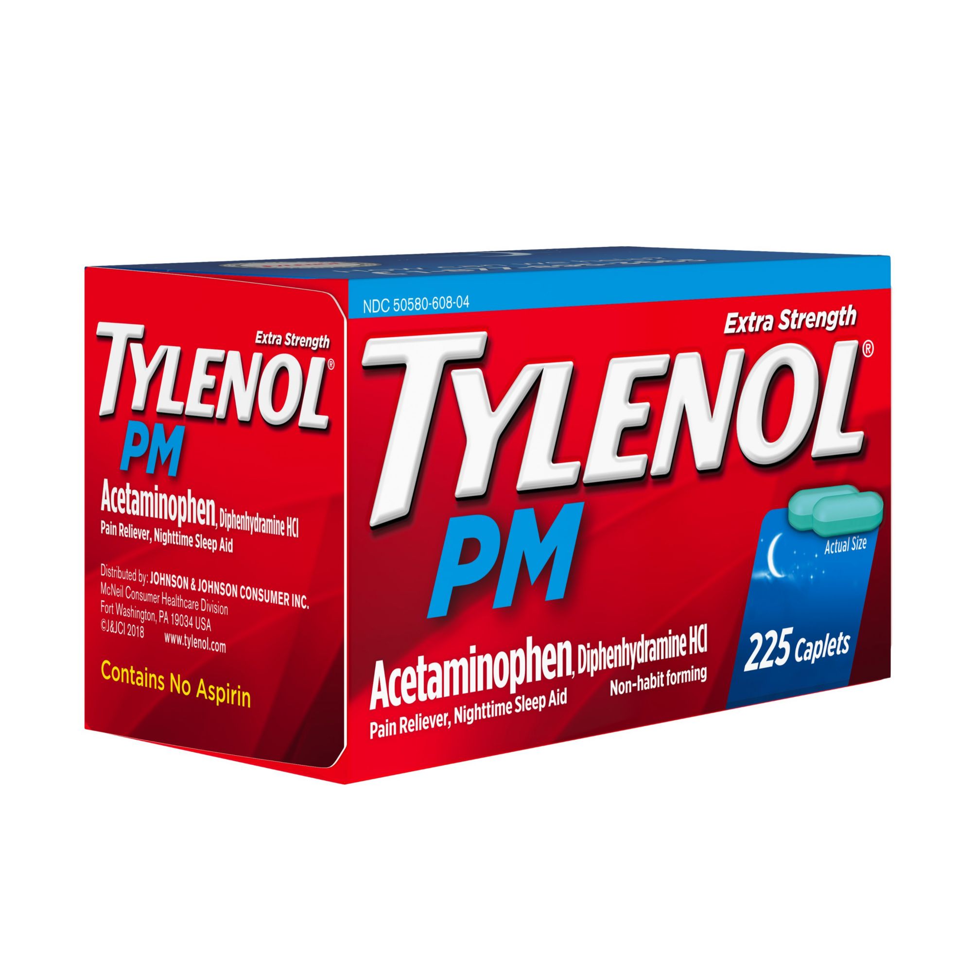Tylenol PM Extra Strength Nighttime Pain Reliever and Sleep Aid Caplets help relieve minor aches and pains and help you fall asleep fast for a more restful sleep. This nighttime pain relief medicine provides 500 mg of acetaminophen and 25 mg of diphenhydramine hydrochloride in each caplet. Both a pain reliever and non-habit forming sleep aid, it is formulated to help you fall asleep and stay asleep while also relieving headaches and minor aches and pain. From Tylenol, the #1 doctor-recommended brand for pain relief and fever reduction, it can be used by adults and children 12 years and older, and is nonhabit forming when used as directed.