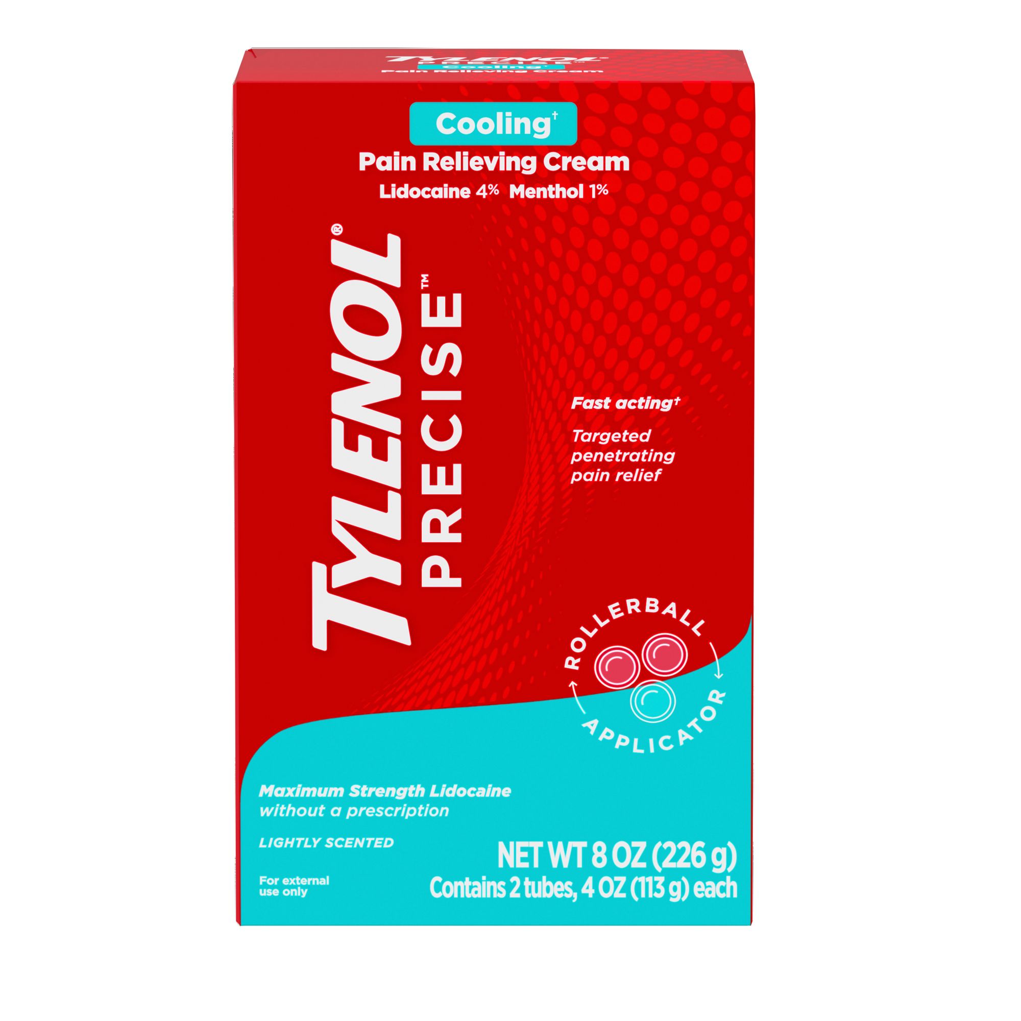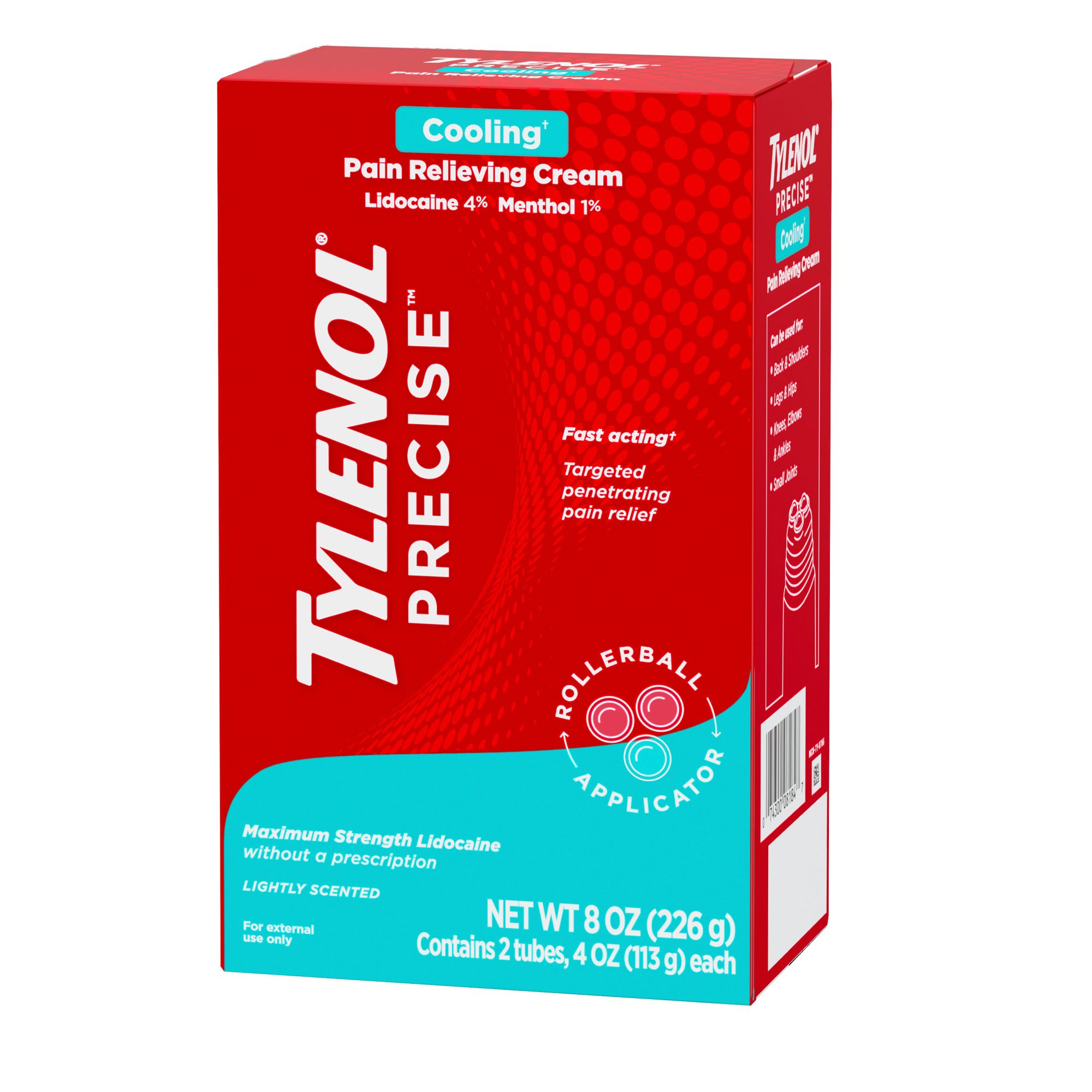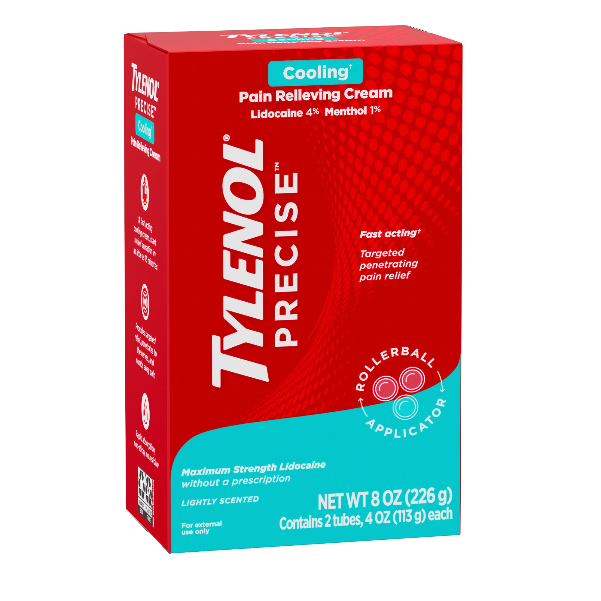 Tylenol Precise Cooling Pain Relieving Cream provides penetrating pain relief to help numb minor joint and muscle soreness. Formulated with maximum strength combination of lidocaine and menthol without a prescription for pain relief, this pain relieving cream targets pain receptor nerves to block pain signals and provide relief from muscle aches and pains. This topical analgesic is ideal for use on the back and shoulders, legs and hips, knees, elbows and ankles, and other small joints. The fast-absorbing, non-sticky cream is lightly scented and won't leave any residue behind on skin or clothes. To use, adults and children 12 and older should apply the pain relief cream to affected areas no more than three to four times daily.
