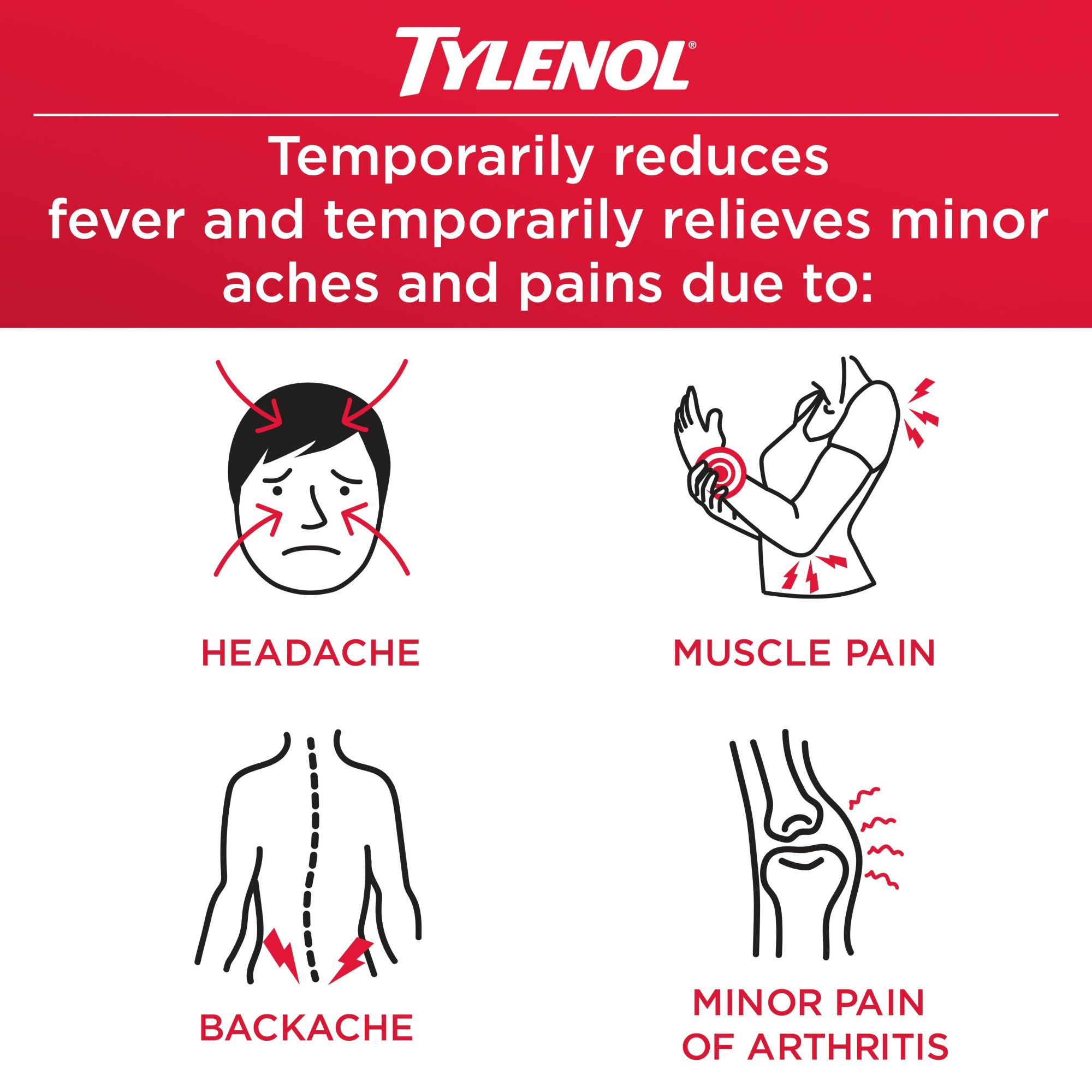 Tylenol Rapid Release Gels provide temporary relief of fever and minor aches and pains, including headache, backache, minor pain of arthritis, toothaches, pain due to the common cold, premenstrual and menstrual cramps. Each gelcap contains 500 milligrams of acetaminophen, a pain reliever. The Rapid Release gelcaps feature laser-drilled holes to facilitate fast medicine release