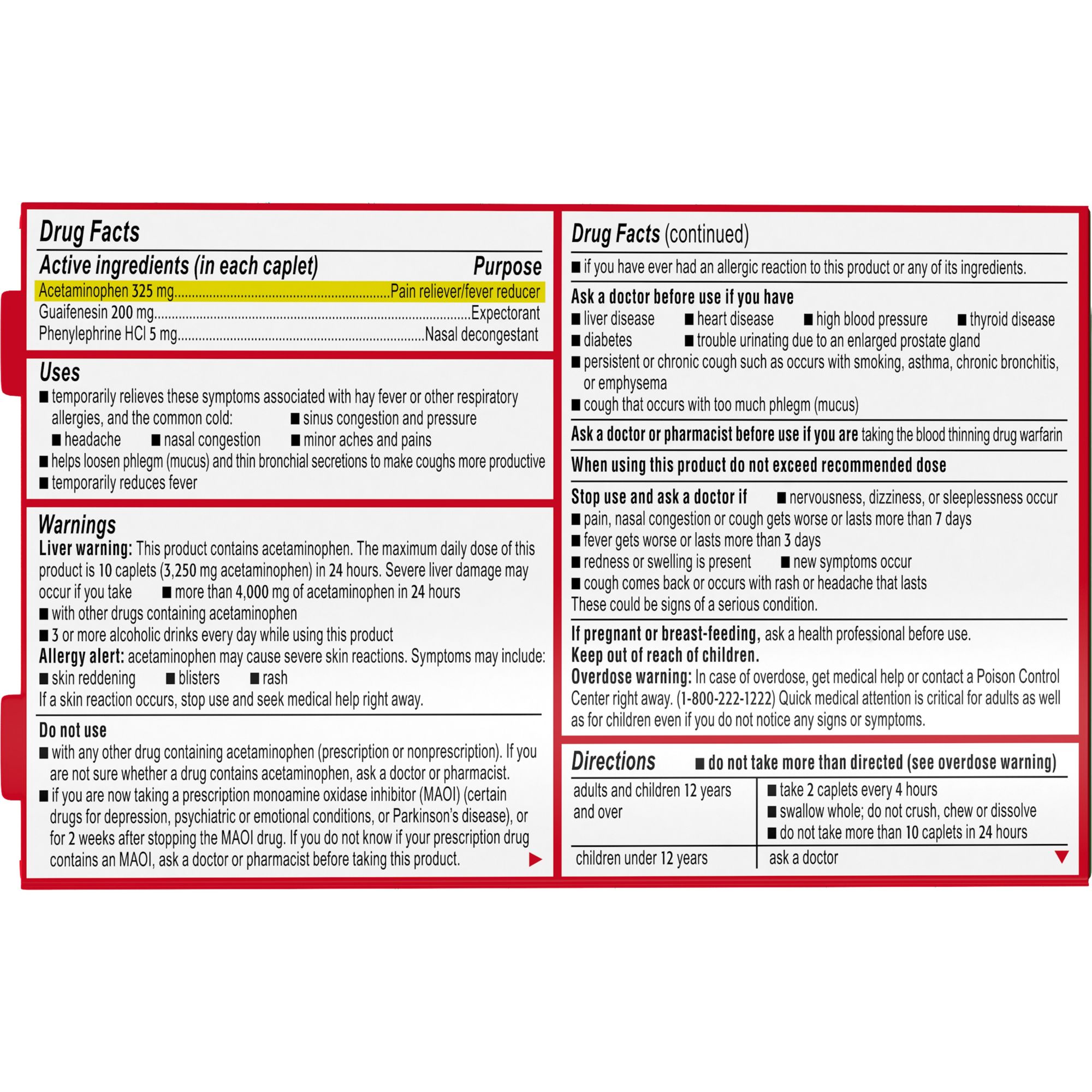 Tylenol sinus severe daytime medicine caplets for non-drowsy cold, flu & allergy symptom relief Pain reliever, decongestant, fever reducer & expectorant to help relieve sinus headache & pressure Cold & flu symptom relief medicine helps decongest sinus openings & passages & loosens phlegm Each caplet contains 325mg of acetaminophen to temporarily relieve pain and reduce fever Each caplet contains 5mg of phenylephrine HCl, a nasal decongestant to help clear nasal passages Each caplet contains 200mg of expectorant guaifenesin to help make coughs more productive The non-drowsy decongestant formula of this sinus medicine provides effective daytime symptom relief Sinus & chest congestion relief caplets are suitable for adults and children ages 12 years and older