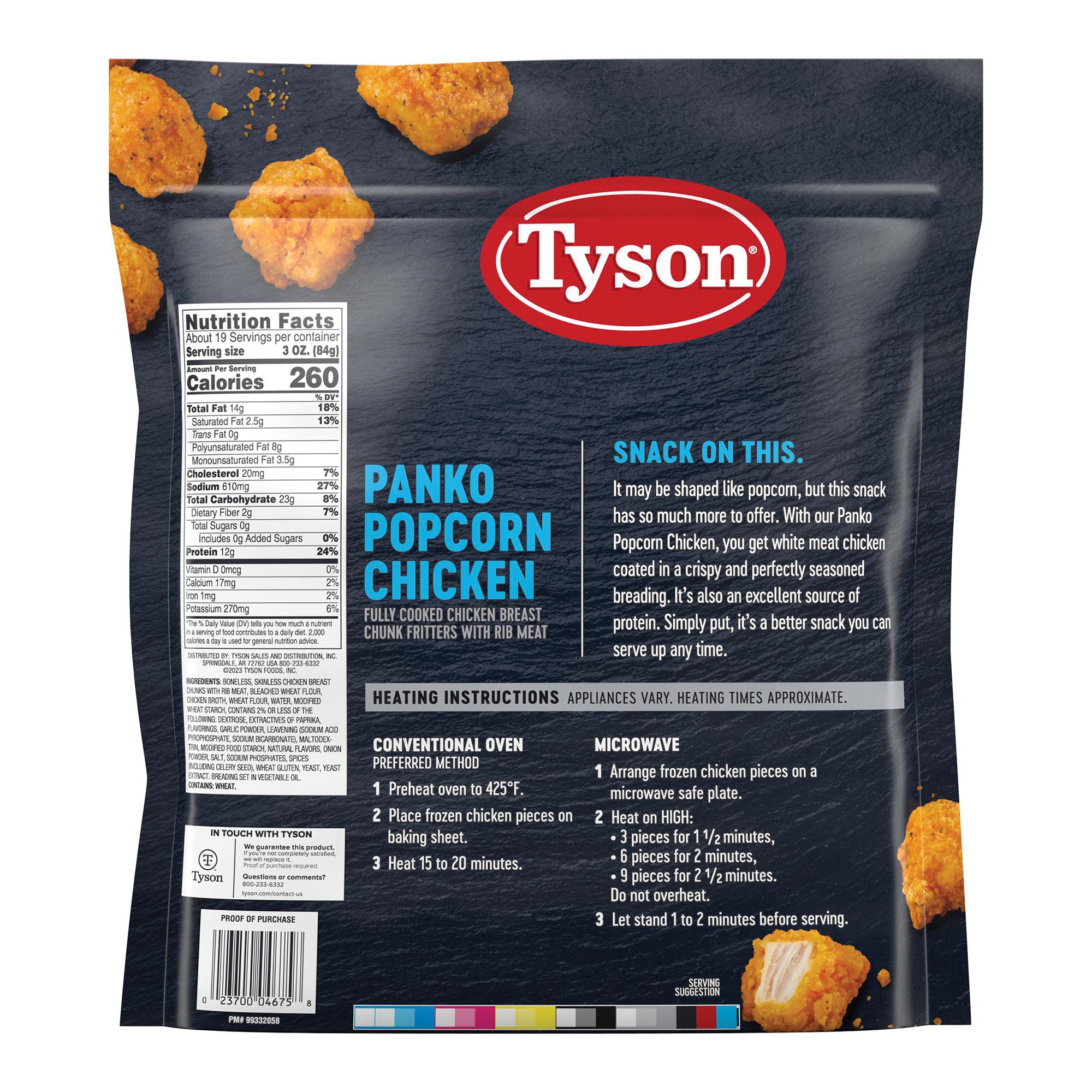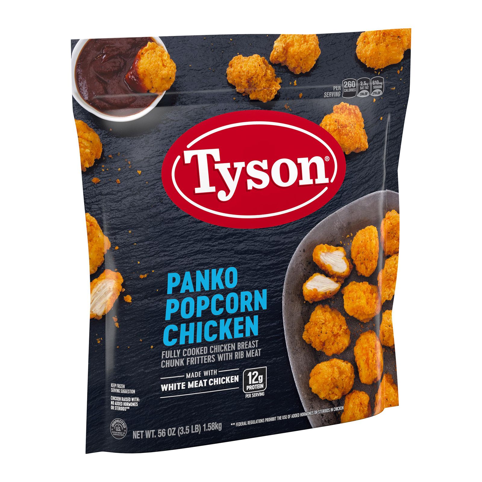Tyson all natural panko breaded popcorn chicken is a delicious addition to any meal. These chicken breast bites are made with all natural white meat chicken with no preservatives. With 0 grams of trans fat and 12 grams of protein per serving, these chicken breast bites are sure to be a hit with the entire family. Fully cooked and ready-to-eat, simply cook and serve with BBQ sauce for a protein-packed dinner. Everything seems to turn out a whole lot better when you just keep it simple. The 100% real stuff that makes life great. With high-quality farm-raised chicken, Tyson keeps it real in everything they do.