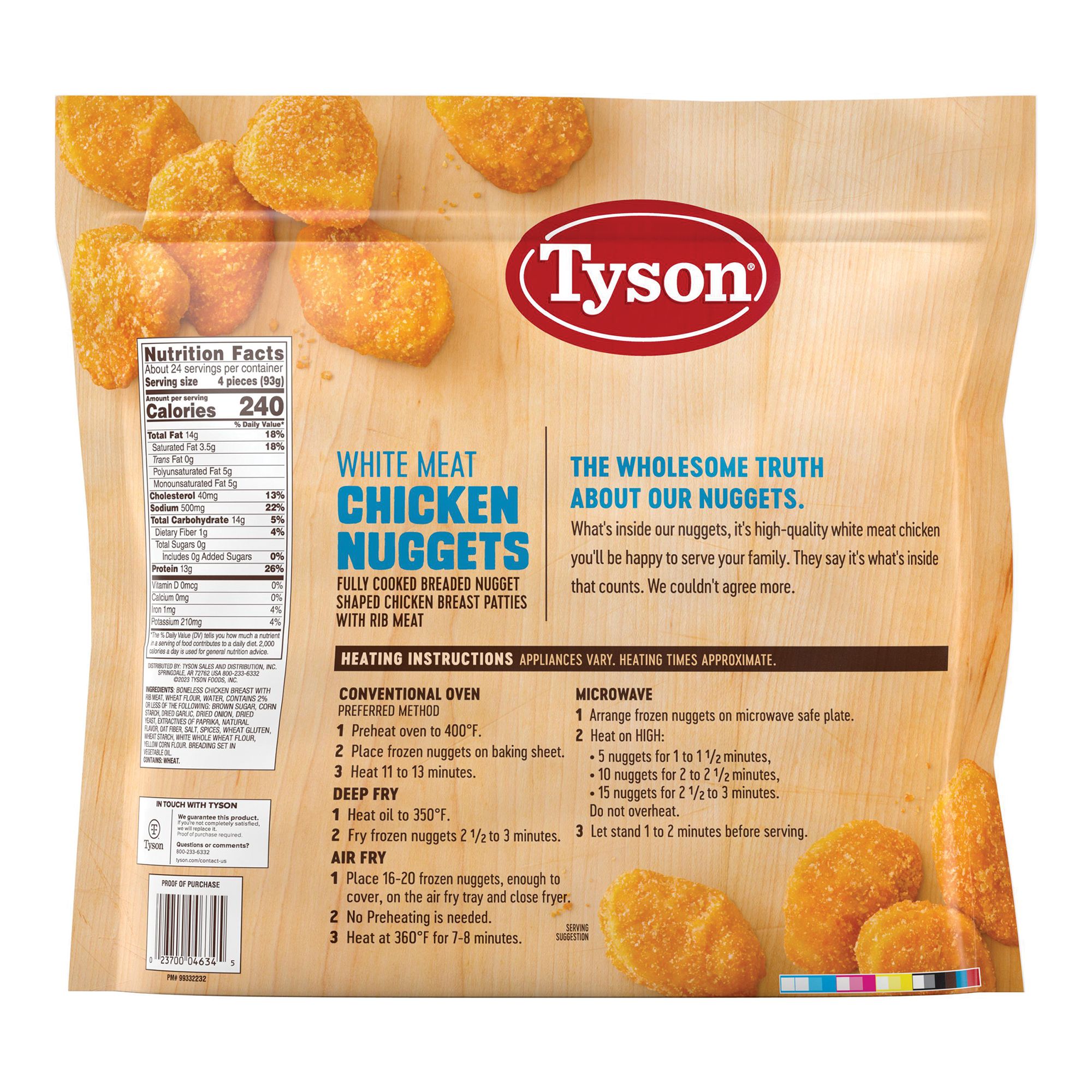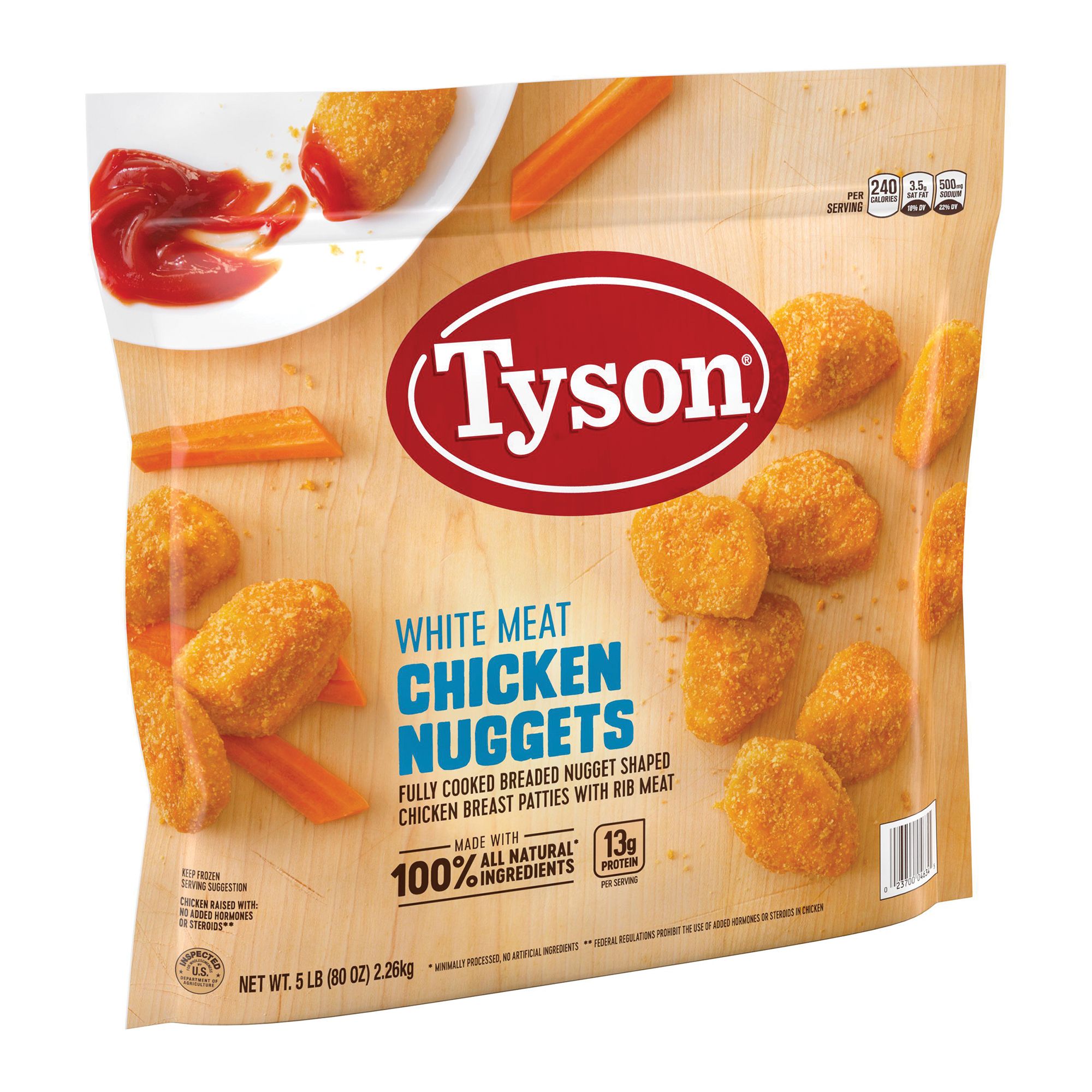 Tyson all natural white meat chicken nuggets are a delicious addition to any meal. These chicken nuggets are made with all natural white meat chicken with no artificial ingredients, then breaded and seasoned to perfection. With 12 grams of protein and 0 grams of trans fat per serving, these chicken nuggets are sure to be a hit with the entire family. Fully cooked and ready-to-eat, simply prepare in an oven or microwave and serve with ketchup for a protein-packed lunch. Everything seems to turn out a whole lot better when you just keep it simple. The 100% real stuff that makes life great. With high quality farm raised chicken, Tyson keeps it real in everything they do.