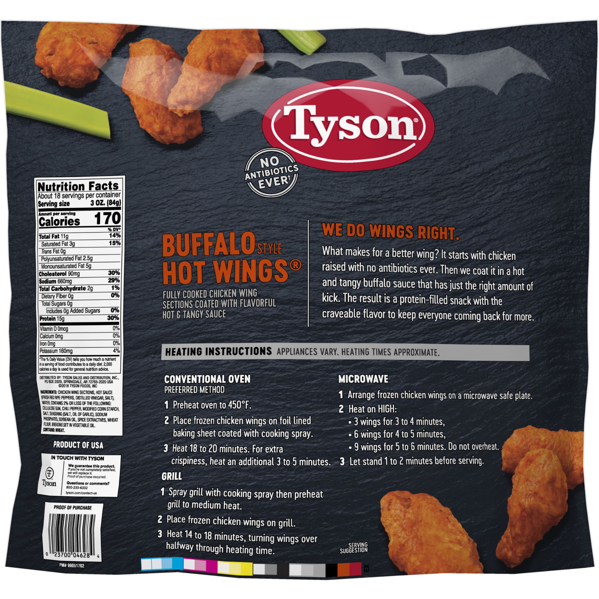 Whether it's a game day party, spontaneous get-together or after school feeding frenzy, Tyson Fully Cooked Bone-In Buffalo Style Hot Chicken Wings are perfectly coated with hot and tangy buffalo sauce. Raised with no antibiotics ever, our chicken is juicy and packed with 15 grams of protein per serving. Simply heat and serve our chicken wings with ranch dipping sauce for a quick and delicious weeknight dinner. Includes one 5 lb. package of bone-in chicken wings. Everything seems to turn out a whole lot better when you just keep it simple. No nonsense. Just stick to the good stuff. The 100% real stuff that makes life great. With high quality farm raised chicken, with no antibiotics ever, we keep it real in everything we do. Keep it real. Keep it Tyson.