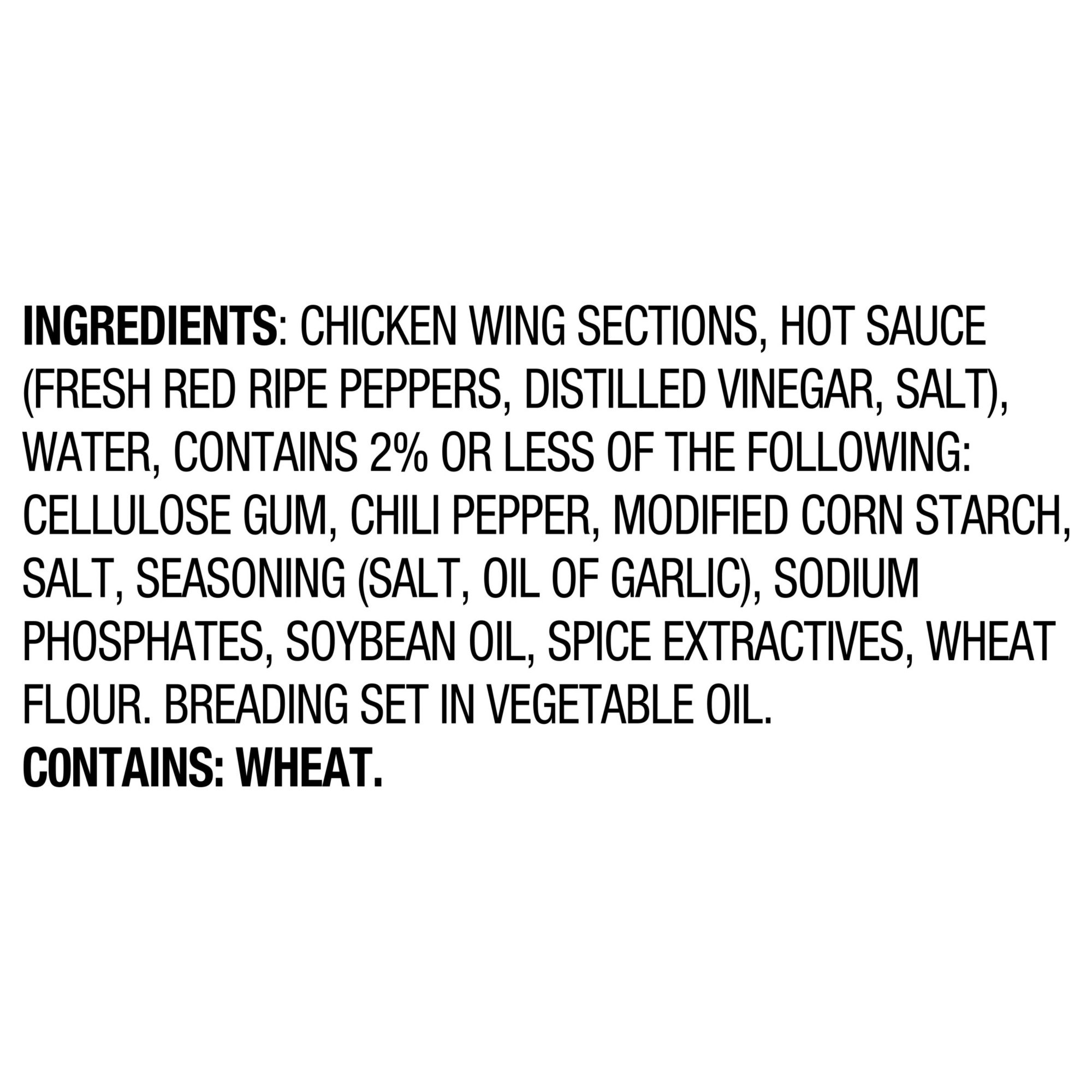 Chicken wing sections, water, hot sauce (fresh red ripe peppers, distilled vinegar, salt), contains 2% or less of the following: chili pepper, garlic powder, guar gum, modified food starch, salt, sodium phosphates, soybean oil, wheat flour, xanthan gum. Breading set in vegetable oil.