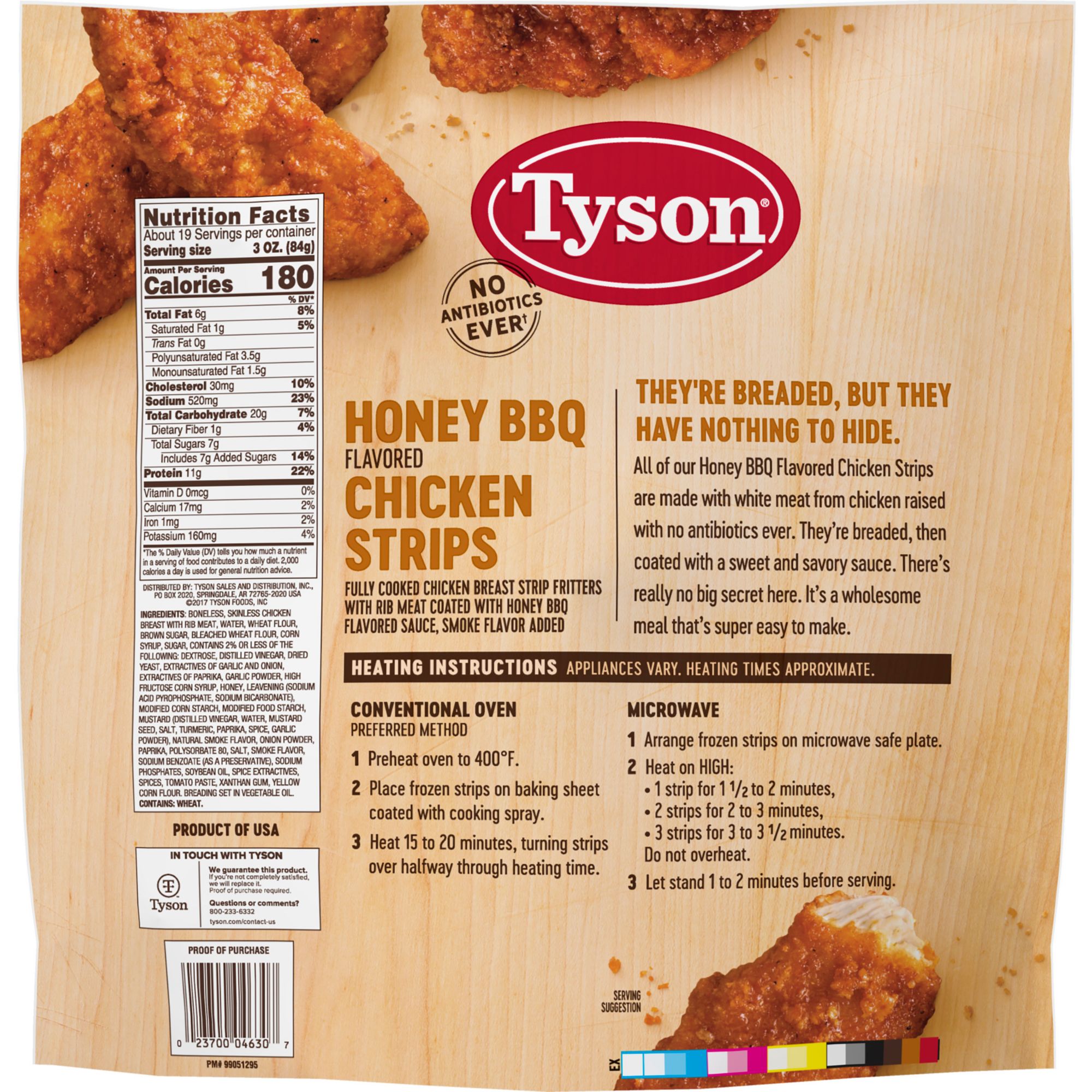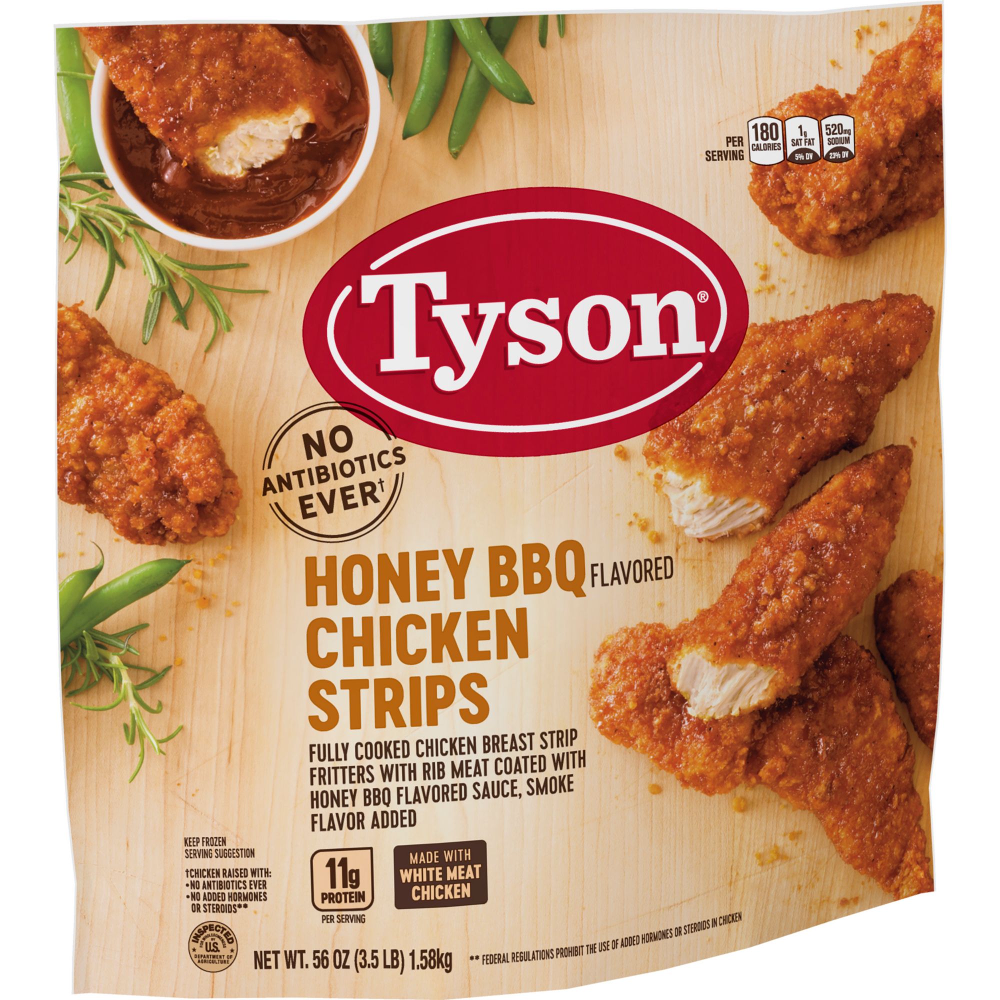 Made with chicken raised with no antibiotics ever, Tyson Fully Cooked Honey BBQ Chicken Strips are a delicious addition to any meal. These chicken strips are made with white meat chicken with no preservatives, then breaded and covered in Honey BBQ sauce made with real honey. With 0 grams of trans fat and 11 grams of protein per serving, these chicken strips are sure to be a hit with the entire family. Fully cooked and ready-to-eat, simply prepare in an oven or microwave and serve with ranch for a protein-packed dinner.