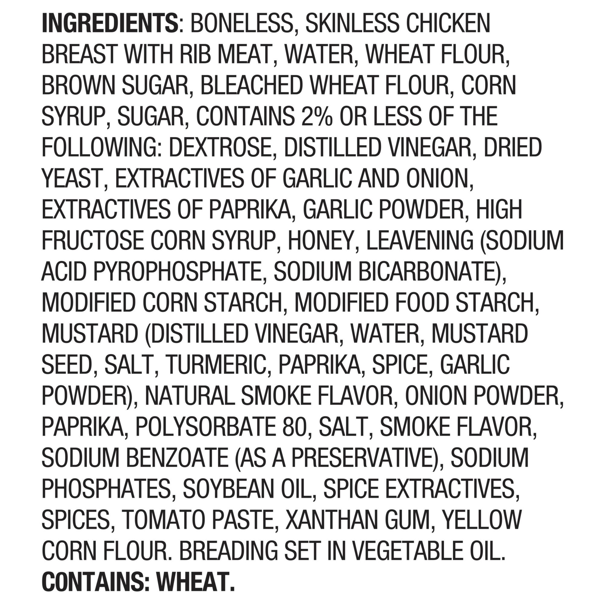 Made with real honey 11g of protein per serving 0g of trans fat per serving No antibiotics ever and no added hormones or steroids Fully cooked and ready-to-eat Product of USA Includes 3.5-lb. frozen fully cooked honey BBQ chicken strips