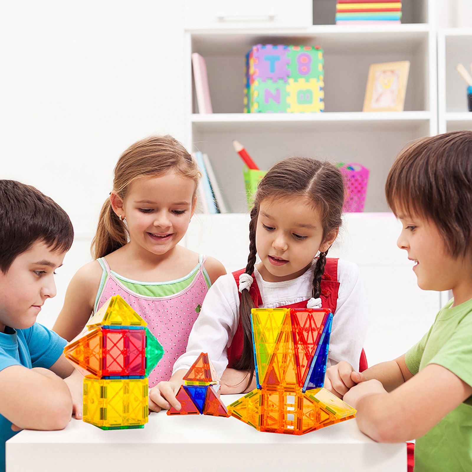 60 pc. set – magnetic tiles in various shapes and colors, plus a vehicle base, provides for 1000's of possibilities to create structures Build what you dream – from castles to camels to skyscrapers to rockets; only your imagination is your limit Less screen time – spark hours of creative play while fostering teamwork and collaboration among kids, all while reducing screen time STEM - designed to help develop STEM skills important for children of all ages Magnetic – each tile has a unique ability to attract magnetically together, even when flipped and from various sides Included wheeled vehicle base has a magnetic platform that can also be built on Contains a carry bag to easily transport pieces Age ranges: 3+ Includes 20 equilateral triangles, 10 right triangles, four isosceles triangles, eight rectangles, seven small squares, six hollow squares, two two-pane windows, two castle battlements, wheeled vehicle base and carrying bag