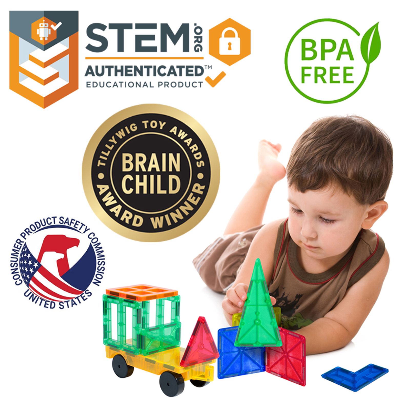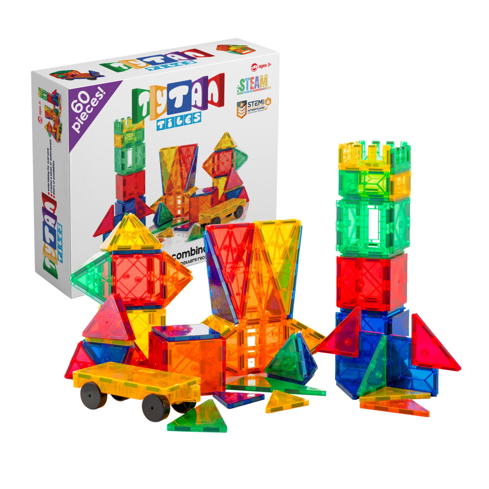 The Tytan Tiles magnetic tile building set helps teach children about creative building through play. Designed with STEM (Science, Technology, Engineering, and Mathematics) in mind, this educational toy helps children learn more about building in 2D and 3D while having fun. The tiles feature magnets along their edges making them easy to snap together and build higher. Plus, a wheeled vehicle base is included so children can build on top of this base for a movable 3D structure. The colorful magnetic tiles along with the vehicle base, total 120 pc., 120 pc. Set : magnetic tiles in various shapes and colors provides for 1000's of possibilities to create structures; plus it includes a wheeled vehicle base and a carrying bag STEM Certified: Tytan Tiles has been authenticated by the STEM.org Organization as an educational product because of how kids can learn various skills while they play Build What You Dream: from castles to trees, skyscrapers to rockets, cars to houses; only your imagination is your limit Less Screen Time: spark hours of creative play while fostering teamwork and collaboration among kids; all while reducing screen time More Than Just Fun: use the tiles as an educational tool to develop vital skills including: shapes, colors, pattern recognition, magnetic principles, motor skills, problem solving, 3D design, architecture and more magnetic: each tile has a unique ability to attract magnetically together, even when flipped and from various sides child safe: Tytan products go through rigorous testing to ensure there are no harmful materials such as lead, phthalates or any other heavy metals ensuring products meet the highest standard of safety for children. STEM.org Authentication Seal: approval means that the product meets the requirements set forth by the number one institution for STEM-related products. The product goes through a multi-level inspection confirming that this item contributes to STEM development while maintaining a fun and safe environment for children to use their imagination.