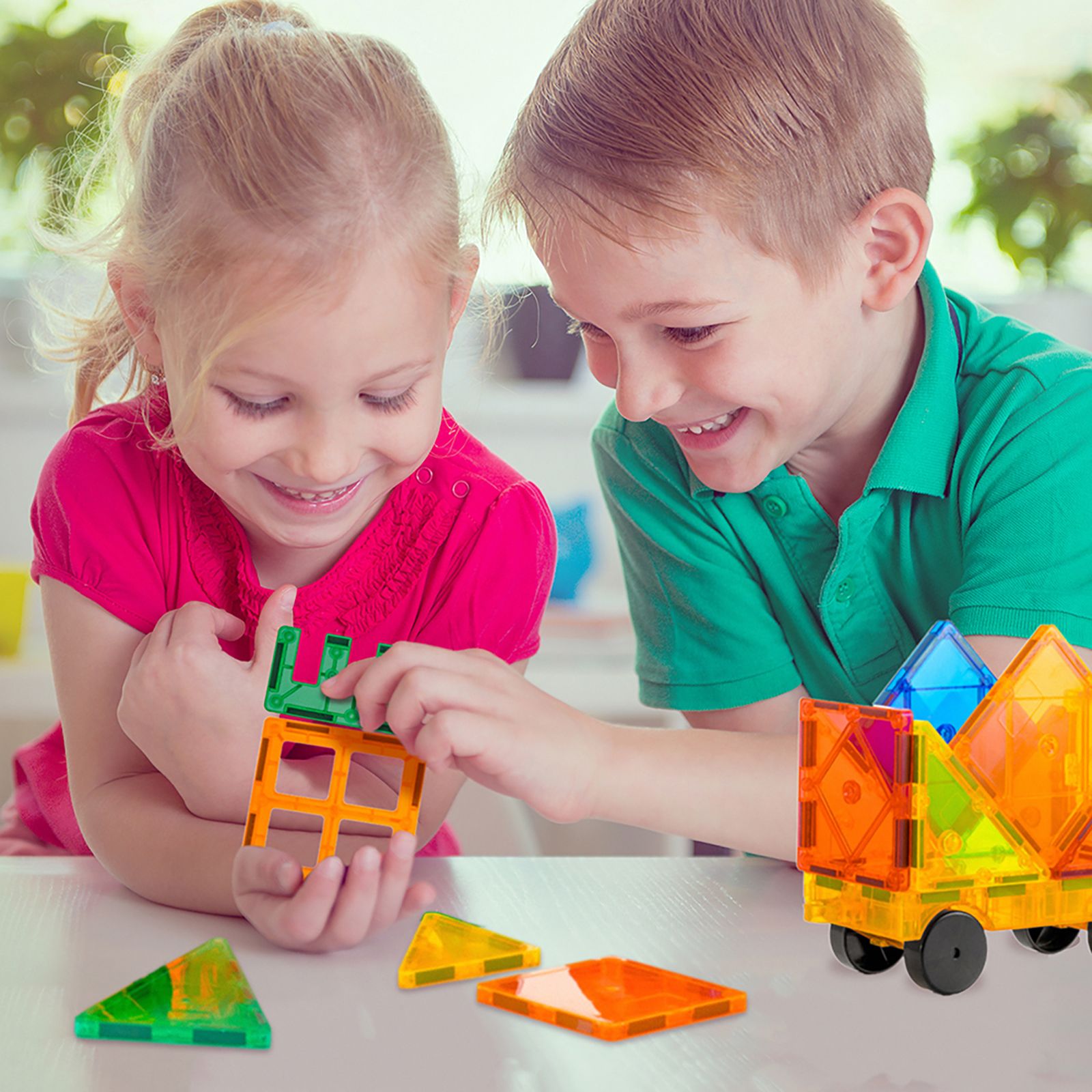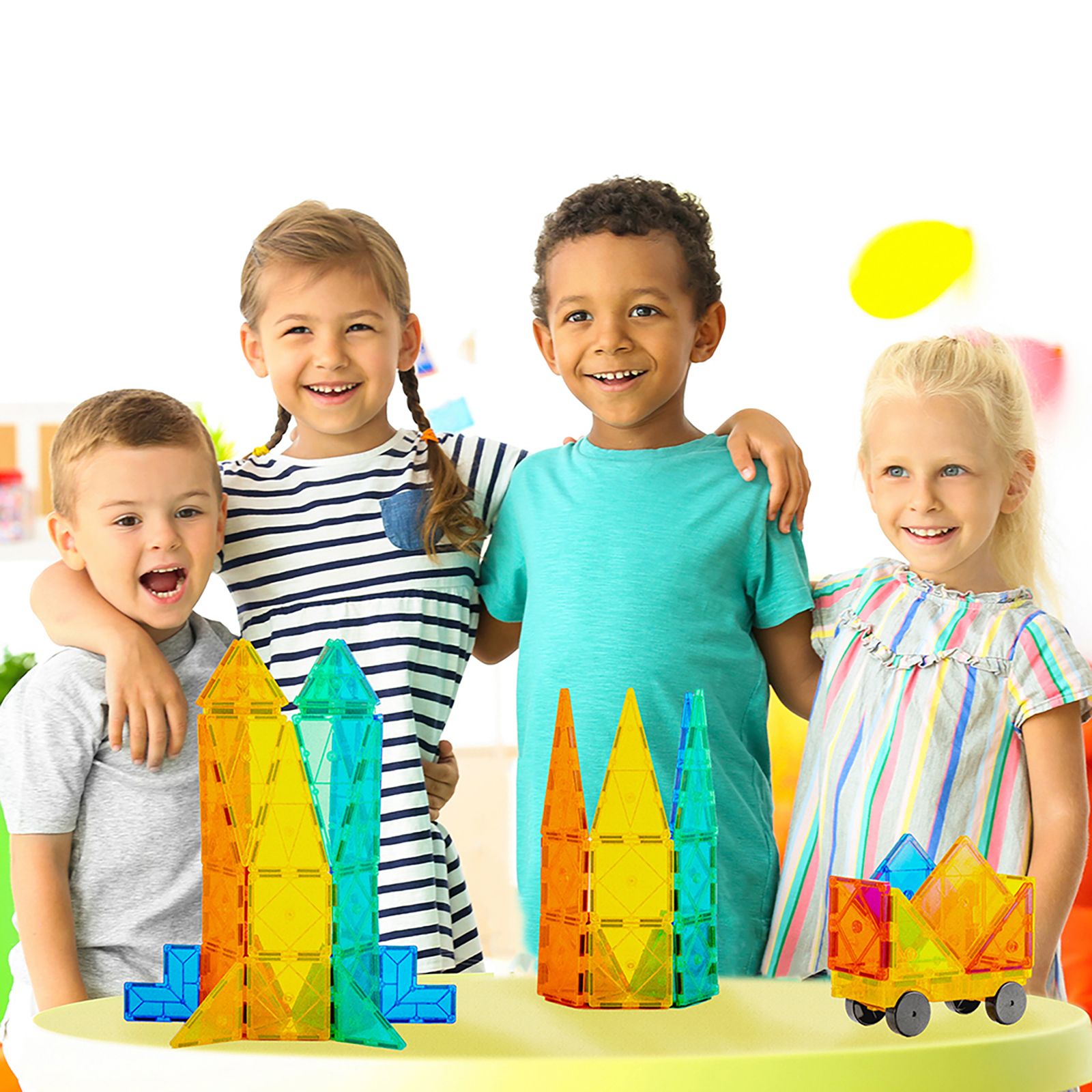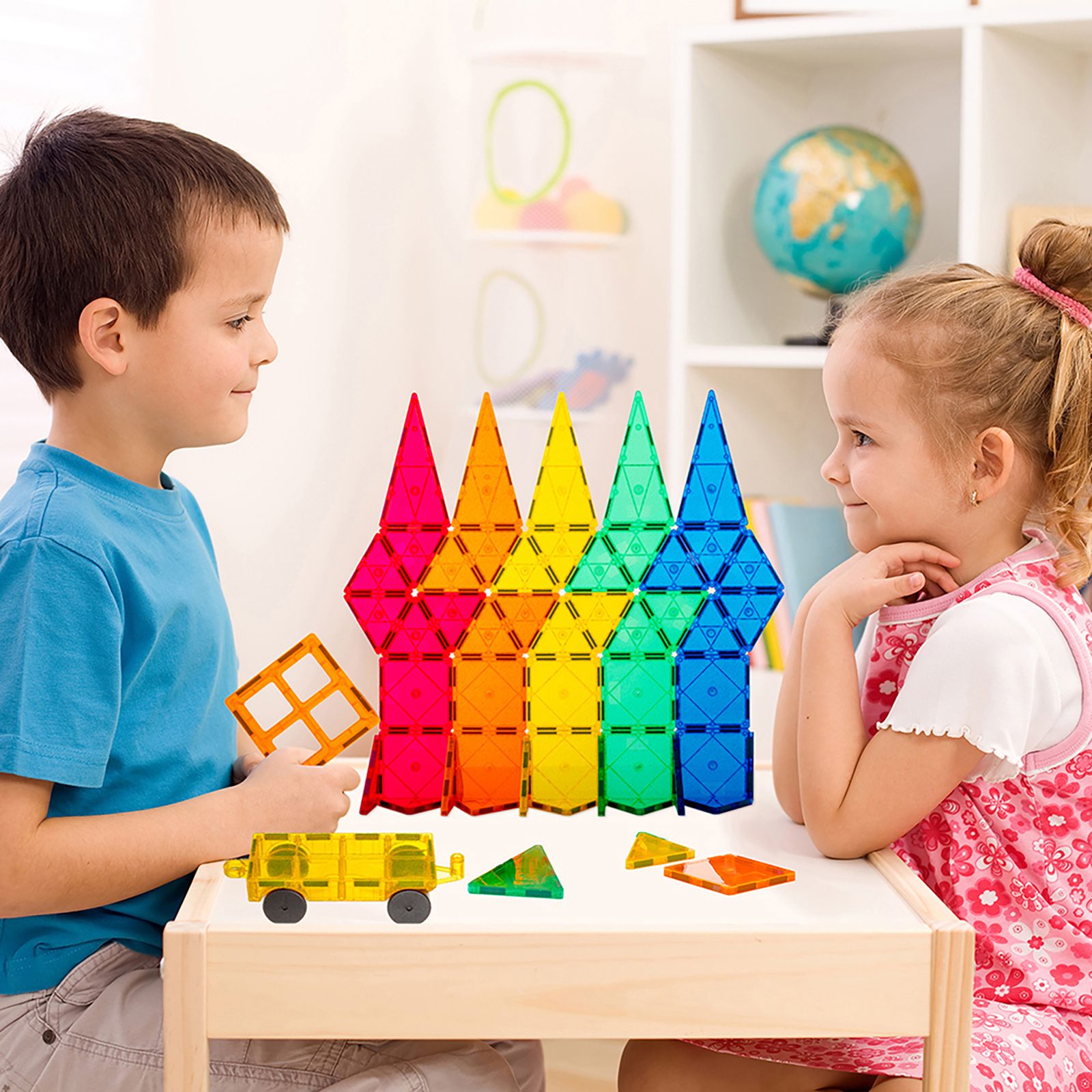 60 pc. set – magnetic tiles in various shapes and colors, plus a vehicle base, provides for 1000's of possibilities to create structures Build what you dream – from castles to camels to skyscrapers to rockets; only your imagination is your limit Less screen time – spark hours of creative play while fostering teamwork and collaboration among kids, all while reducing screen time STEM - designed to help develop STEM skills important for children of all ages Magnetic – each tile has a unique ability to attract magnetically together, even when flipped and from various sides Included wheeled vehicle base has a magnetic platform that can also be built on Contains a carry bag to easily transport pieces Age ranges: 3+ Includes 20 equilateral triangles, 10 right triangles, four isosceles triangles, eight rectangles, seven small squares, six hollow squares, two two-pane windows, two castle battlements, wheeled vehicle base and carrying bag