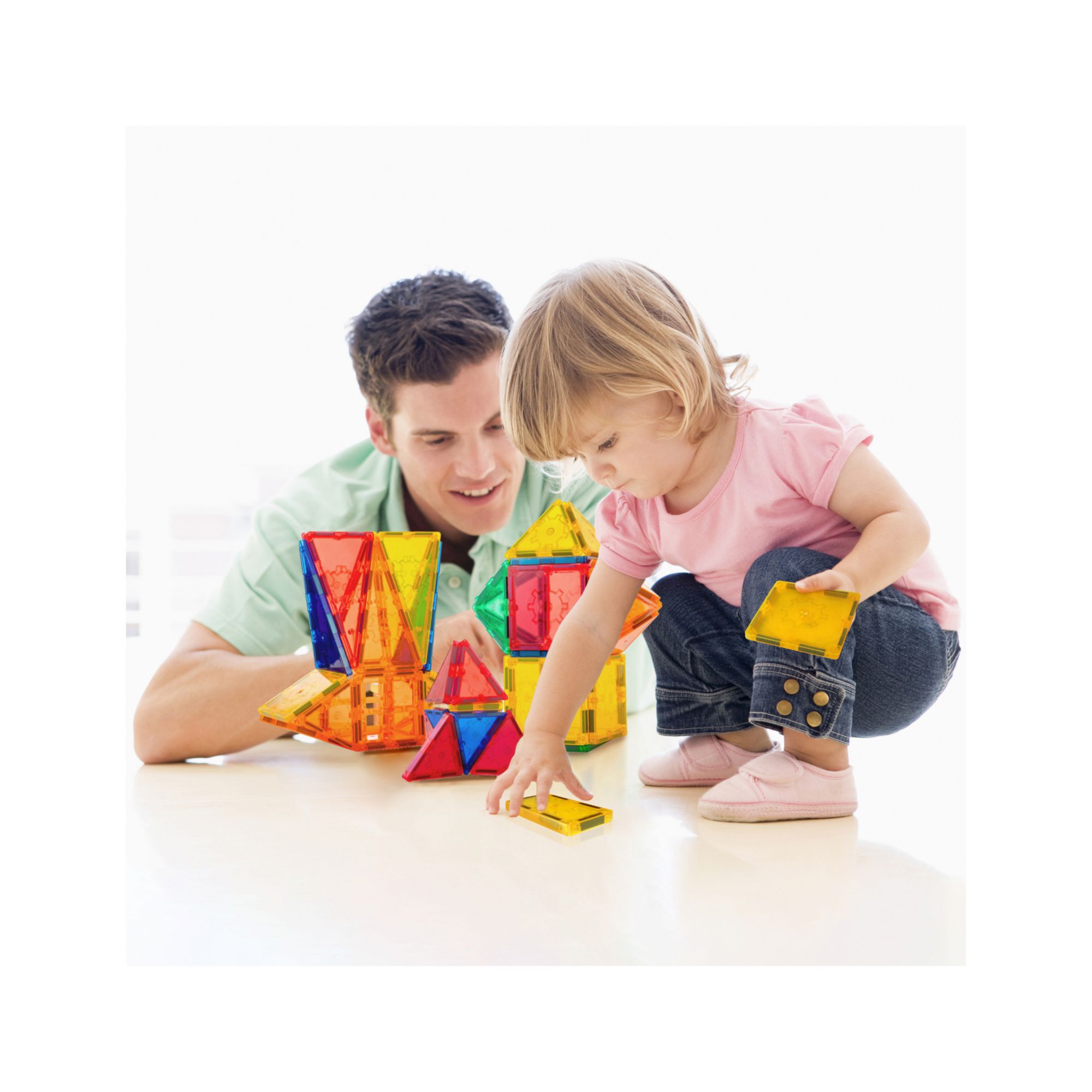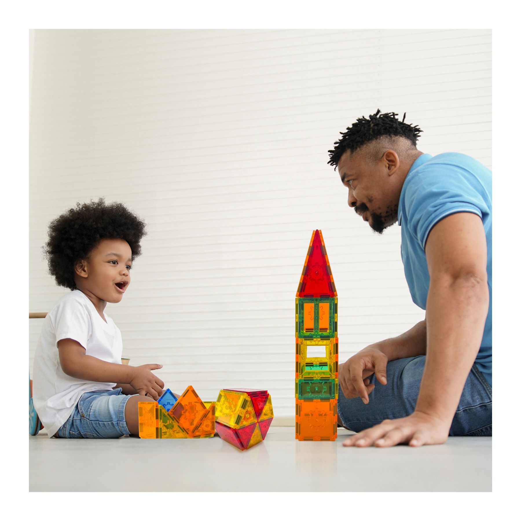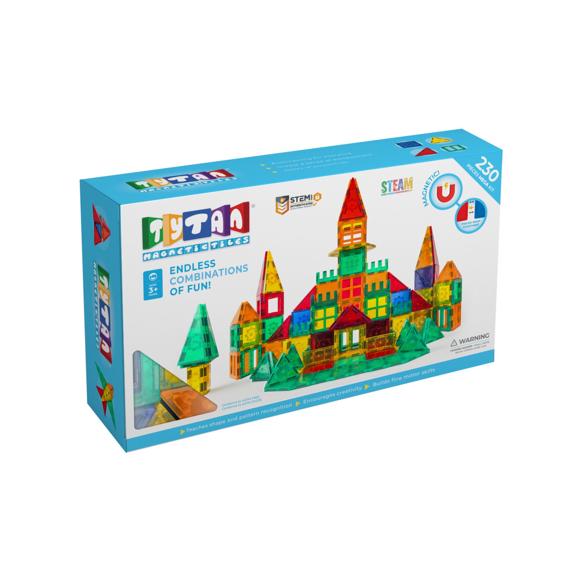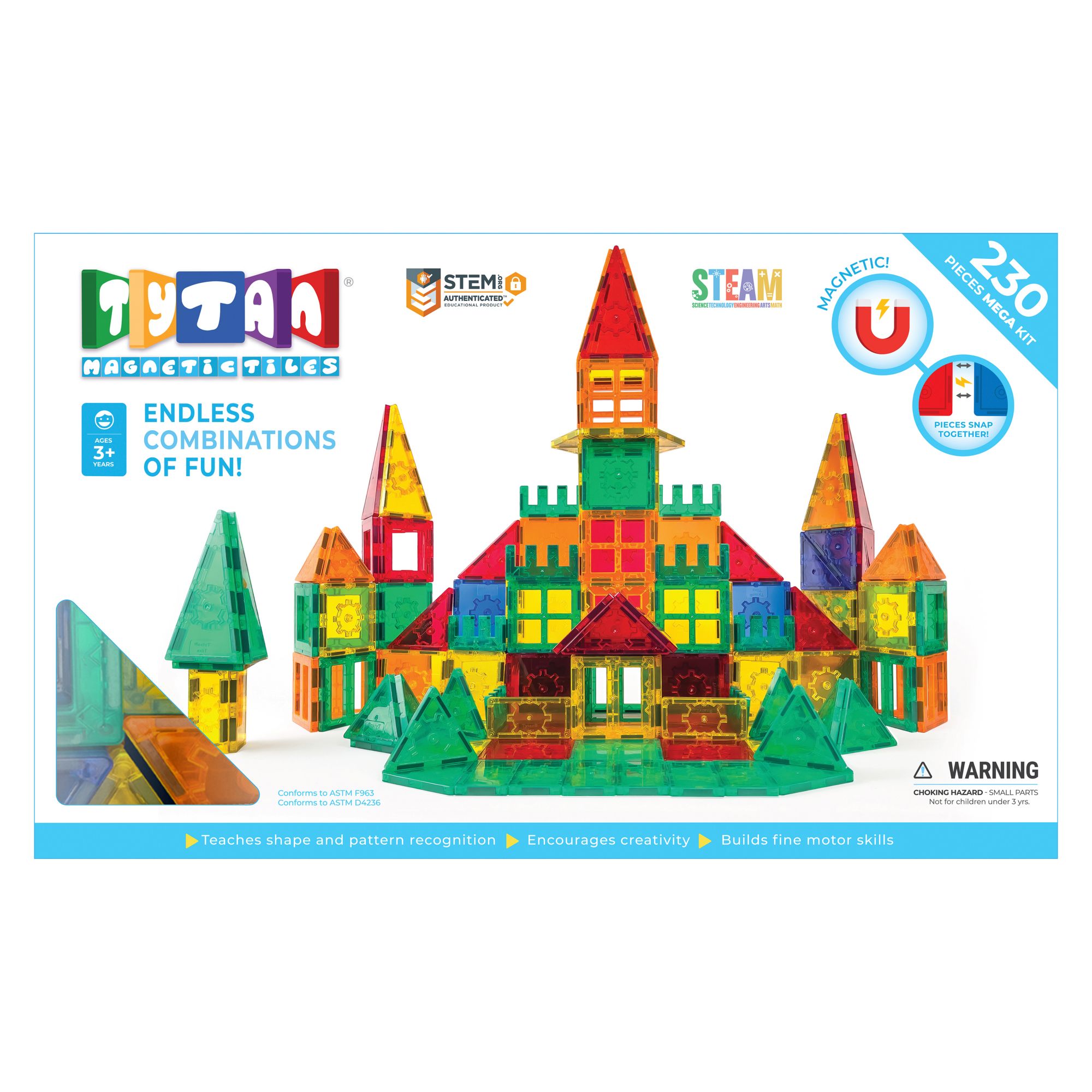 230 tiles for 1000s of supersized creations – With 230 tiles of various shapes and sizes, kids can build anything their mind imagines through innovative play. With a simple click, these magnetic learning tiles can bring to life 1000s of different creations and dreams Striking colors & shapes for big dreams – This amazing set features a wide variety of striking colors and shapes including triangles, squares, rectangles and more! Tiles can be crafted into large 3D buildings, castles, and various vehicles. Children will get to explore their imagination and fine-tune their motor skills Educational stem fun – This award-winning set is certified by STEM.org as an educational tool to help develop STEM (Science, Technology, Engineering, and Mathematics) skills. Kids will get work with shapes, pattern recognition, magnetic principles, and architectural building Highest level of safety certifications – The 230-piece kit from Tytan Tiles is made from environmentally friendly materials, is parent-tested, and has the highest level of CPSA child safety certifications Includes tiles in various colors including: 22 Hollow Squares, 45 Squares, 10 Four Pane Window, 15 Two Pane Window, 15 Tall Triangles, 50 Smal Triangles, 35 Right Triangles, 20 Rectangles, 18 Castle Embattlements & Workbook