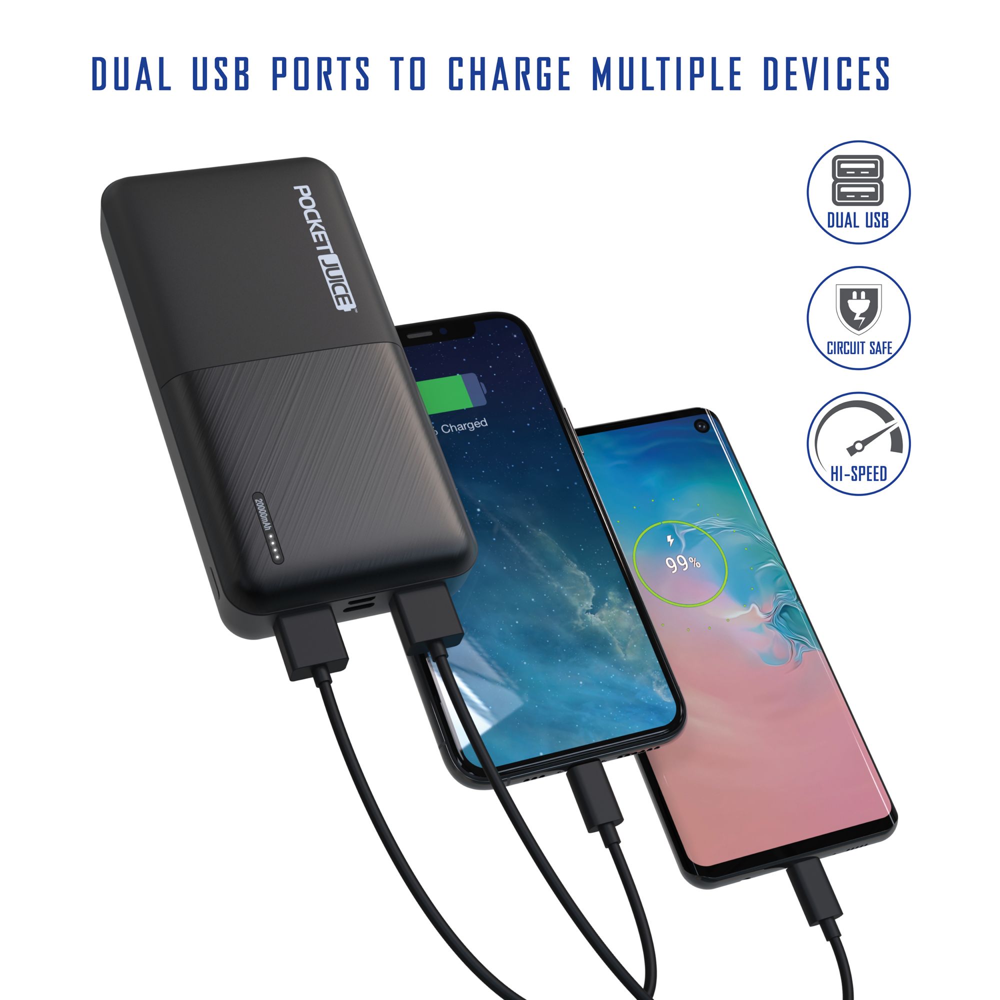 The Pocket Juice Slim Pro is the perfect portable charger for powering your USB devices on the go, everywhere from vacations and business trips to the daily commute. This slim, lightweight power bank comes pre-charged and equipped with a hard shell for durability and a comfortable grip. Its powerful 20,000mAh lithium-polymer battery charges smartphones multiple times and features four LED battery status indicators for greater peace of mind. Wherever you go, the Pocket Juice Slim Pro provides a fast, durable, and streamlined charging experience you can rely on.