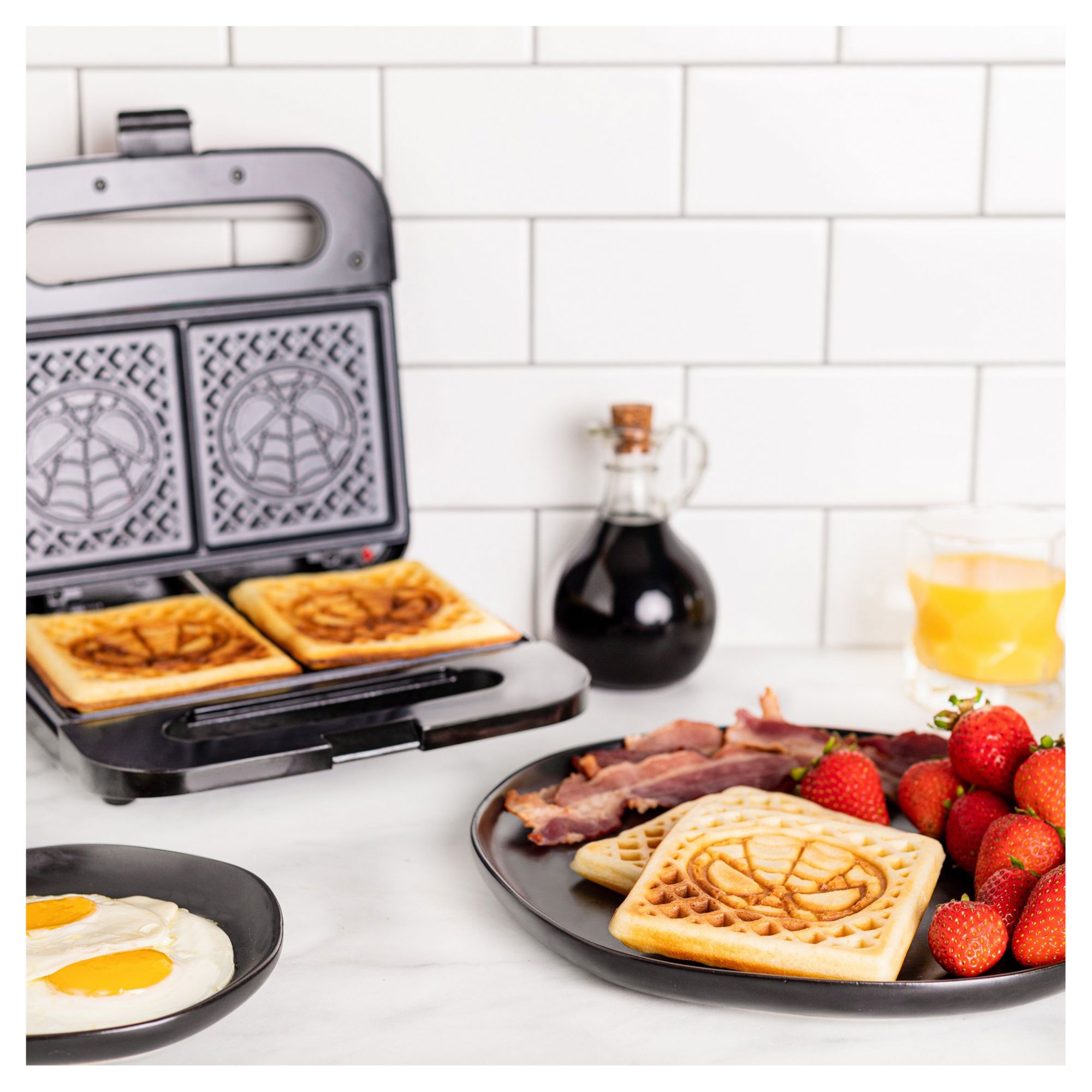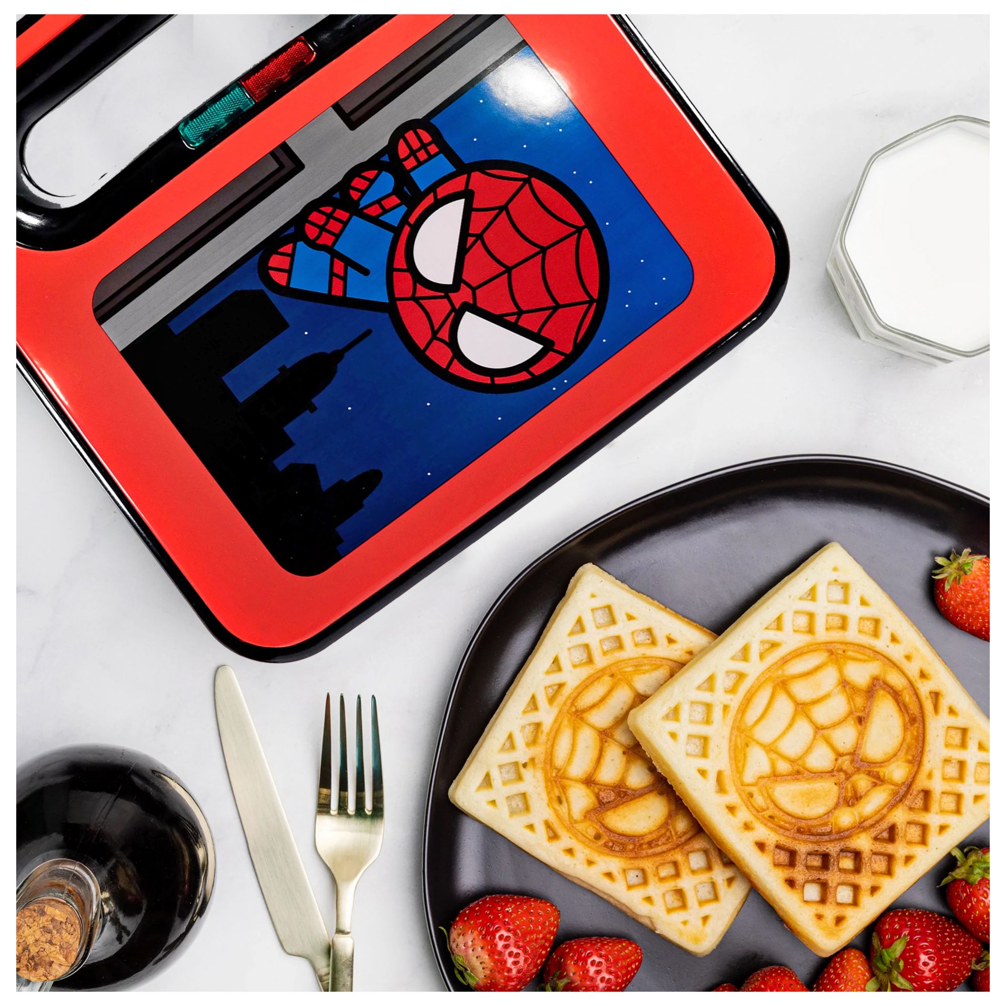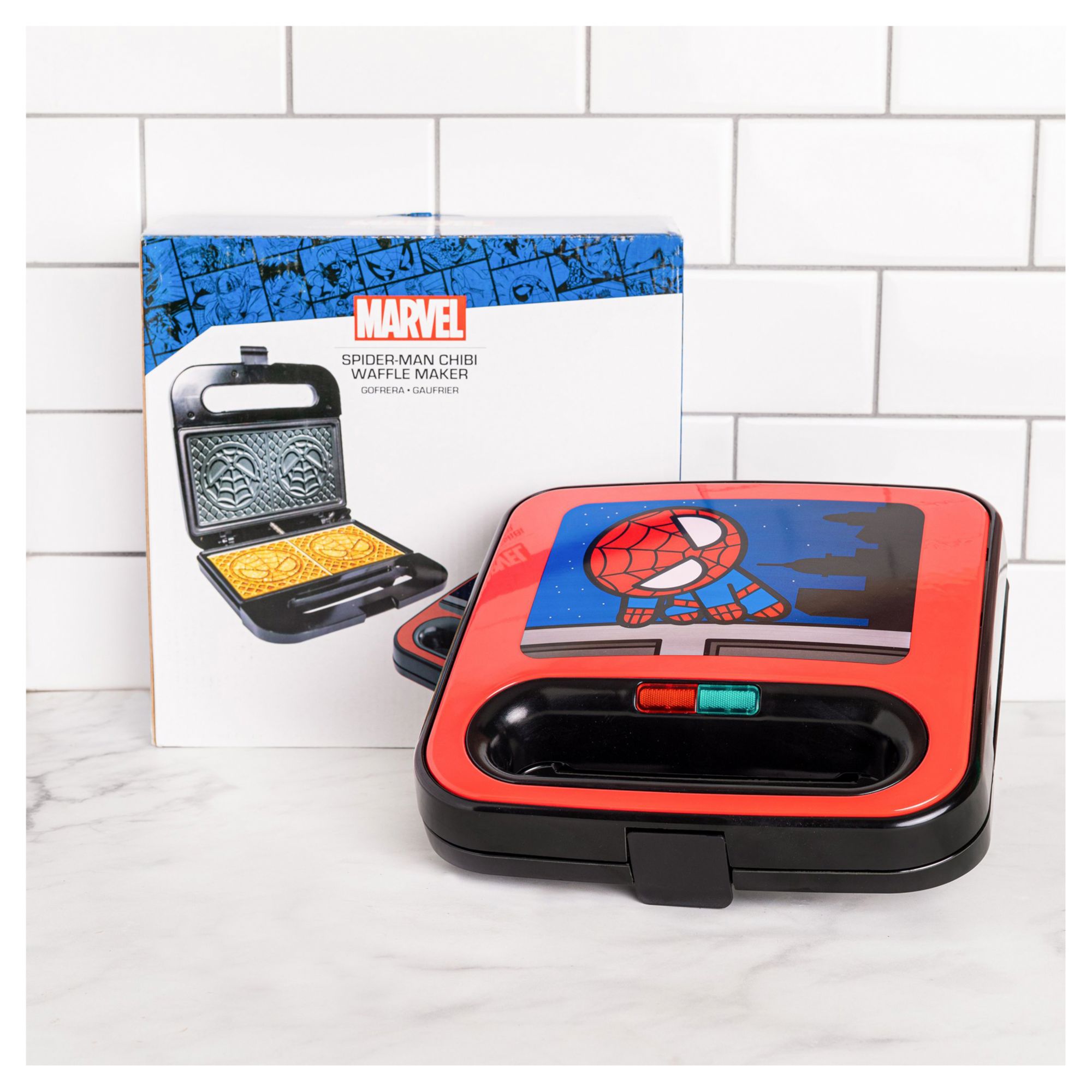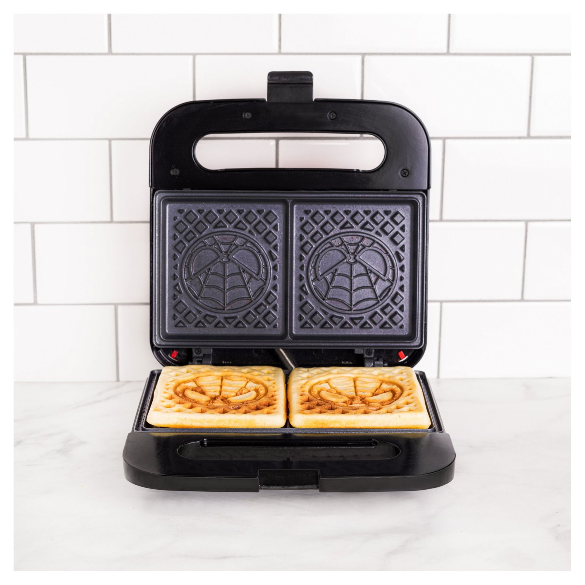CHIBI SPIDEY WAFFLE MAKER – Made two square Spider-Man waffles at home; Pour in the batter, lower the lid, and before you know it, there's Spiderman waffles, ready for butter and syrup FUN KITCHEN DECOR – Spidey artwork on the lid is sure to bring drama to any kitchen landscape MAKES A GREAT PRESENT – Spider-Man waffles are the perfect way to bring pop culture to any hero's kitchen DETAILS - UL (r) listed, with non-stick, wipe-clean waffle plates. Designed for 120v systems in the US, Canada, and Mexico OFFICIALLY LICENSED BY LUCASFILM AND MARVEL Includes one waffle maker