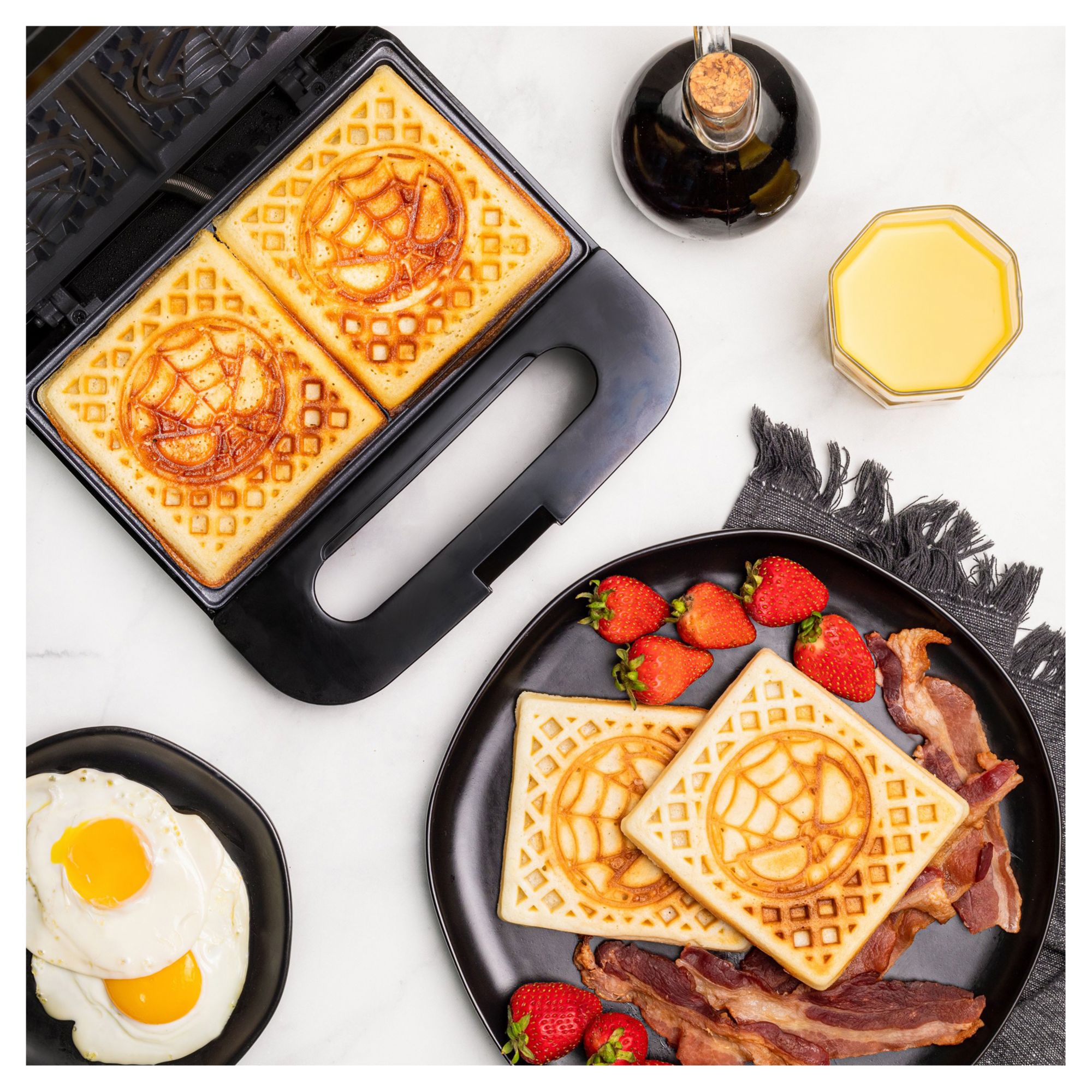 All Marvel fans will love the Spiderman Waffle Maker. Take breakfast to the Marvel Universe with this non-stick waffle maker. It makes tasty waffles your way, with five temperature settings that let you make waffles quickly and easily. Whether you like them brown and crispy or tender and golden, the regulated thermostat and weighted lid ensure even heating, while the dual indicator lights make adding batter and removing the finished product easy. More than just a waffle iron, this can also be used to make eggs, brownies, cakes, quesadillas or even as a Spidey sandwich press. Waffle maker is compact, easy to use and easy to clean.