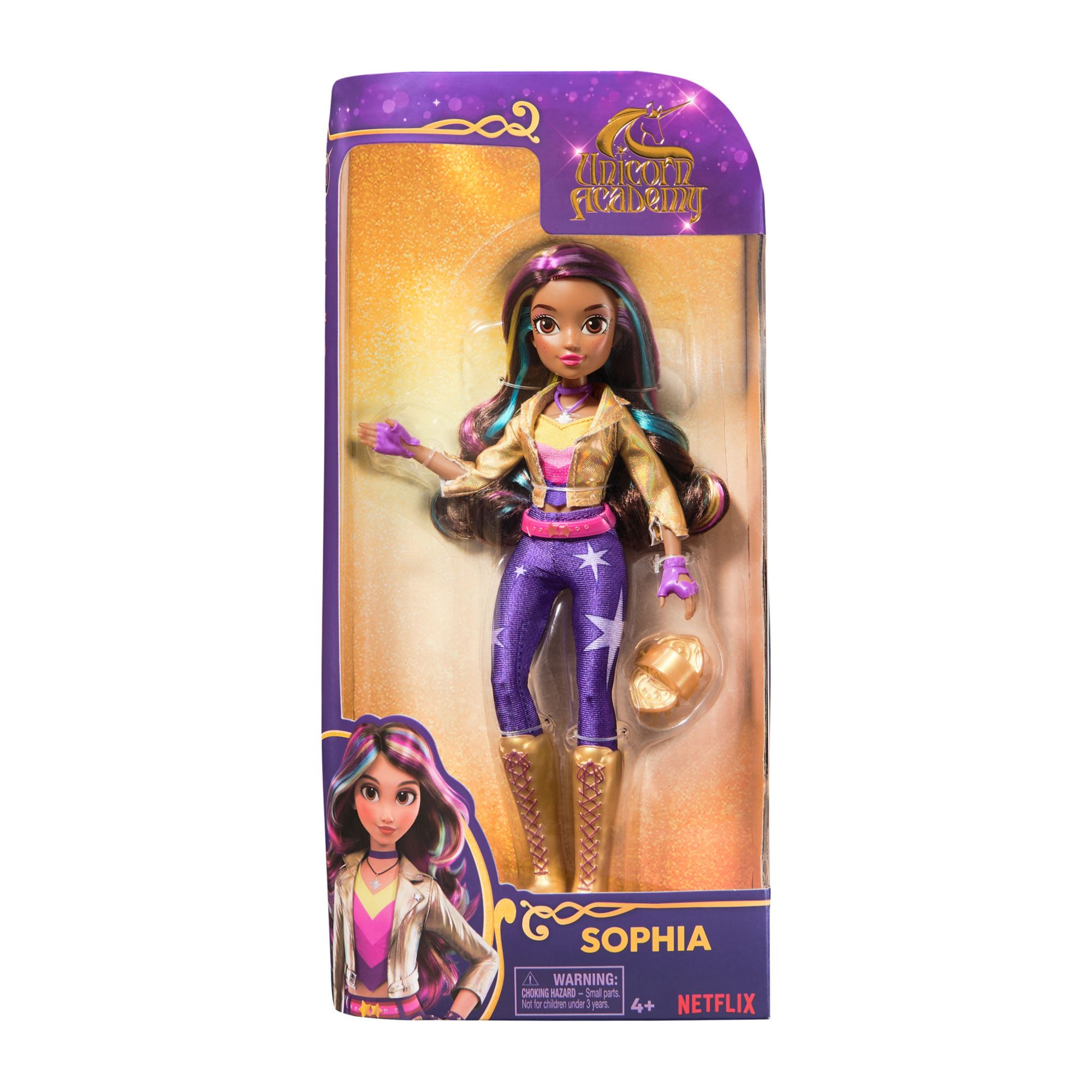 Fun unicorn gifts, birthday gifts and gifts for any occasion create enchanting Unicorn Academy adventures at home with Sophia, Ava, and Isabel fashion dolls. Inspired by the Netflix animated show and best-selling book series where friendship reins, these 9.5'' dolls for girls bring the characters to life. Beautifully detailed from head to toe, each character’s rebellious and adventurous personality comes through in their brushable rainbow highlighted hair (styling accessory included) and their signature unicorn rider outfit, rainbow top and pants with light magic markings, gold jacket, lace up boots, gloves, belt, and necklace doll accessories. With nine points of articulation, pose your character as you protect unicorn island and its magic, and ride into adventure with her unicorn, rainbow light-up wild star. The magical bonds between unicorn academy students and their unicorns will spark endless imaginative storytelling. For more ways to experience Unicorn Academy with your favorite characters, look for Sophia, Ava and Isabel dolls and their unicorns (each sold separately), and expand your world. For kids who enjoy unicorns and horse toys, dolls and accessories, doll house play, collectibles, plush toys, and more, unicorn academy toys are fun birthday gifts for girls or any occasion. Bring home the magic of Unicorn Academy with the doll.