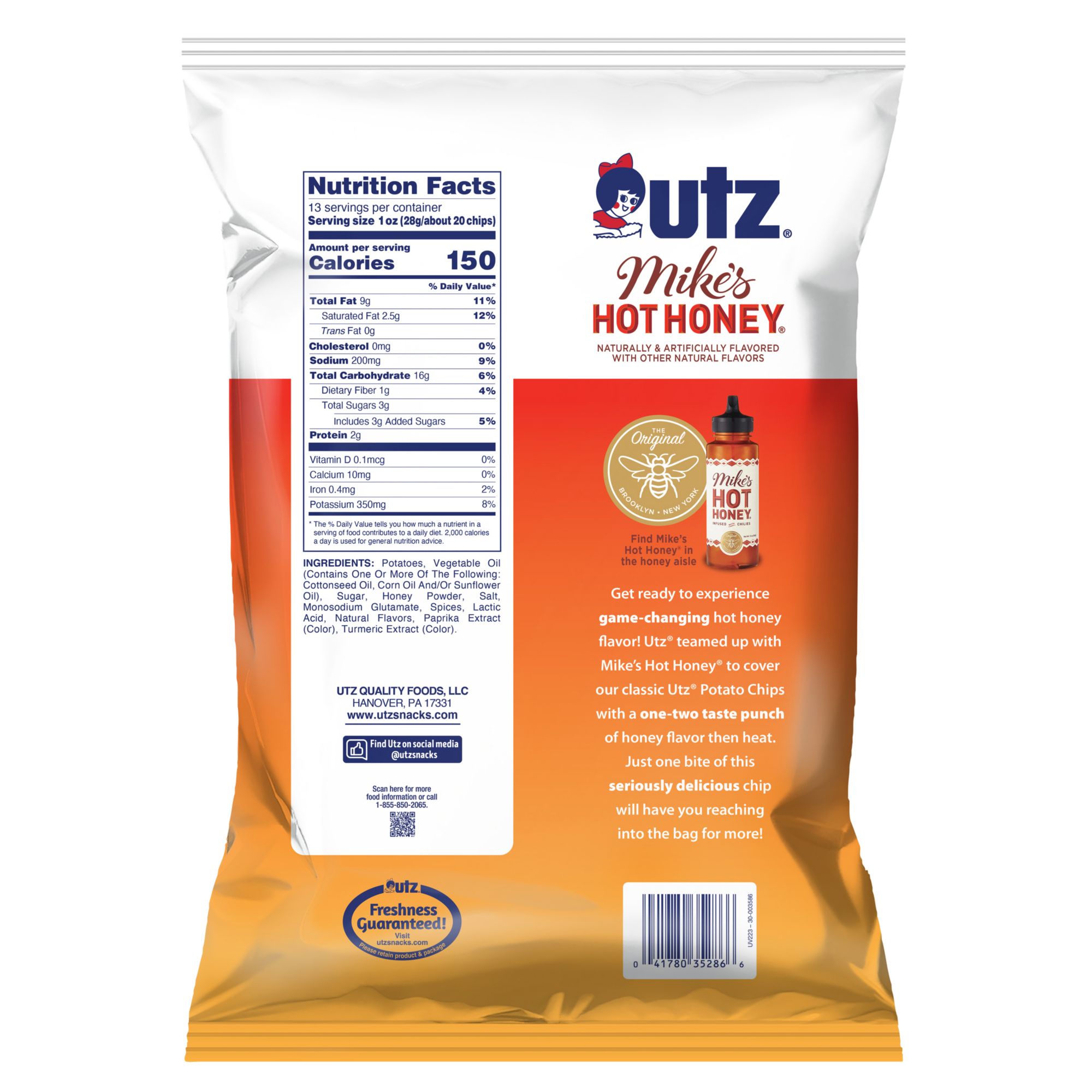 Get ready to experience game-changing hot honey flavor! Utz teamed up with Mike's Hot Honey to cover their classic Utz potato chips with a one-two taste punch of honey flavor then heat. Just one bite of this seriously delicious chip will have you reaching into the bag for more! Hot Honey is a strong flavor created by Mike's Hot Honey, born in Brooklyn, NYC. Utz's founders, Bill & Salie Utz, thought snacks should be better. They thought snacks should be made from clean, simple ingredients, minimally processed to bring out the natural flavor of farm-grown potatoes. The Utz story began with Bill and Salie who started making and selling potato chips in 1921. Now Utz is publicly traded on the New York Stock Exchange.