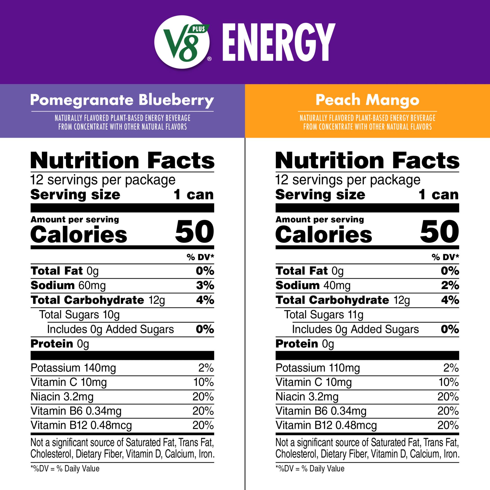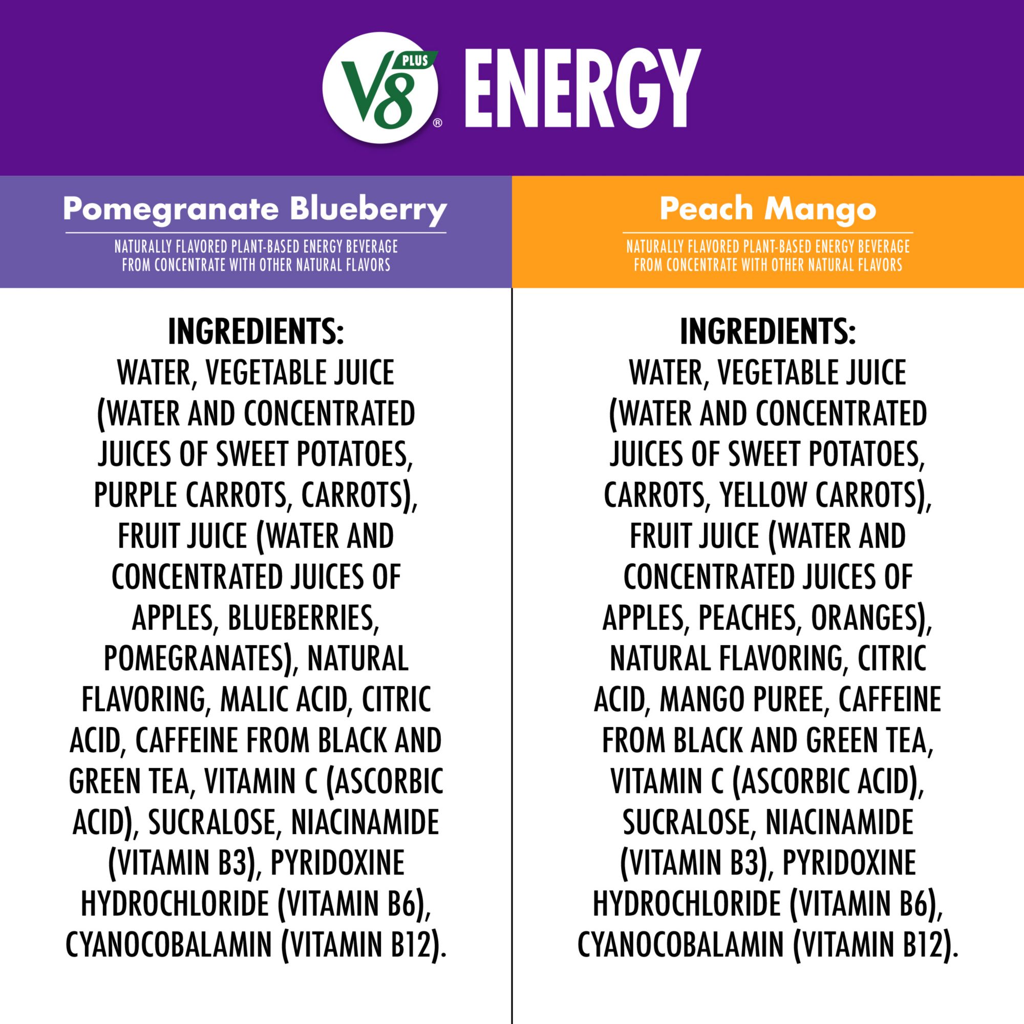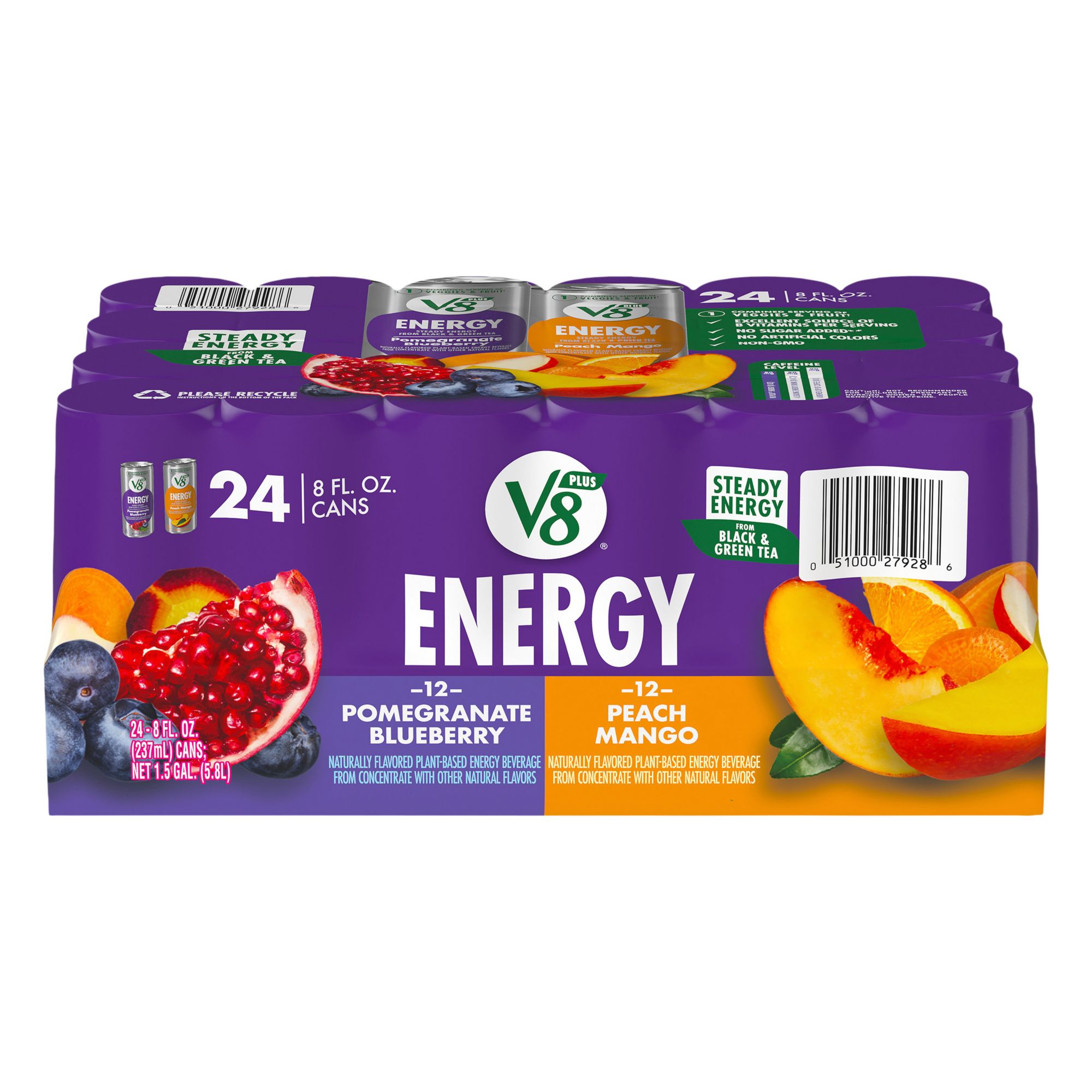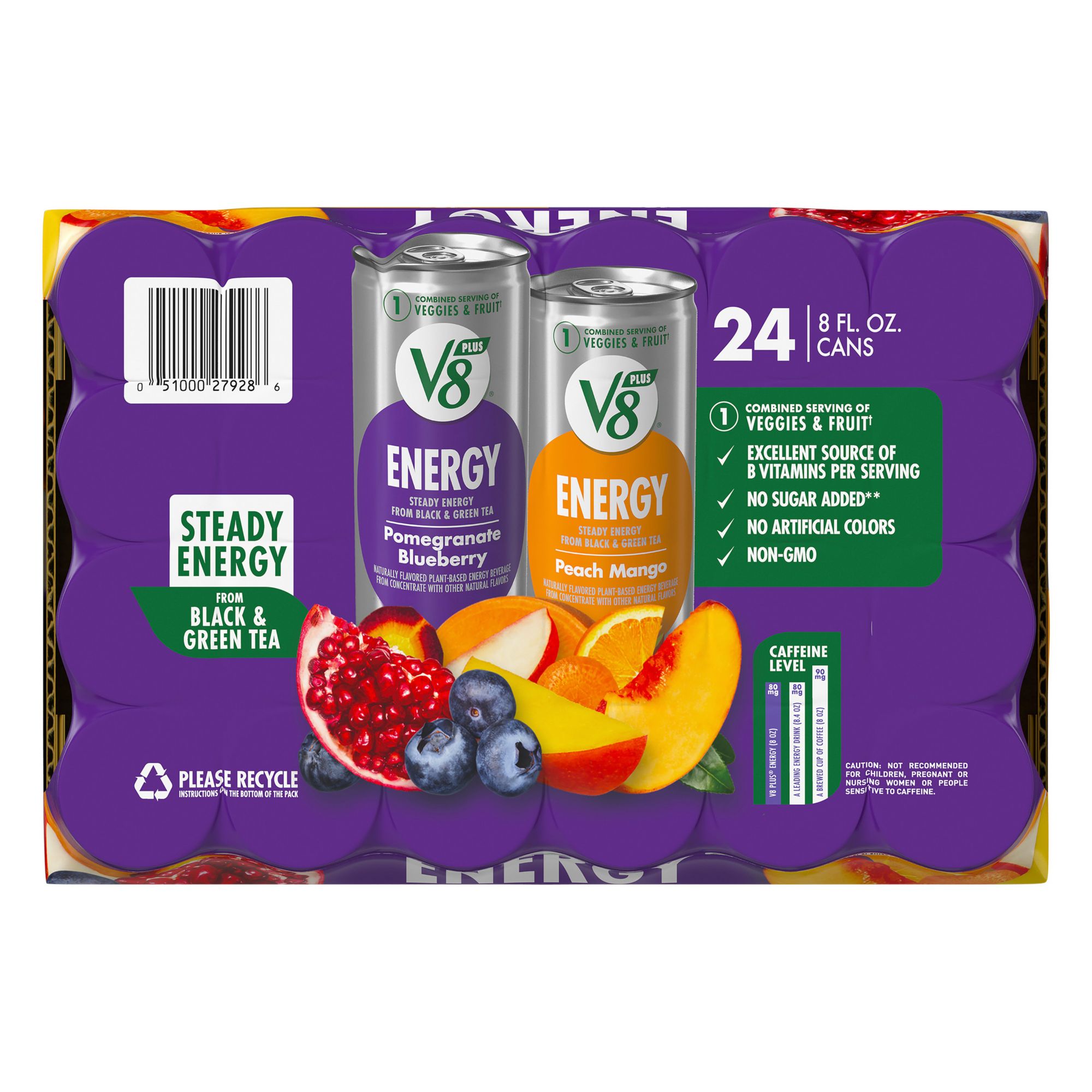 Experience the power of V8 +Energy: Quench your thirst and fuel your body with the V8 +Energy Variety Pack. This pack features two delectable flavors; V8 +Energy Pomegranate Blueberry and V9 +Energy Peach Mango. Crafted from a blend of fruits, vegetables, and tea, V8 +Energy offers a healthy energy drink option. With the same caffeine content as leading energy drinks (80mg), it provides a steady source of energy without compromising your health. A nutritious addition to your diet: V8 +Energy can be seamlessly integrated into any well-balanced diet for an invigorating boost and an ideal pick-me-up. Sourced from natural black and green tea, the caffeine in V8 +Energy is complemented by no added sugars. This effervescent energy drink includes one combined serving of veggies and fruit, making it a nutritious and delicious choice. Deliciously infused flavors: Experience the unique blend of sweet potato juice and apple juice infused with succulent fruit in two delightful flavors of V8 +Energy. Each can is not only bursting with flavor but also rich in vitamin B, enhancing its nutritional value. Moreover, V8 +Energy contains no colors from artificial sources, ensuring its quality and purity. Perfect for any time of the day: Whether you need a morning kickstart, a midday energy boost, or a late-night pick-me-up, V8 +Energy is your go-to drink. Enjoy the refreshing, energizing, and healthful benefits of V8 +Energy at any time of the day!