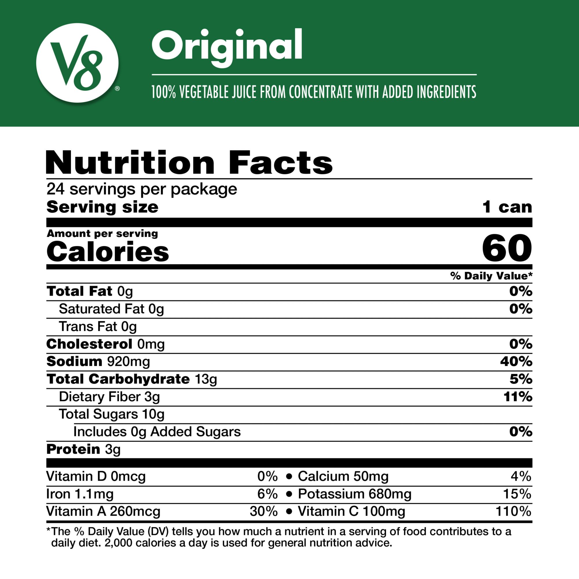 Savor the plant based goodness of V8 Original 100% Vegetable Juice. A satisfying alternative to other juices, the original V8 juice is made with concentrated tomato juice along with the juices of seven other vegetables. The result is a 100% juice with a distinctly rich, savory flavor. Each 11.5 fl. oz. can contains 2.5 servings of vegetables and is an excellent source of Vitamins A and C. Our veggie juice is also gluten free and non GMO with no artificial colors.