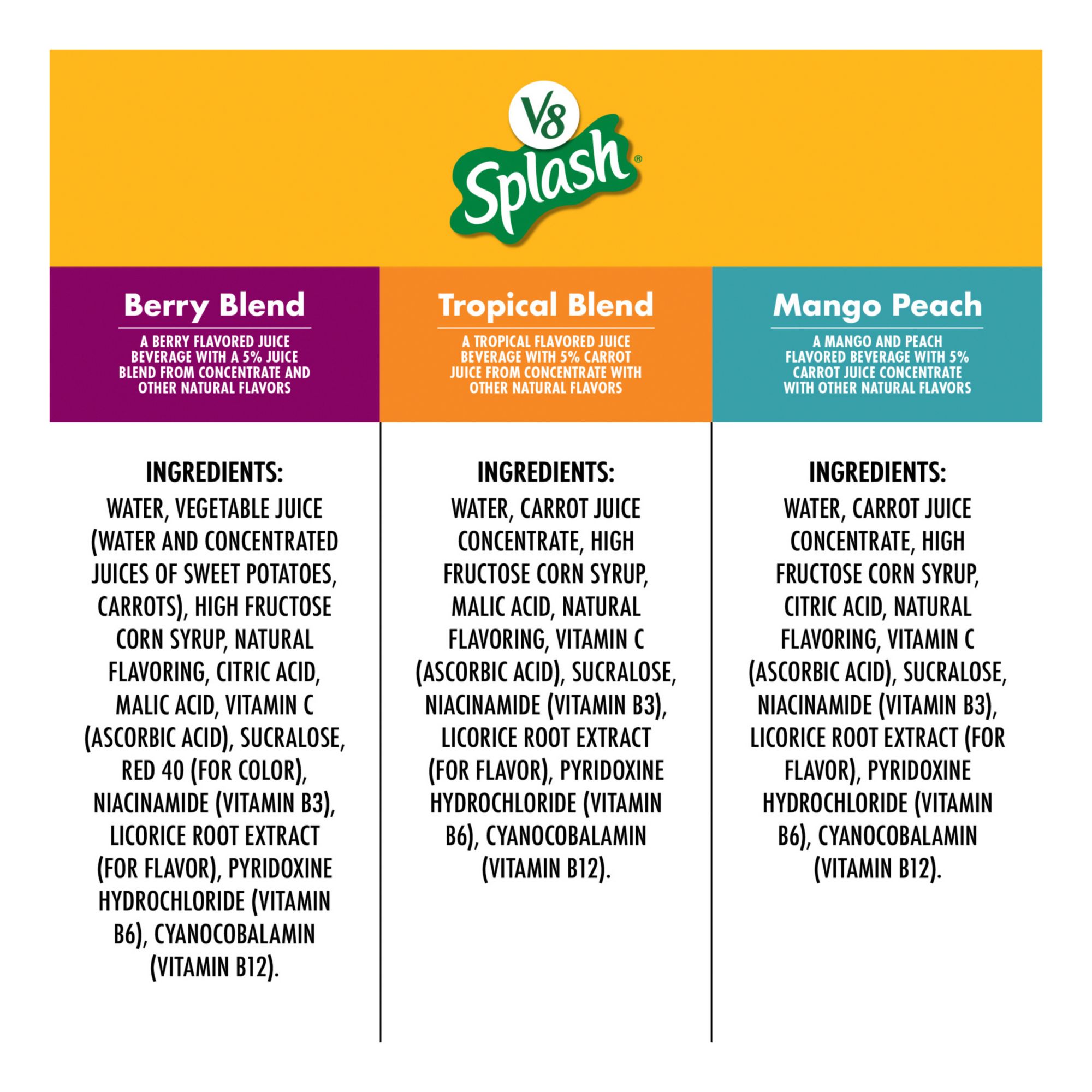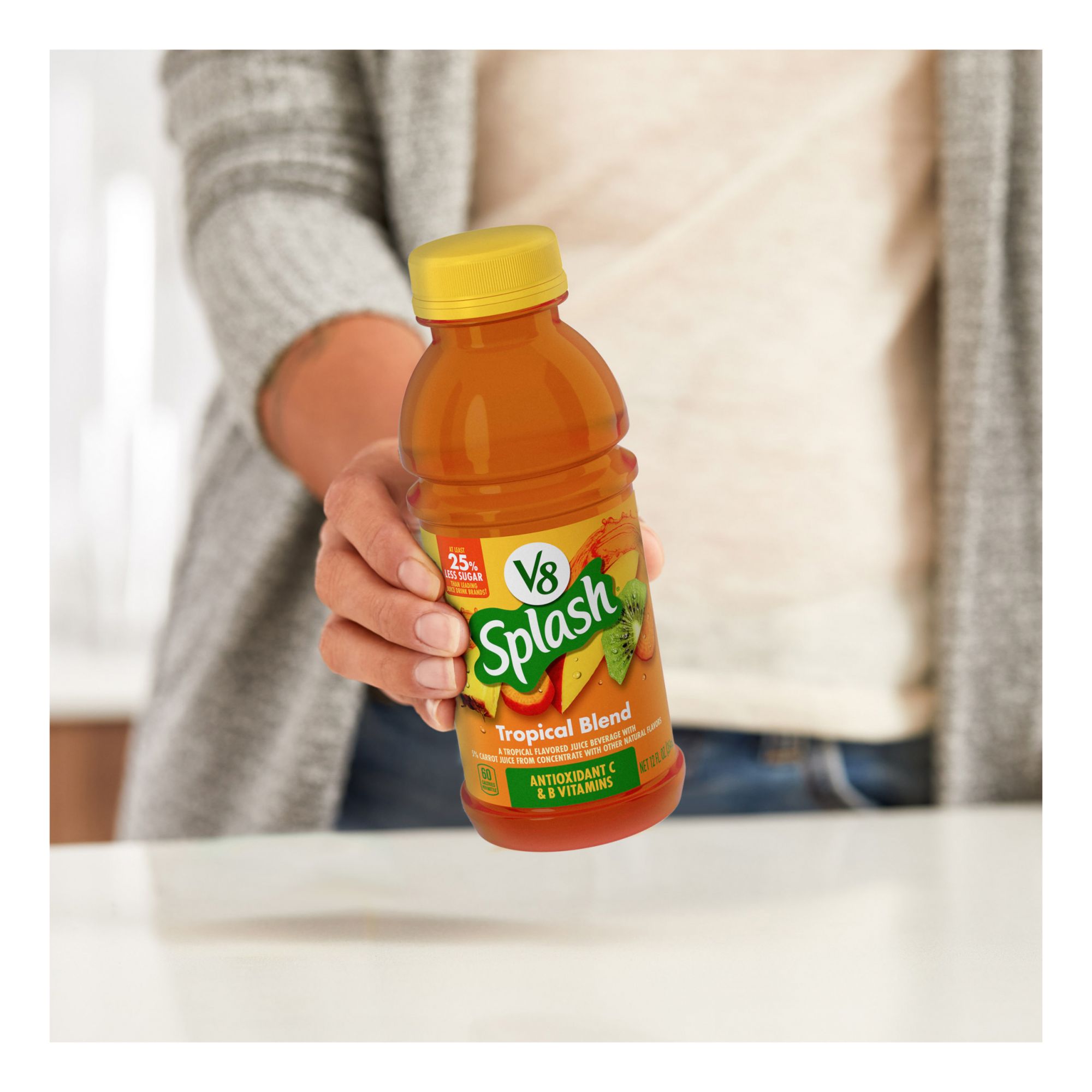 Quench your thirst with the refreshing taste of V8 Splash Berry Blend, Tropical Blend and Mango Peach Flavored Juice Beverages. Each 5% juice blend is made from the concentrated juices of vegetables with the natural flavors of fruit for a tasty drink with a satisfying splash of delicious fruit flavor. V8 Splash juice beverage contains 25% less sugar than leading juice drink brands,* plus Antioxidant C and B Vitamins. It’s also gluten free and fat free. With only 60-70 calories per serving, V8 Splash is a lower calorie alternative to orange juice and apple juice. Serve this fruit flavored drink in the morning or as part of an after-school snack. V8 Splash is also delicious in homemade smoothies and makes a great mocktail or cocktail mixer. (*Per 12 fl. oz.: Leading shelf stable brands, 26g; Splash Berry Blend, 13g; Splash Tropical Blend, 14g; Splash Mango Peach, 14g)