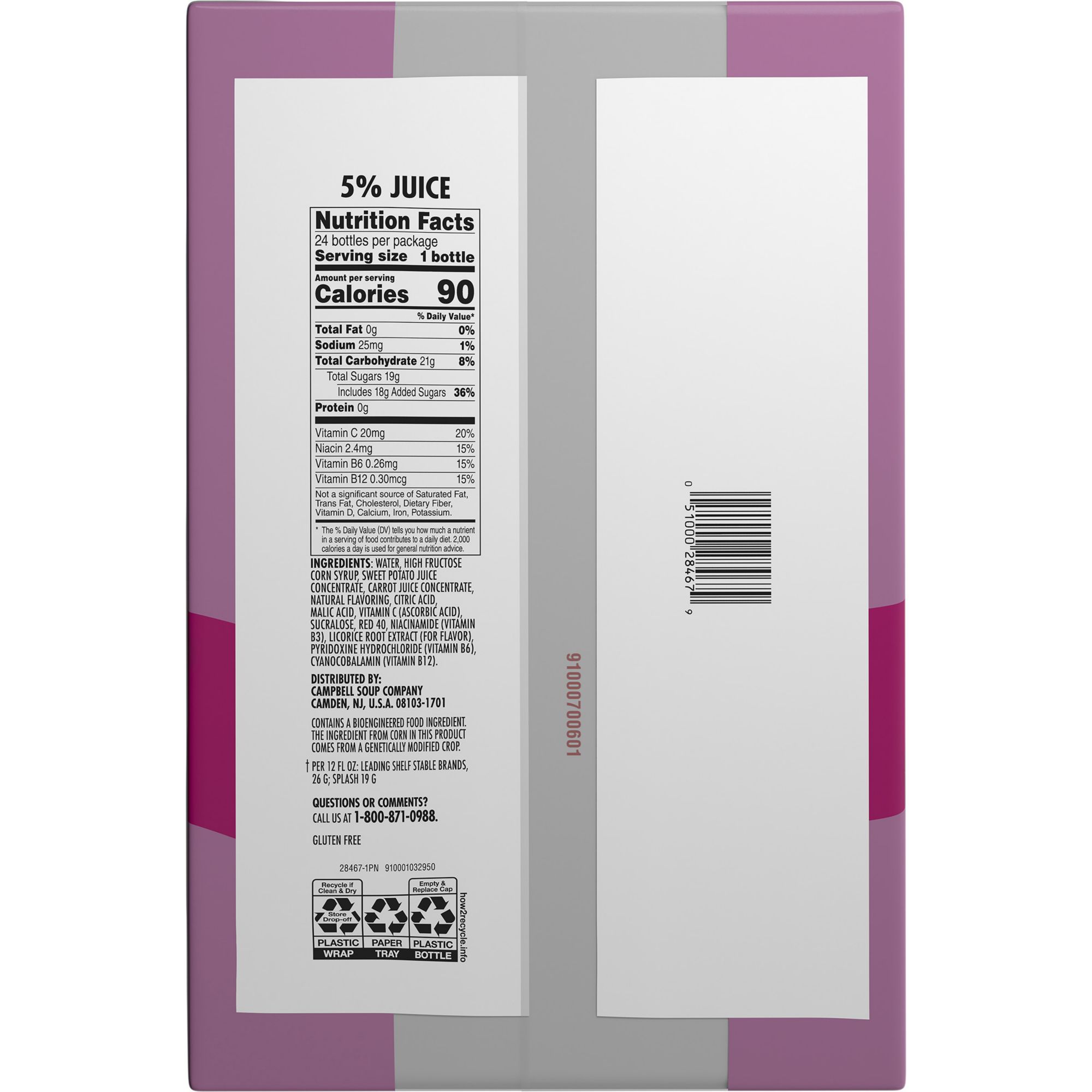 Quench your thirst with the refreshing taste of V8 Splash Berry Blend Flavored Juice Beverage. This 5% juice blend is made from the concentrated juices of sweet potatoes and carrots with the natural flavors of strawberries, raspberries and blackberries for a tasty drink with a satisfying splash of delicious fruit flavor. V8 Splash Berry Blend juice beverage contains 25% less sugar than leading juice drink brands*, plus Antioxidant C and B Vitamins. It’s also gluten free and fat free. With only 60 calories per bottle, V8 Splash is a lower calorie alternative to orange juice and apple juice. Serve this fruit flavored drink in the morning or as part of an after-school snack. V8 Splash is also delicious in homemade smoothies and makes a great mocktail or cocktail mixer. In addition to Berry Blend, V8 Splash Juice is also available in Strawberry Kiwi, Fruit Medley, and other refreshing fruit flavors. (*Per 12 fl. oz.: Leading shelf stable brands, 26g; Splash, 13g)