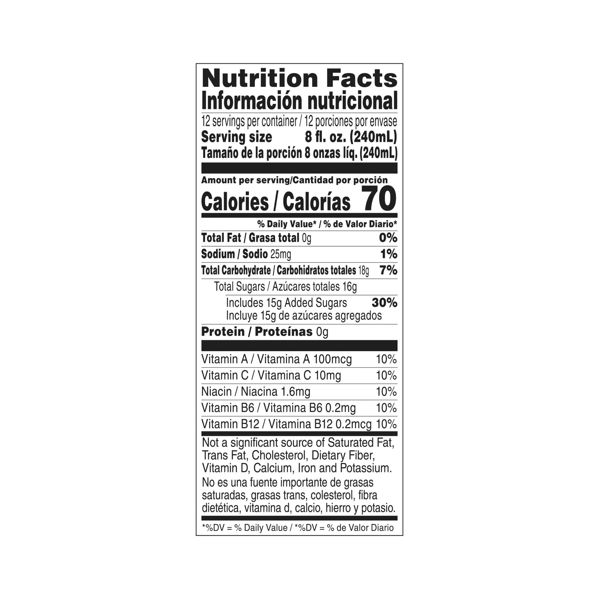 Ingredients: Water, Vegetable Juice (Water And Concentrated Juice Of Carrots), High Fructose Corn Syrup, Malic Acid, Natural Flavoring, Vitamin C (Ascorbic Acid), Sucralose, Niacinamide (Vitamin B3), Pyridoxine Hydrochloride (Vitamin B6), Cyanocobalamin (Vitamin B12).