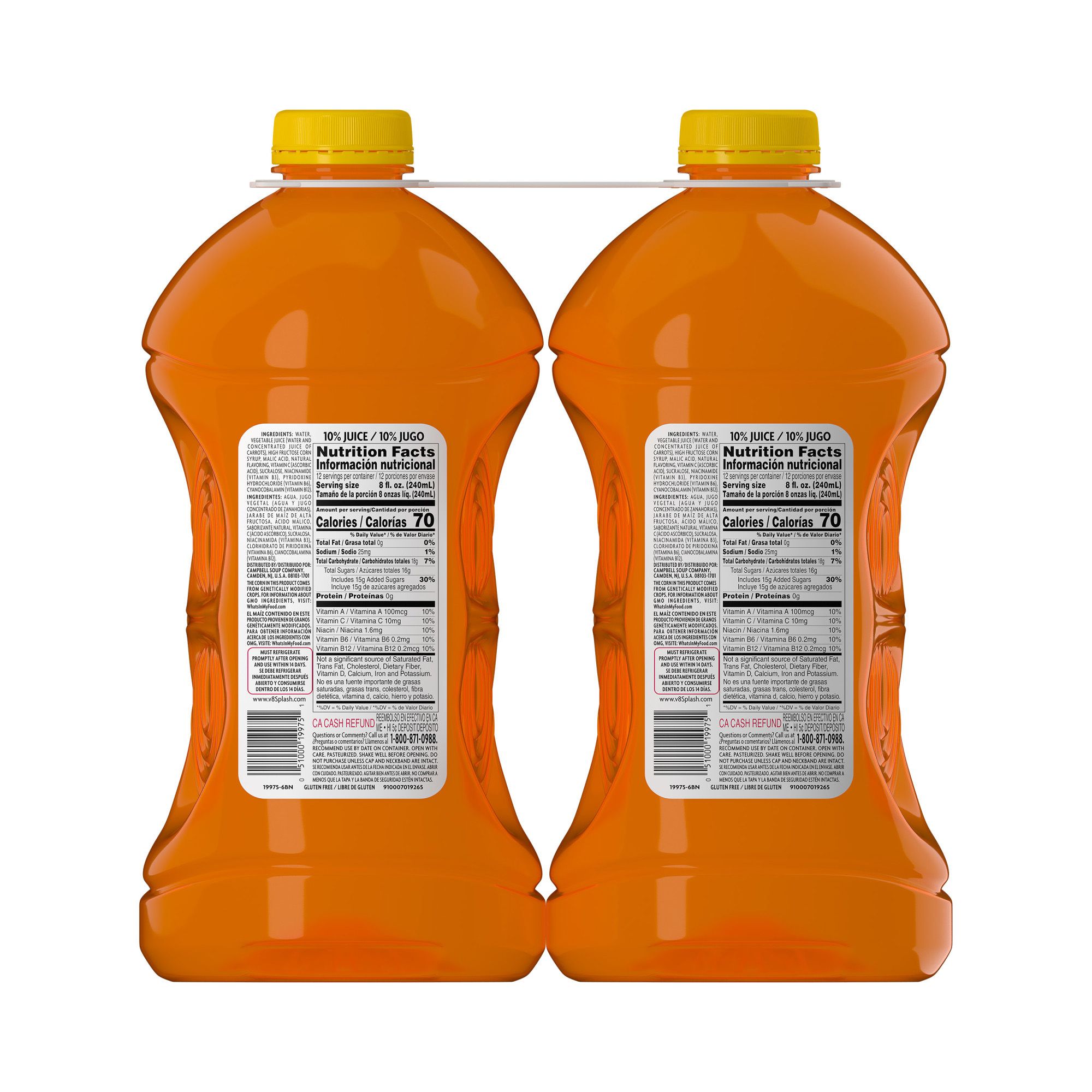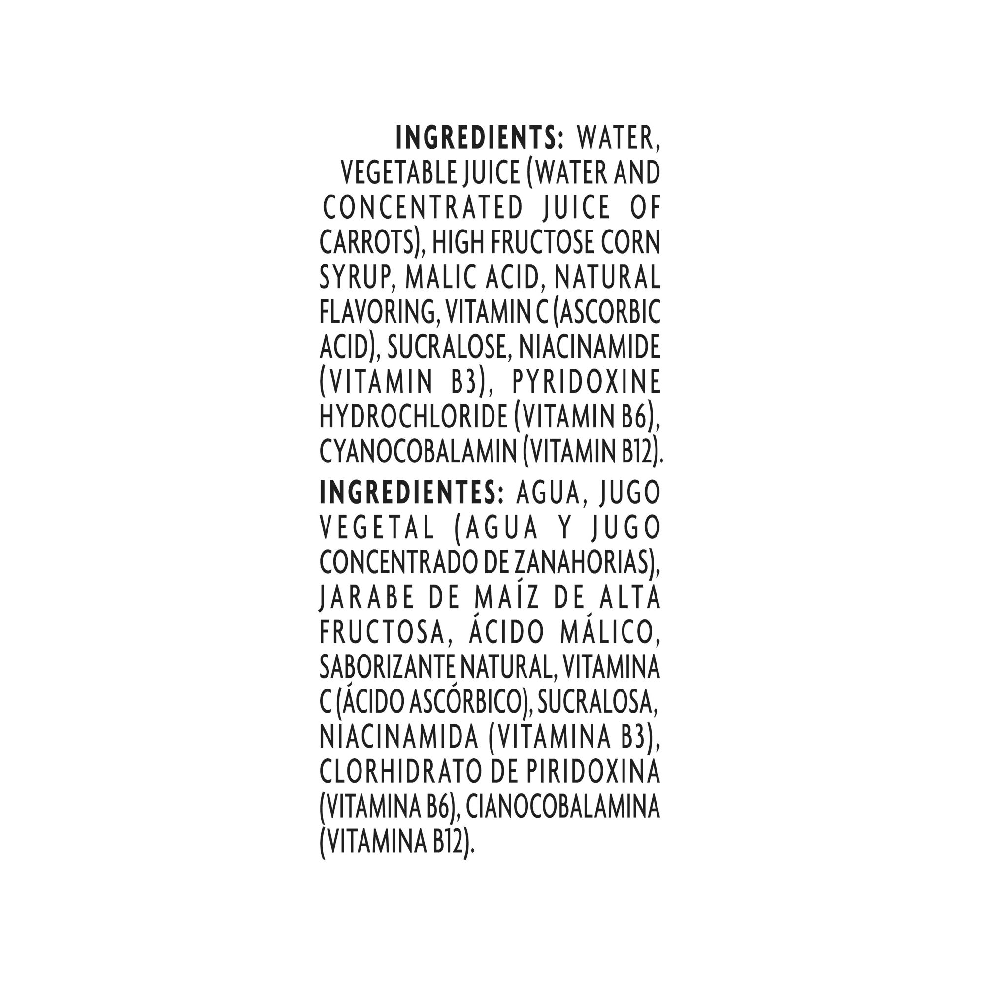 Ingredients: Water, Vegetable Juice (Water And Concentrated Juice Of Carrots), High Fructose Corn Syrup, Malic Acid, Natural Flavoring, Vitamin C (Ascorbic Acid), Sucralose, Niacinamide (Vitamin B3), Pyridoxine Hydrochloride (Vitamin B6), Cyanocobalamin (Vitamin B12).