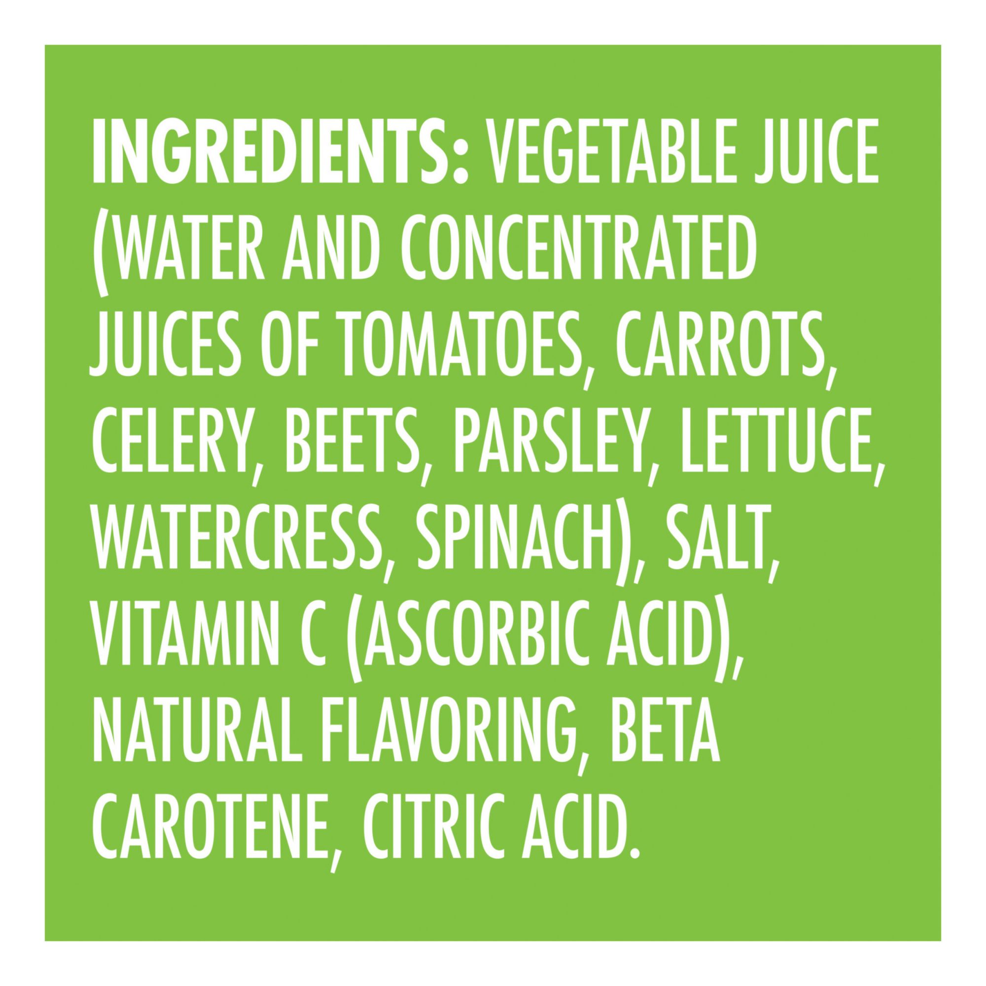 Ingredients: Vegetable Juice (Water And Concentrated Juice Of Tomatoes, Carrots, Celery, Beets, Parsley, Lettuce, Watercress, Spinach), Salt, Vitamin C (Ascorbic Acid), Natural Flavoring, Beta Carotene, Citric Acid.