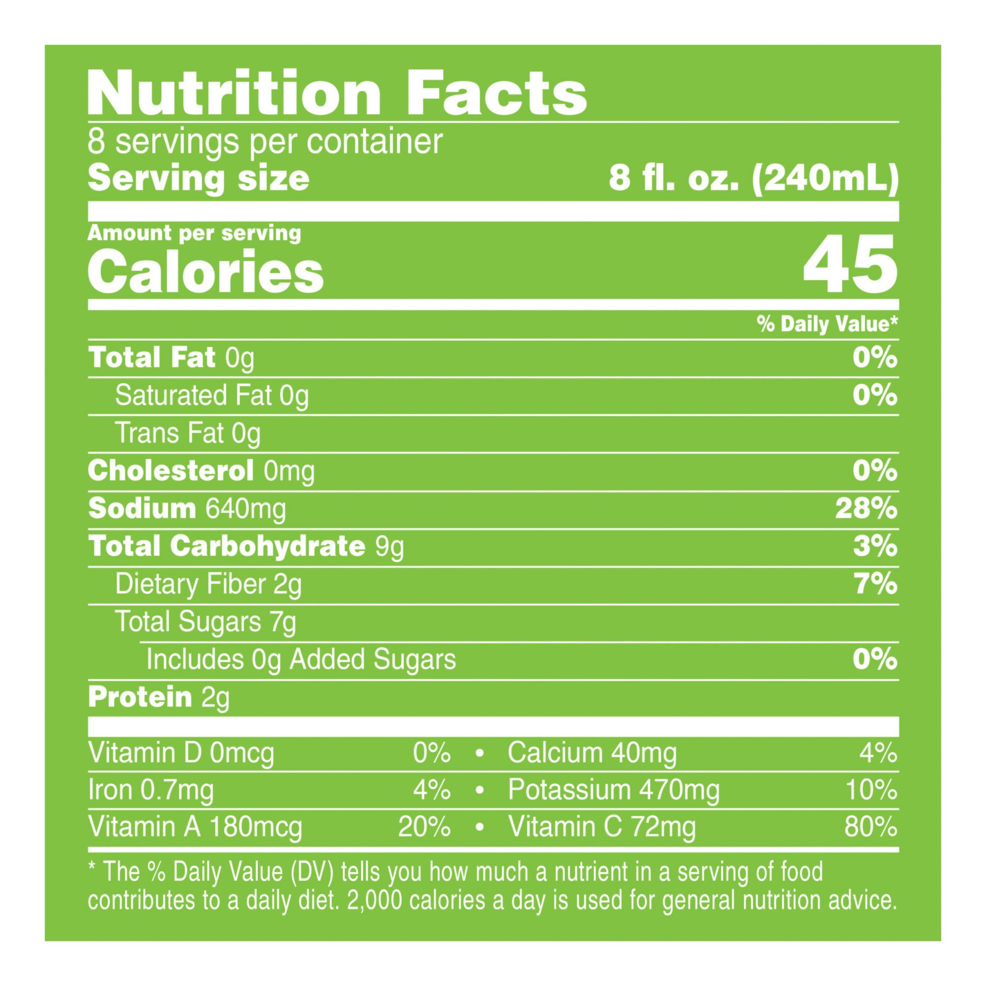 Each 8 fl. oz. serving of this 100% juice contains 2 servings of vegetables and is an excellent source of vitamins A and C* (*see nutrition panel for sodium content)