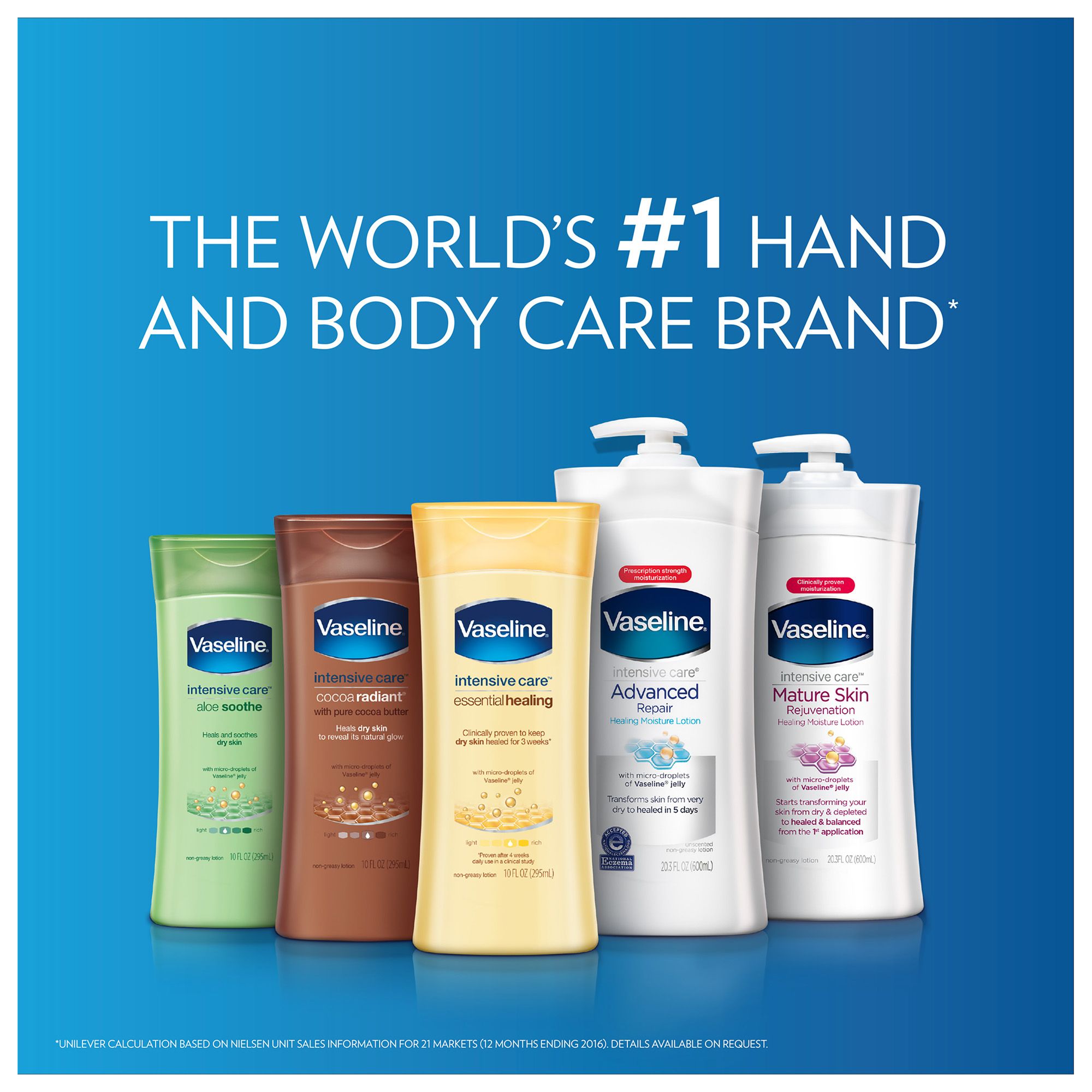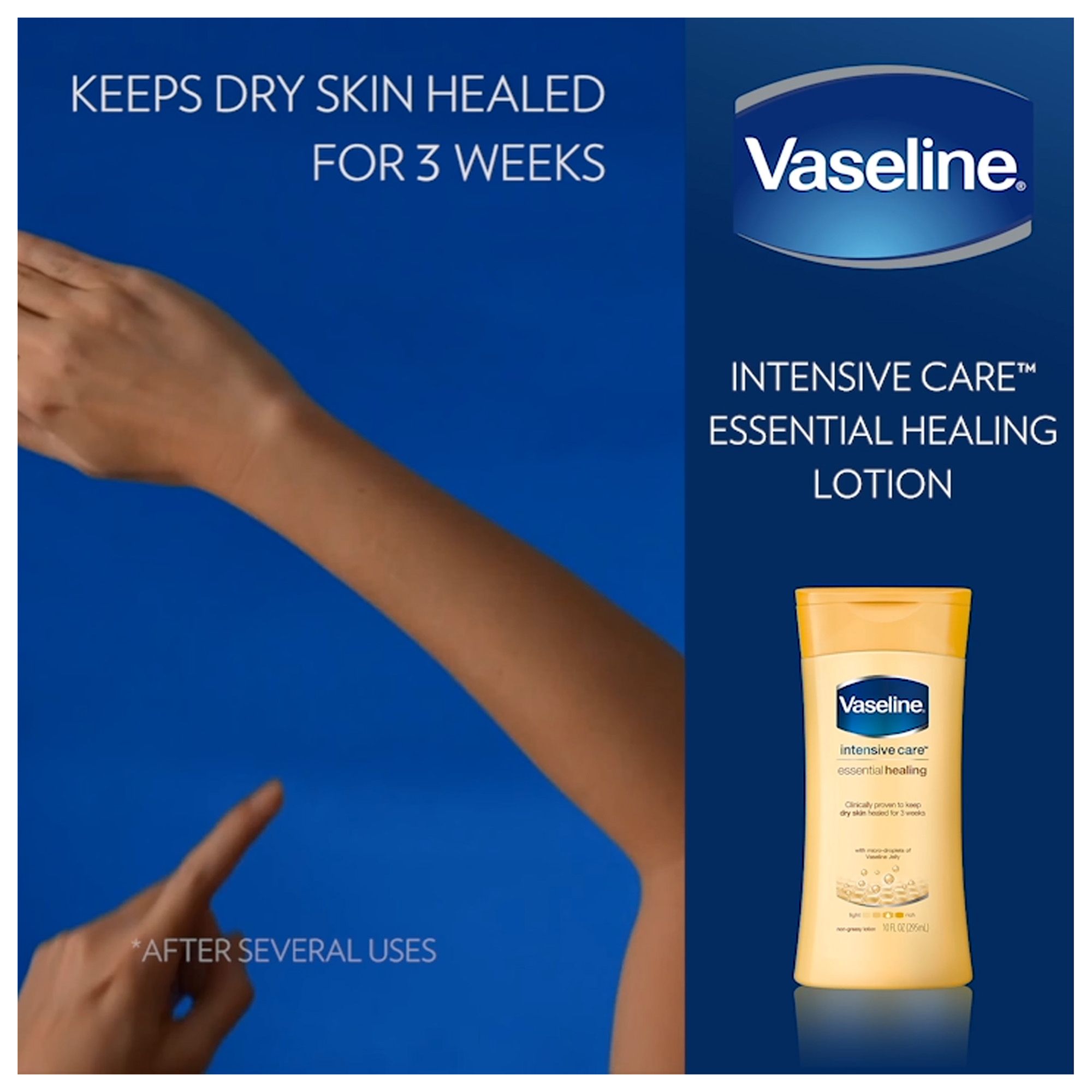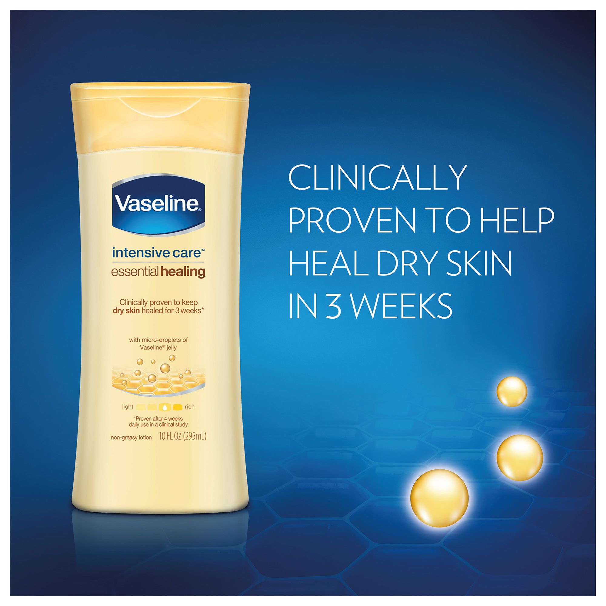 Vaseline Intensive Care Essential Healing Body Lotion provides fast absorbing moisture to give you deeply moisturized, healthy skin. It is clinically proven, after four weeks of daily use, to keep dry skin healed for three weeks. It's a body lotion for dry skin you can count on.