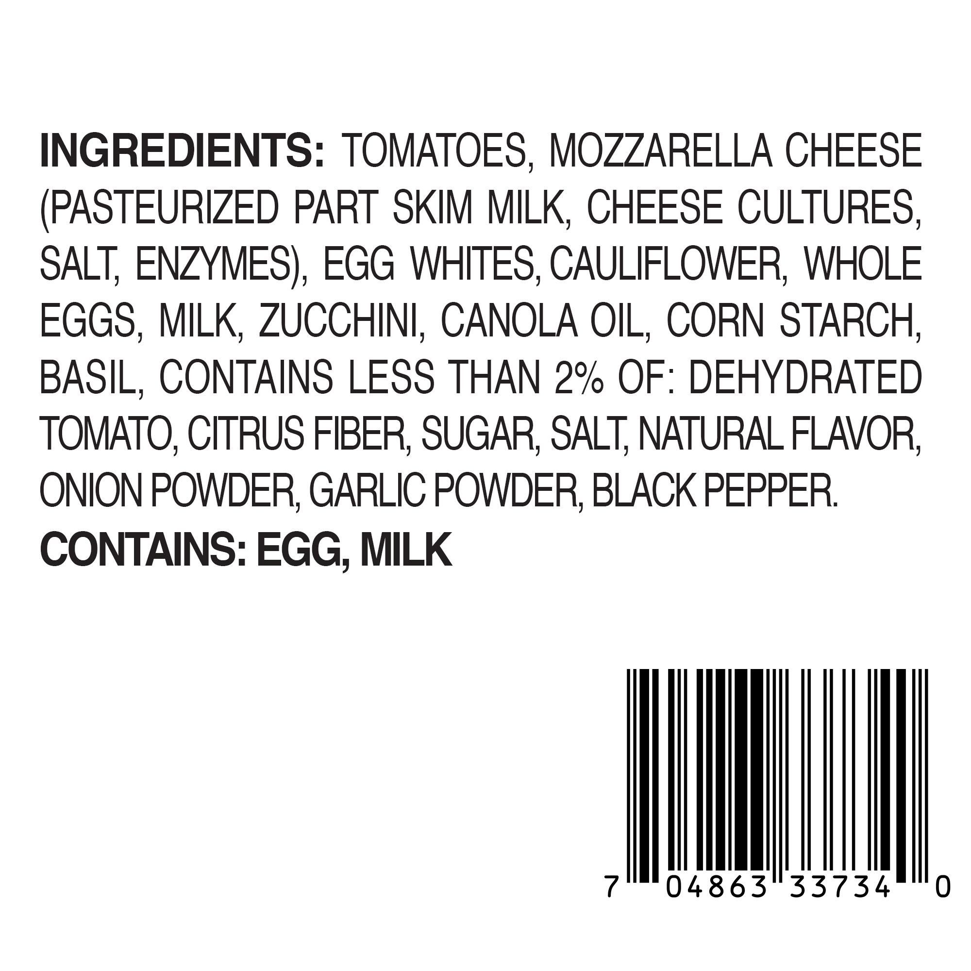 Ingredients: Tomatoes, Mozzarella Cheese (Pasteurized Part Skim Milk, Cheese Cultures ,Salt ,Enzymes), Egg Whites, Cauliflower, Whole Eggs, Milk, Zucchini, Canola Oil, Corn Starch, Basil. Contains less than 2%of:Dehydrated Tomato, Citrus Fiber, Sugar, Salt, Natural Flavor, Onion Powder, Garlic Powder, Black Pepper. Contains Egg, Milk