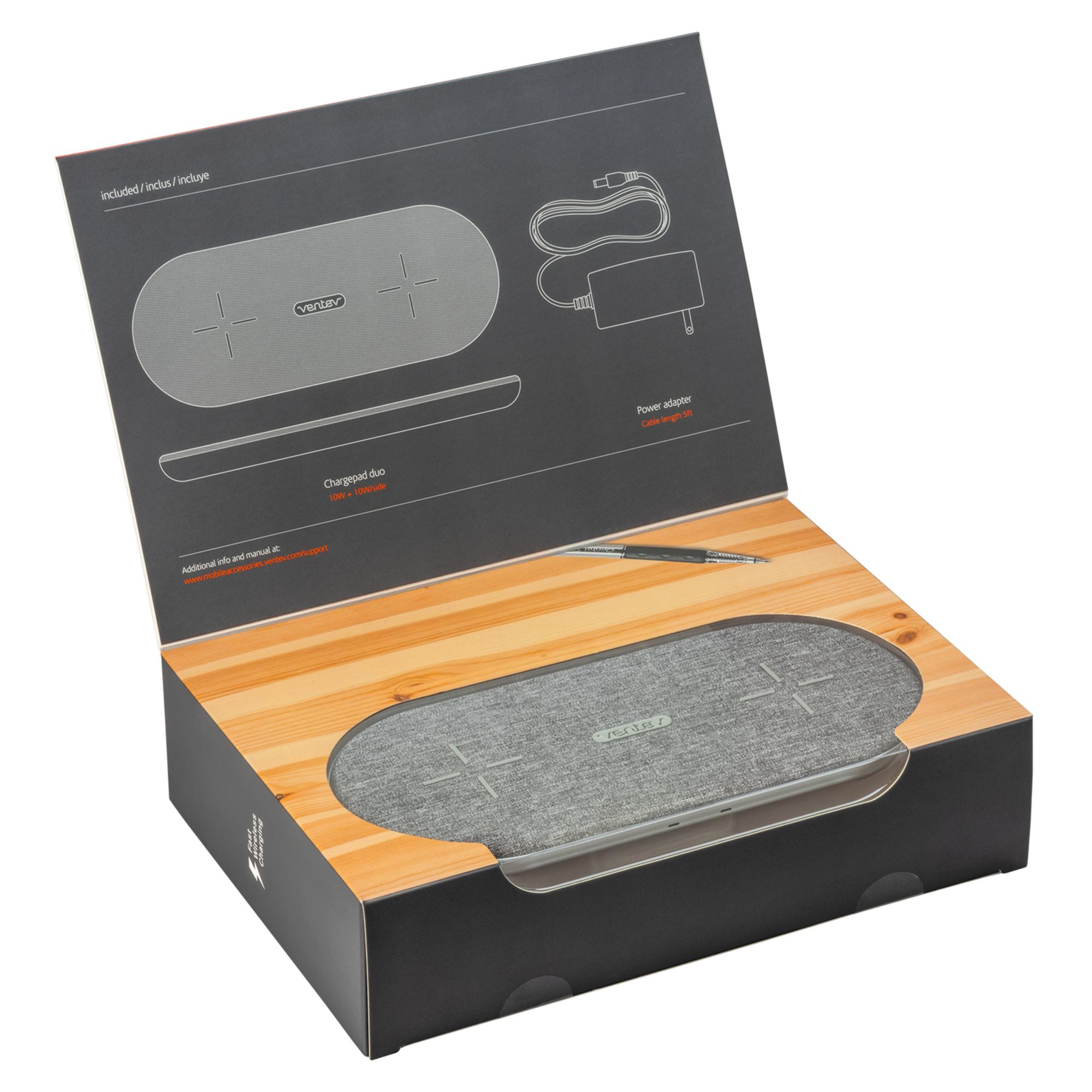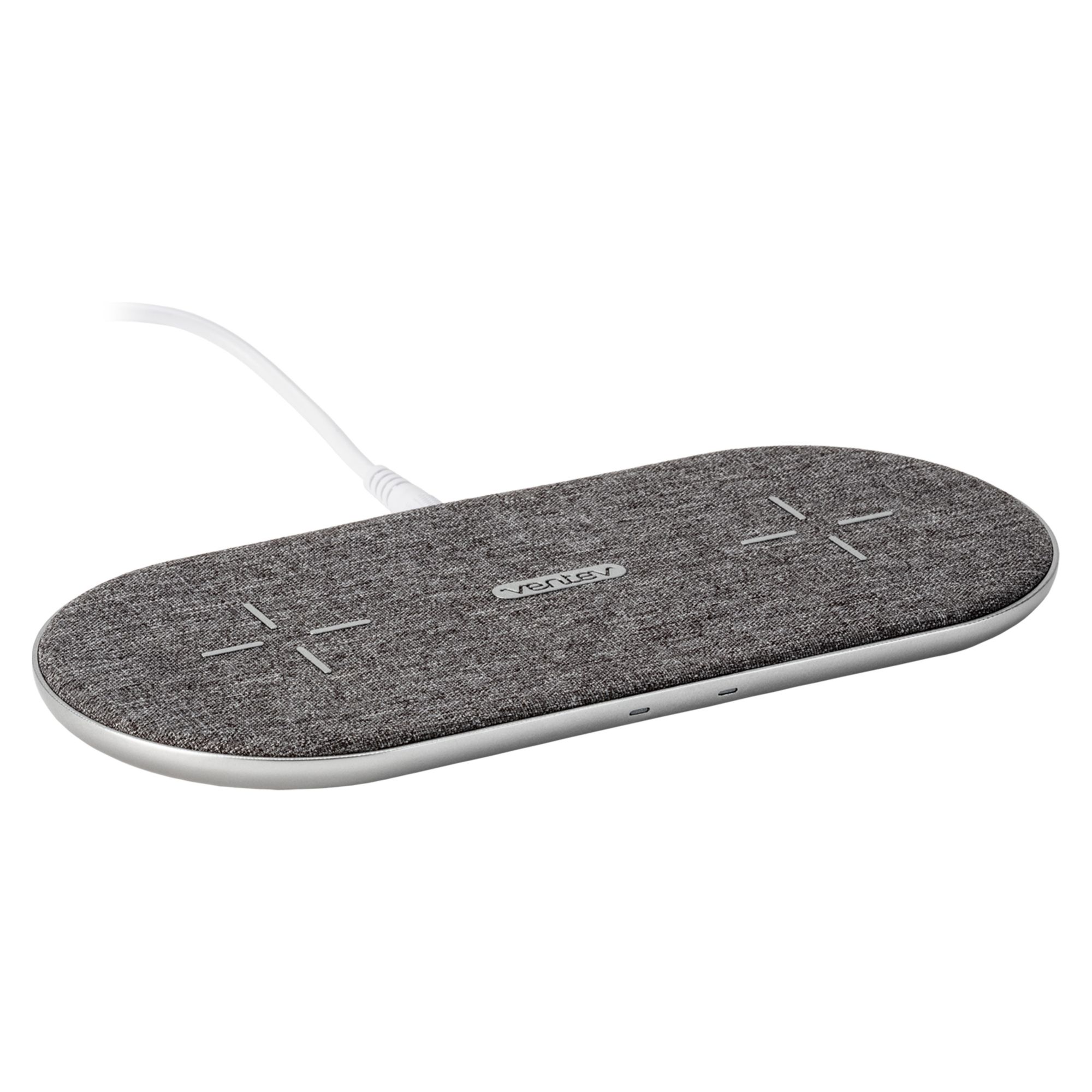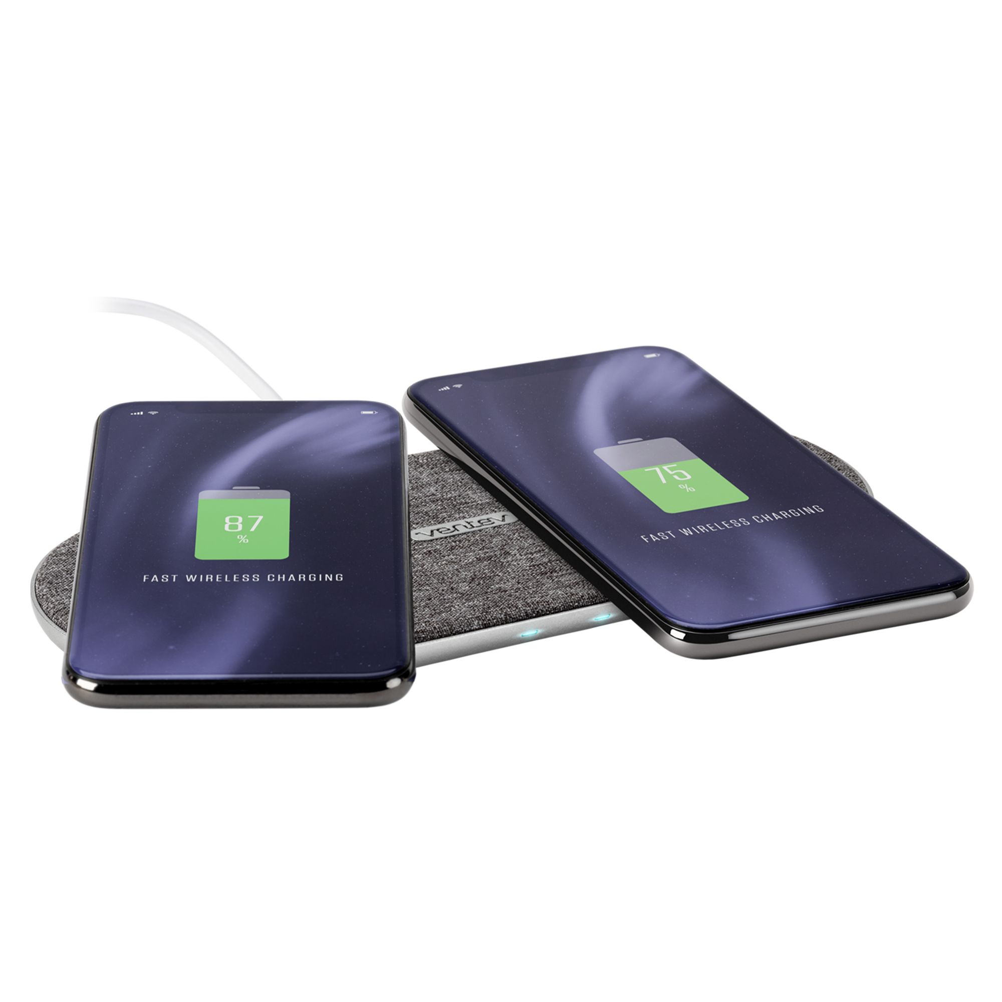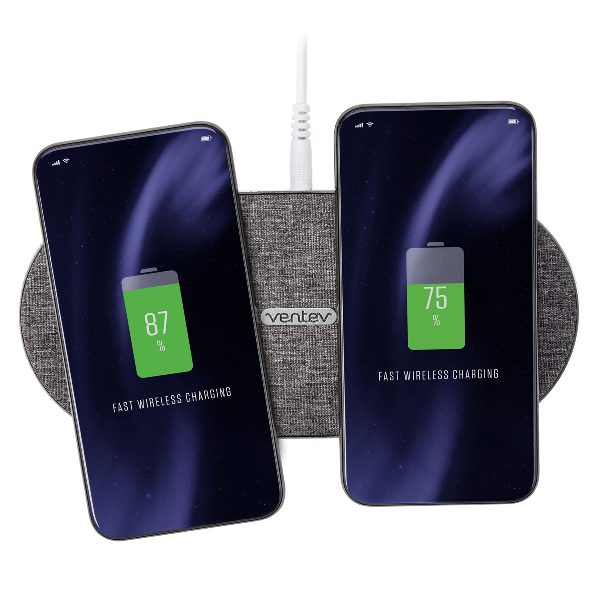 Power up to two devices at once. The wireless chargepad duo features fast charging for both Apple 7.5W and Samsung 10W devices, as well as all Qi wireless charging devices. Its supple cloth covering matches other Ventev home-focused products allowing it to charge in style while powering up to two devices simultaneously at up to 20W total.