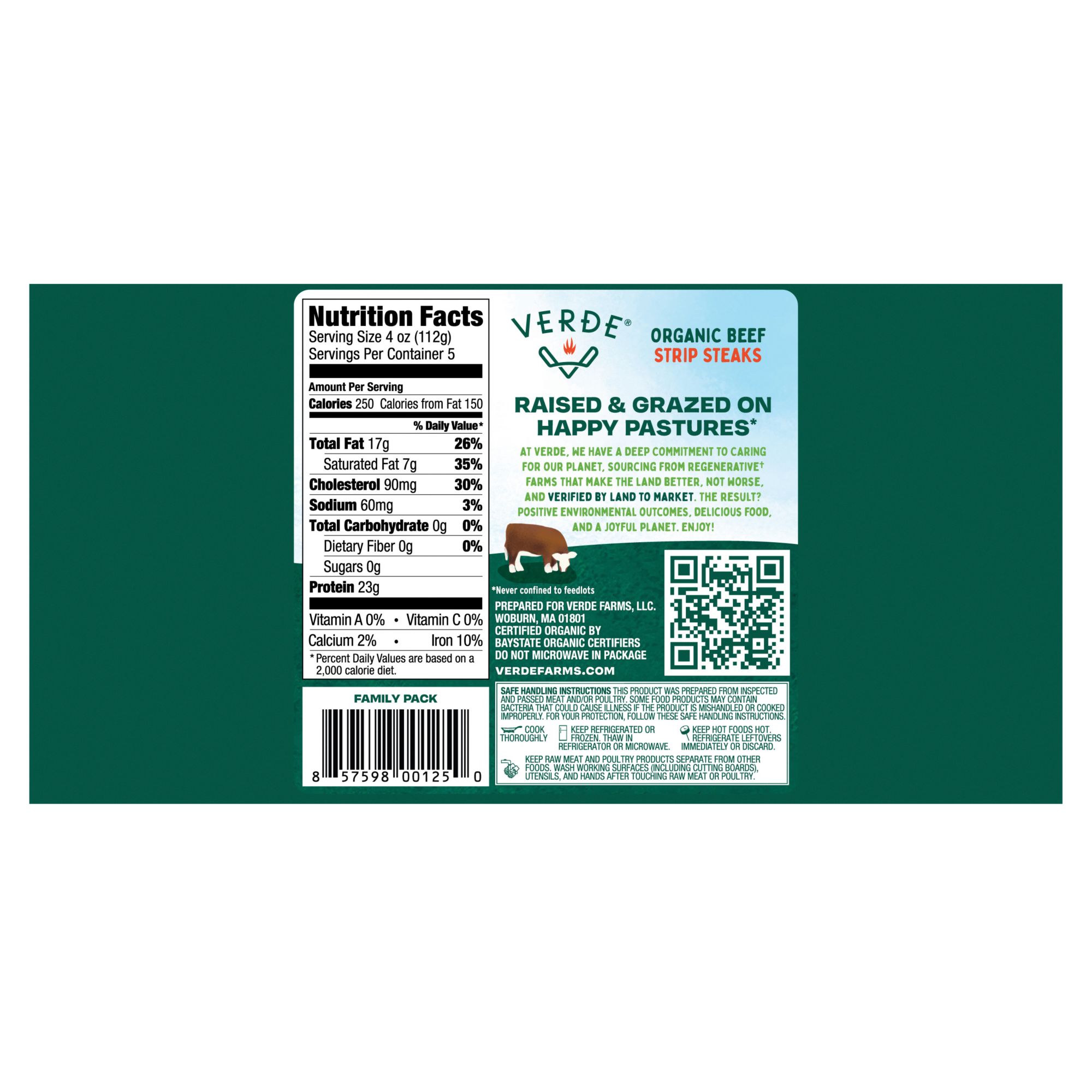 Verde Farms 100% Organic Grass Fed Strip Loin Steak is composed of 100% grass-fed and grass finished beef. No antibiotics, no added growth hormones, 100% free range cattle, USDA Certified Organic. This organic grass fed beef is a lean, healthy alternative. This steak is ready for any night dinner, weekend BBQ or lunch time steak sandwich. Cook quickly in a pan or on the grill or oven. Sprinkle with salt, pepper or add a sauce and enjoy.