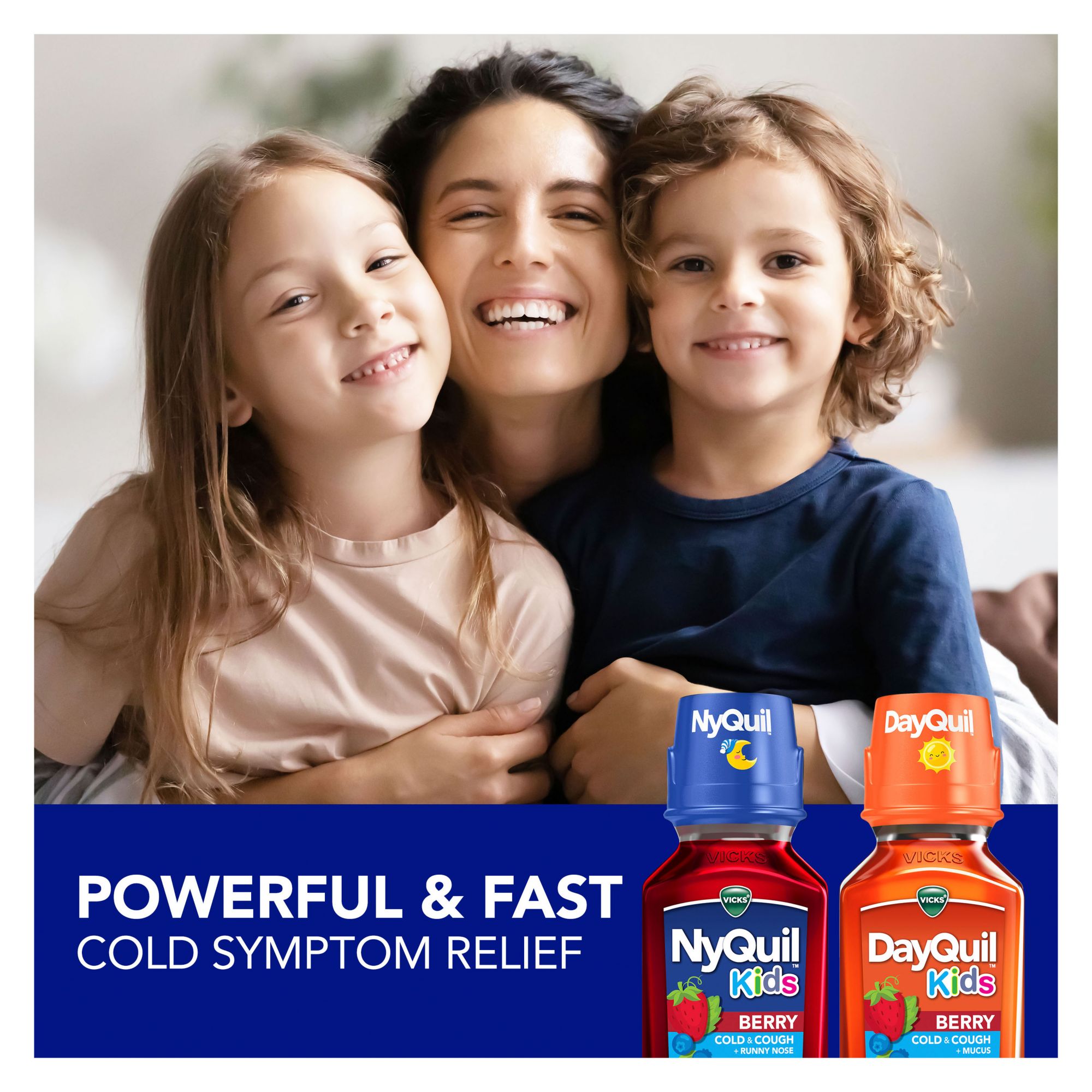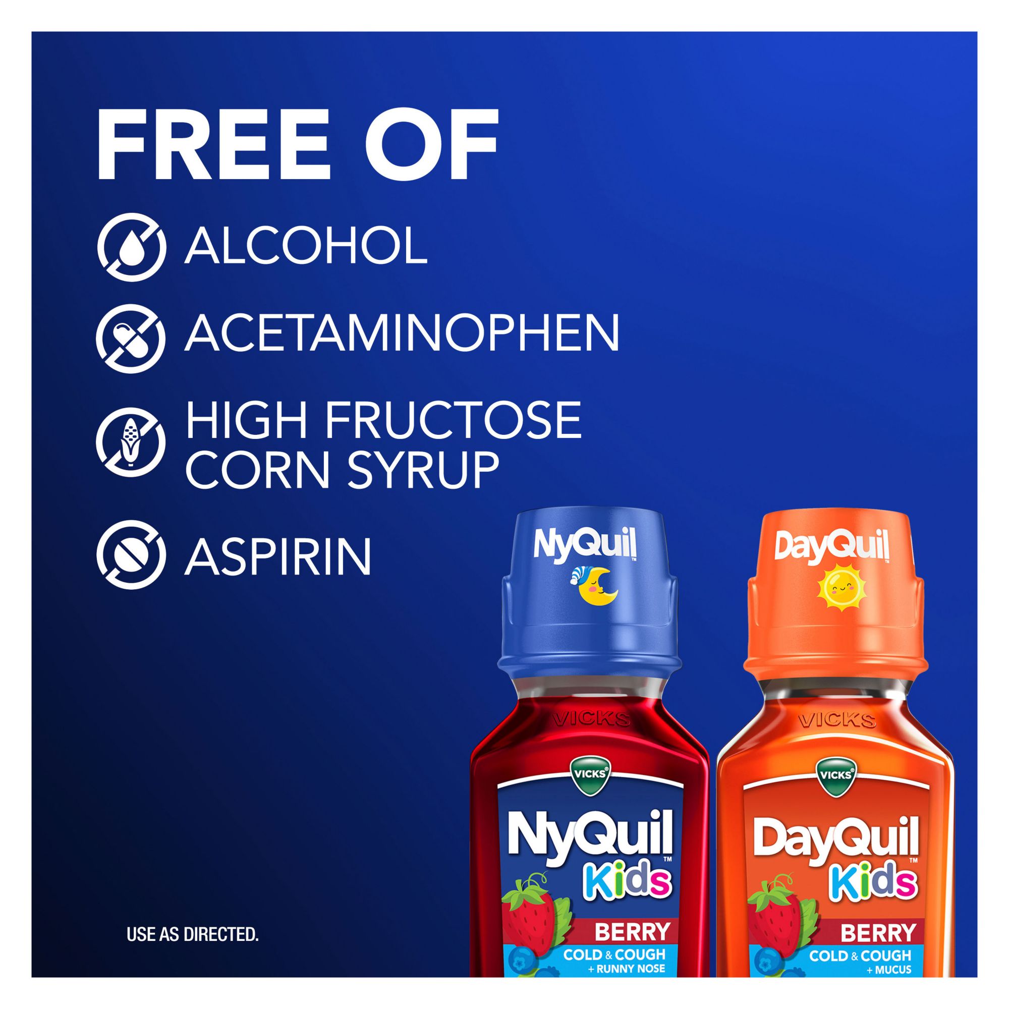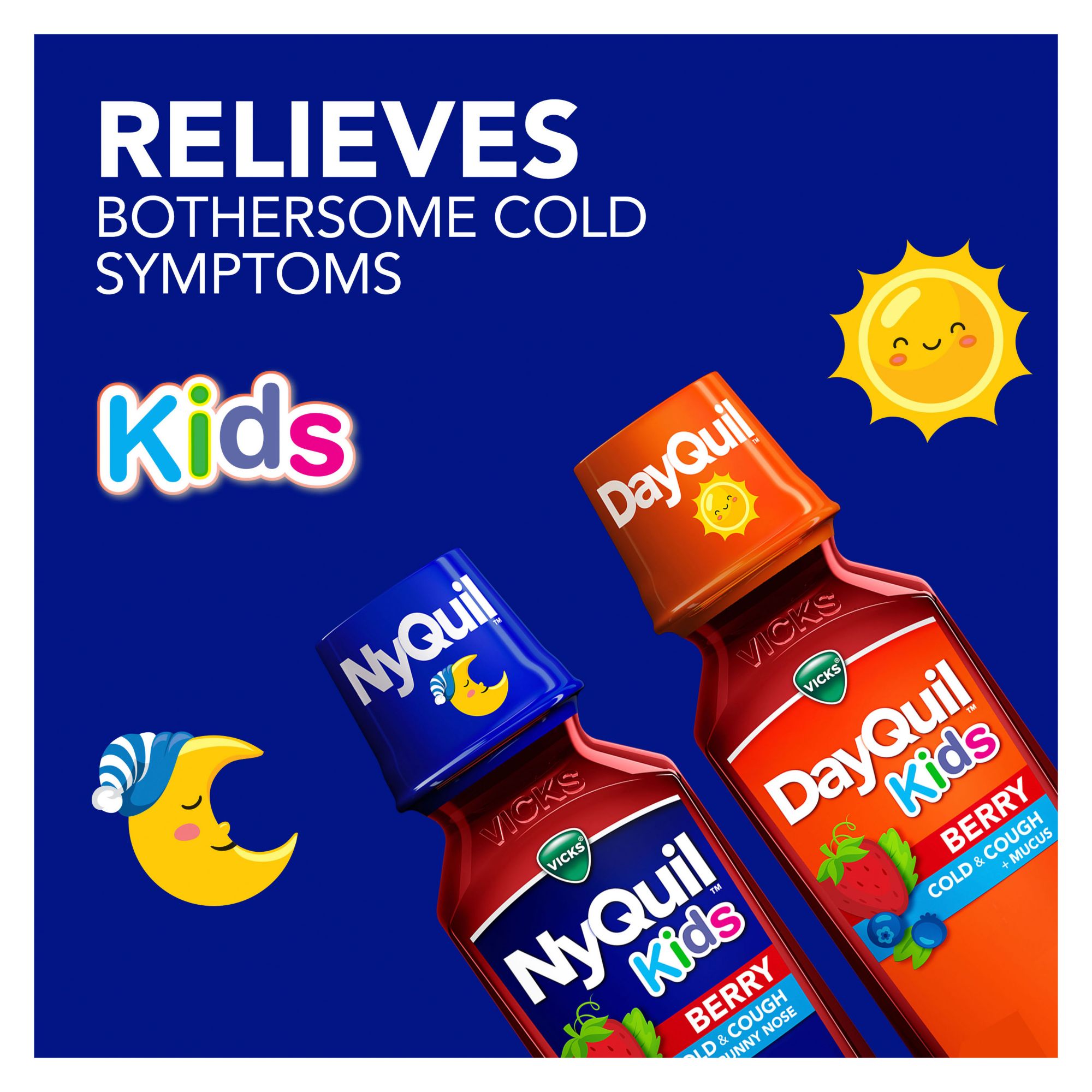 Vicks DayQuil and NyQuil products are trusted worldwide to treat cold symptoms to help you get the rest you need. As your children grow, their cold and cough symptom relief options should too. When your child is sick, you need medicine that will help them recover faster and has a delicious, kid-friendly taste to make it easier for them to take. Vicks DayQuil and NyQuil Kids Berry Cold & Cough multi-symptom medicines deliver fast and effective cold relief that helps your child recover faster with a delicious berry taste. DayQuil Kids Berry helps relieve chest congestion, nasal congestion, and coughing so your child can get back to enjoying their day. At nighttime, NyQuil Kids Berry temporarily relieves your child's sneezing, runny nose, nasal congestion and cough so they can get the rest they need. Trust Vicks when your child needs powerful and fast multi-symptom relief from the most bothersome cold symptoms. Specially designed by the experts at Vicks with your kids in mind, DayQuil and NyQuil Kids are free of alcohol, aspirin, acetaminophen, and high-fructose corn syrup. These medicines are specially formulated for children ages 6 and up.