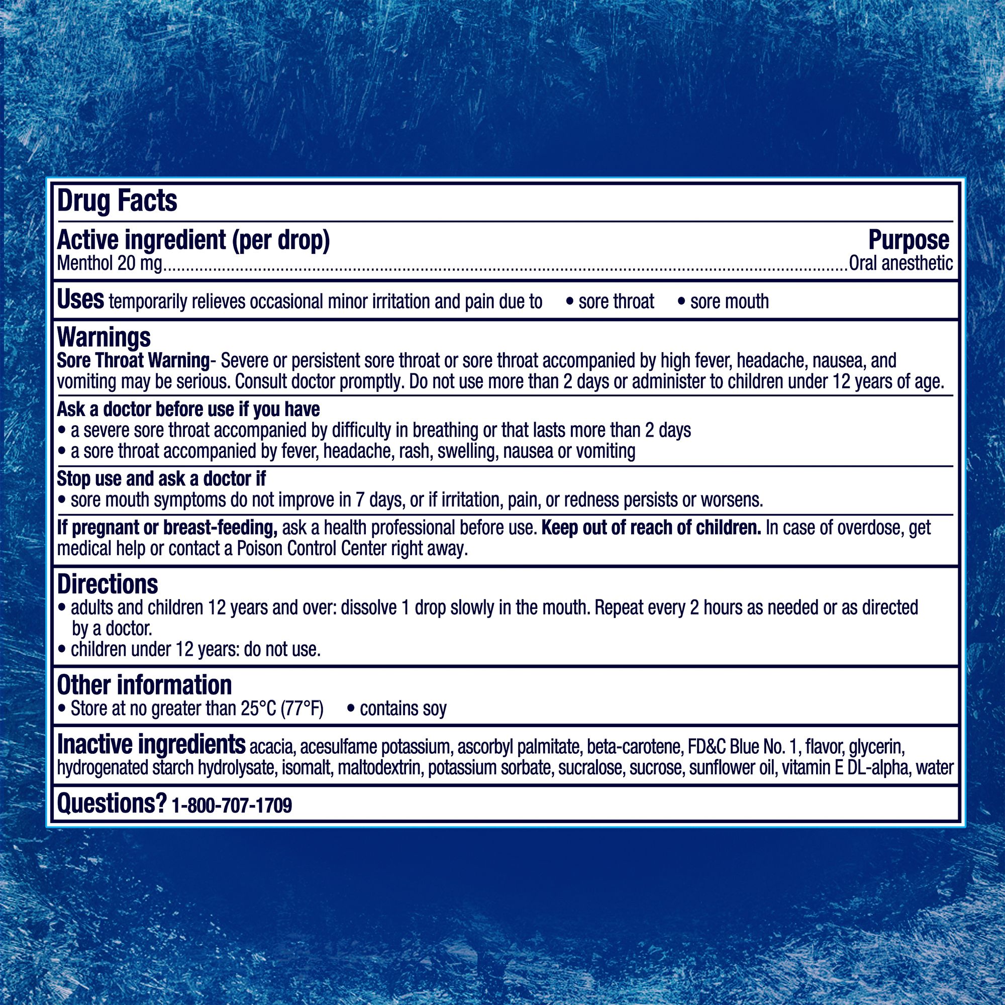 Ingredients: Active Ingredients: Per Drop: Menthol 20 mg (Oral anesthetic) Inactive Ingredients: Corn Syrup, Eucalyptol, FD&C Blue No. 1, Flavors, Glycerin, Gum Arabic, Potassium Sorbate, Sucrose, Water