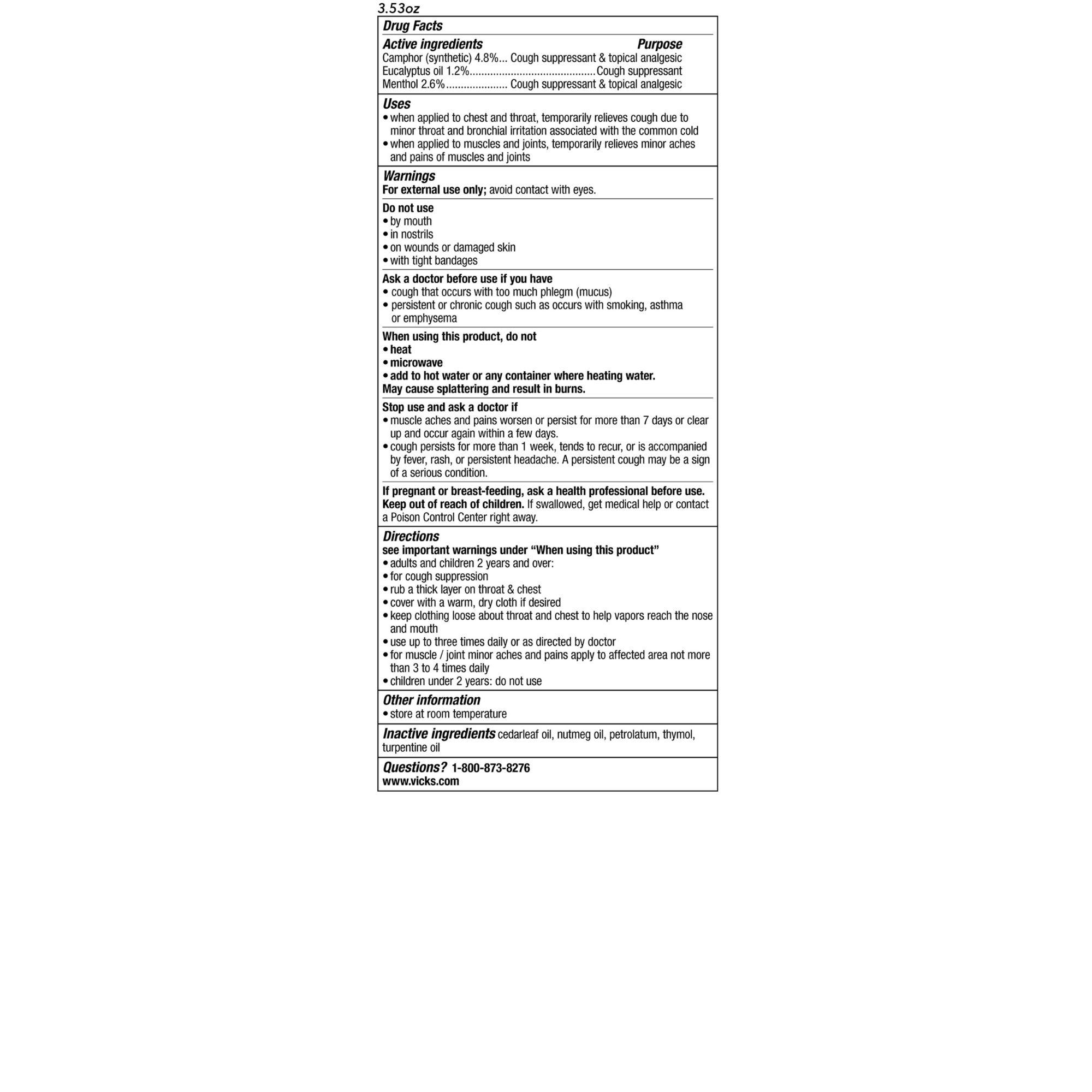 Temporarily relieves cough due to common cold, as well as minor aches and pains in muscles and joints See important warnings under "When Using This Product" Adults and children 2+ years rub a thick layer on throat and chest Cover with a warm, dry cloth if desired Keep clothing loose about throat and chest to help vapors reach the nose and mouth Use up to three times daily or as directed by a doctor Ages 2+ Includes two pack of 3.53-oz. cough suppressant topical analgesic ointment jars