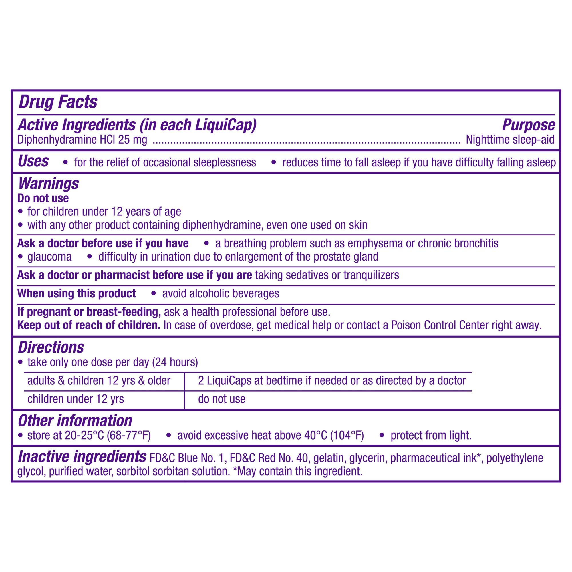 Do not use: for children under 12 years of age; with any other product containing diphenhydramine, even one used on skin. Ask a doctor before use if you have: a breathing problem such as asthma, emphysema, or chronic bronchitis, glaucoma, difficulty in urination due to enlargement of the prostate gland. Ask a doctor or pharmacist before use if you are taking sedatives or tranquilizers or any other sleep aid. When using this product avoid alcoholic beverages. If pregnant or breast-feeding, ask a health professional before use. Keep out of reach of children. In case of overdose, get medical help or contact a Poison Control Center right away.