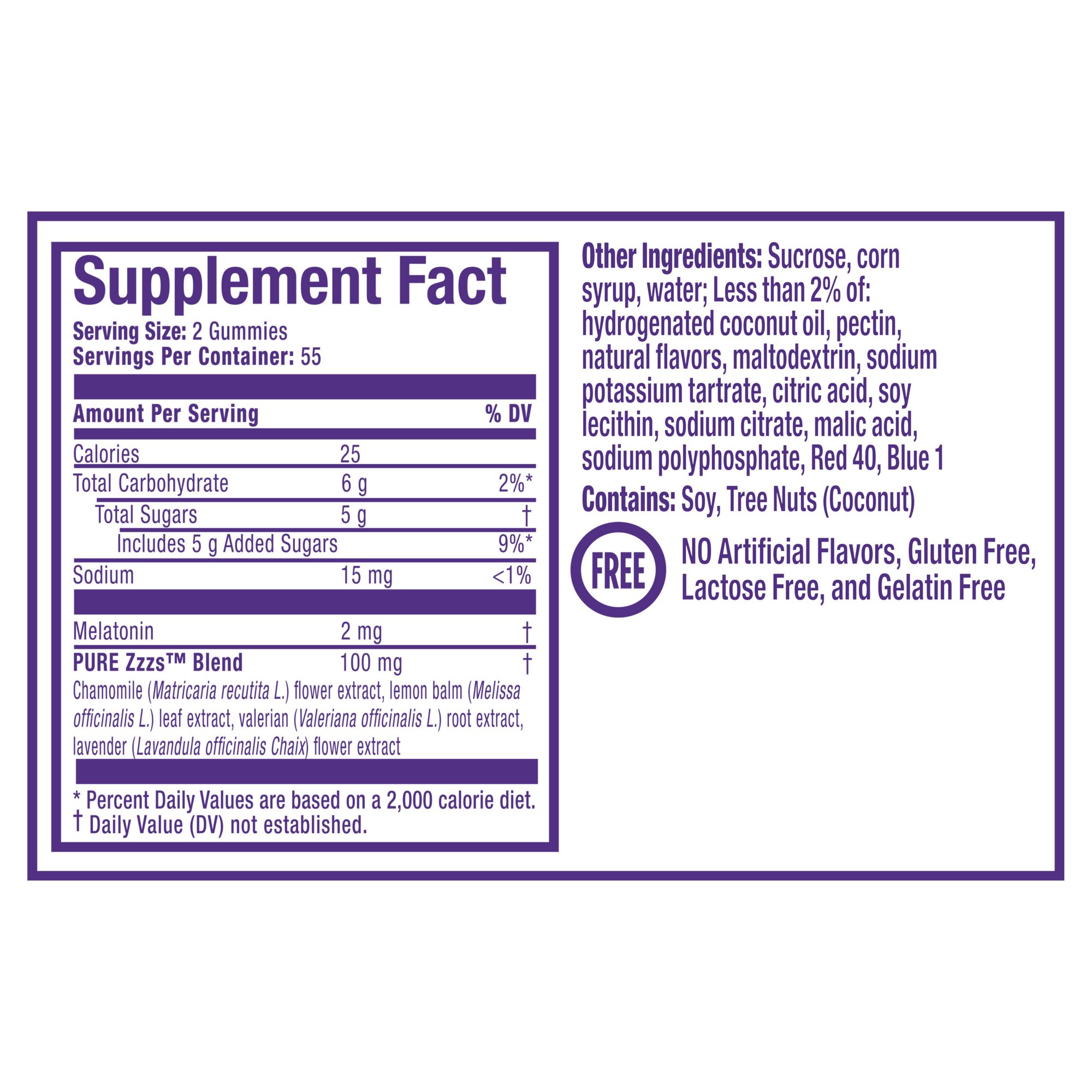 ZzzQuil PURE Zzzs gummies help you fall asleep naturally and regulate your sleep cycle so that you can take on your tomorrow Formulated with an optimal level of melatonin, shown to help regulate your sleep cycle so you can wake refreshed* Uniquely formulated with a blend of botanical essential oils including lavender, chamomile, lemon balm, and valerian root These convenient and great-tasting gummies come in a delicious Wildberry Vanilla flavor you’ll look forward to falling asleep whether you are at home, or traveling through multiple time-zones PURE Zzzs contain no artificial flavors, are drug free, gluten free, lactose free, and gelatin free
