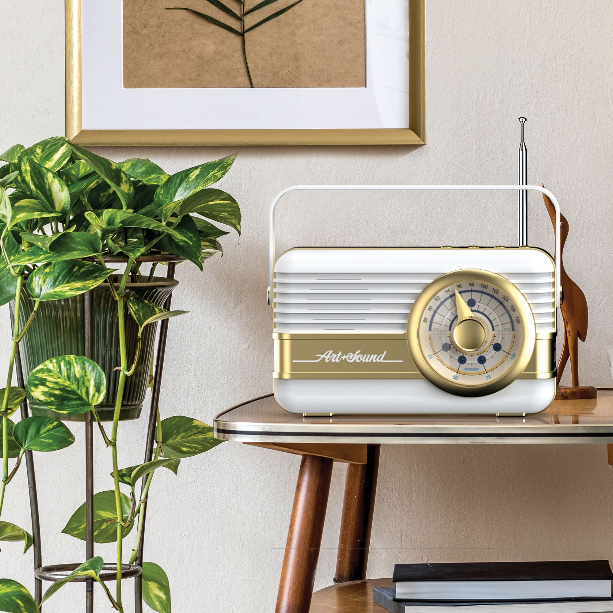 Get in to the groove with the Art+Sound wireless built-in FM tuner vintage radio. A fun, retro-inspired look meets modern sound and innovation on this Art+Sound wireless vintage radio. It features a carrying strap, vintage dials and a collapsible antenna. With the press of a button you can switch from radio listening to streaming off your wireless device via Bluetooth or the 3.5mm aux-in port. The powerful rechargeable battery allows you to take this radio almost anywhere. Retro inspired design with old-fashioned knobs, and more. Extra bass technology will let you turn up the bass in any situation. Broadcast a rich, full sound you will love and enjoy. Powerful rechargeable battery provides fast charging and hours of musical fun. The joy of collecting antique comes from a great find, but also from that moment when you figure out how to breathe new life into an old piece. Vintage is the new old.