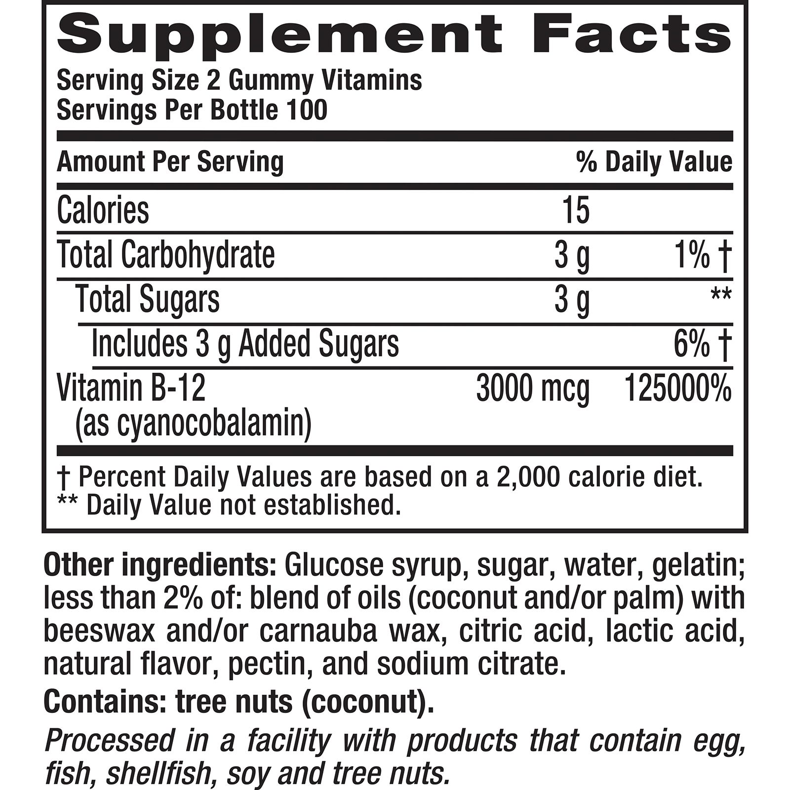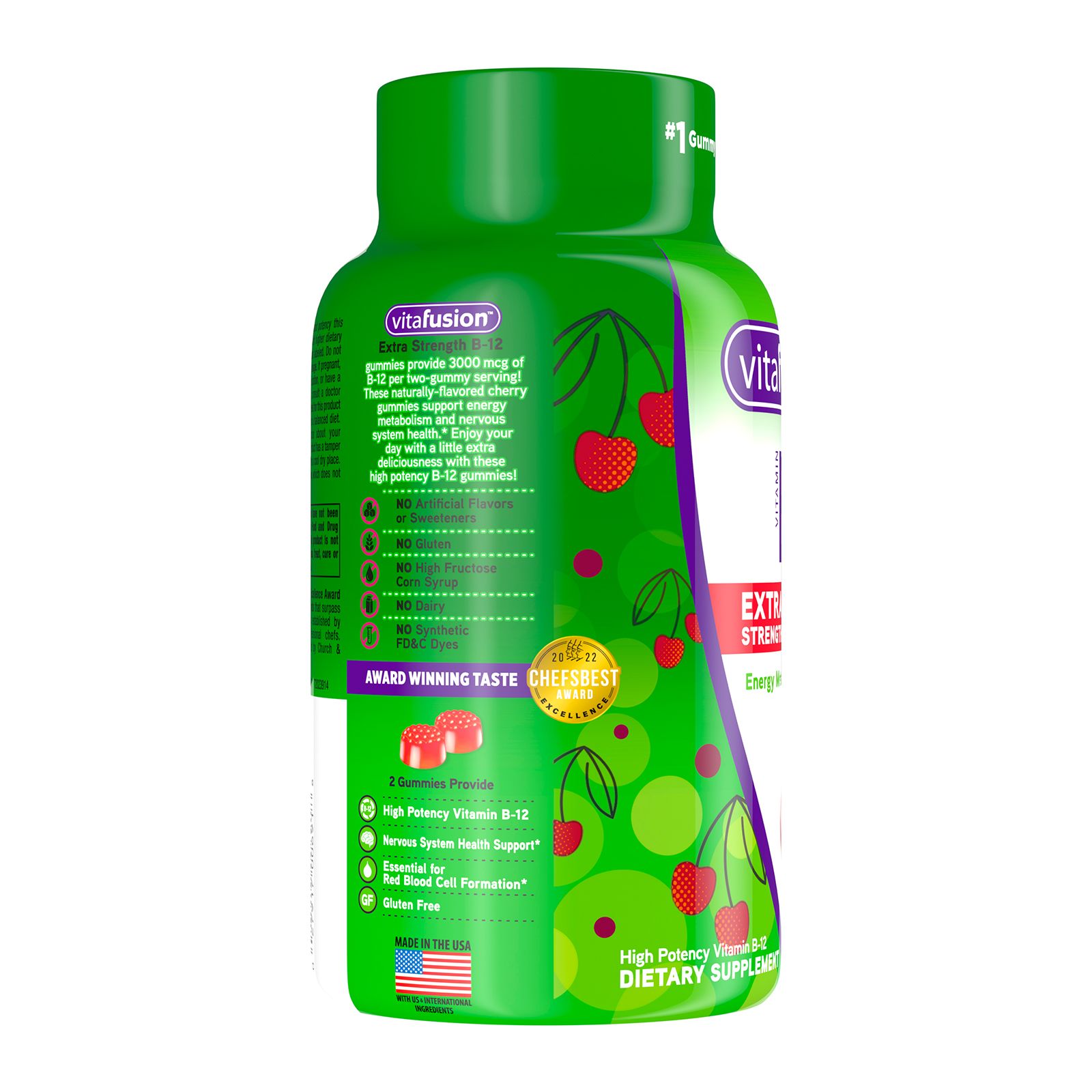 Vitafusion Extra Strength gummies feature high-potency vitamin B12 fused into delicious gummies. Just two extra-strength B12 gummies provide 50,000% daily value (3000 mcg) of B12 to support energy metabolism and nervous system health. Included in this value size are 200 gummies.
