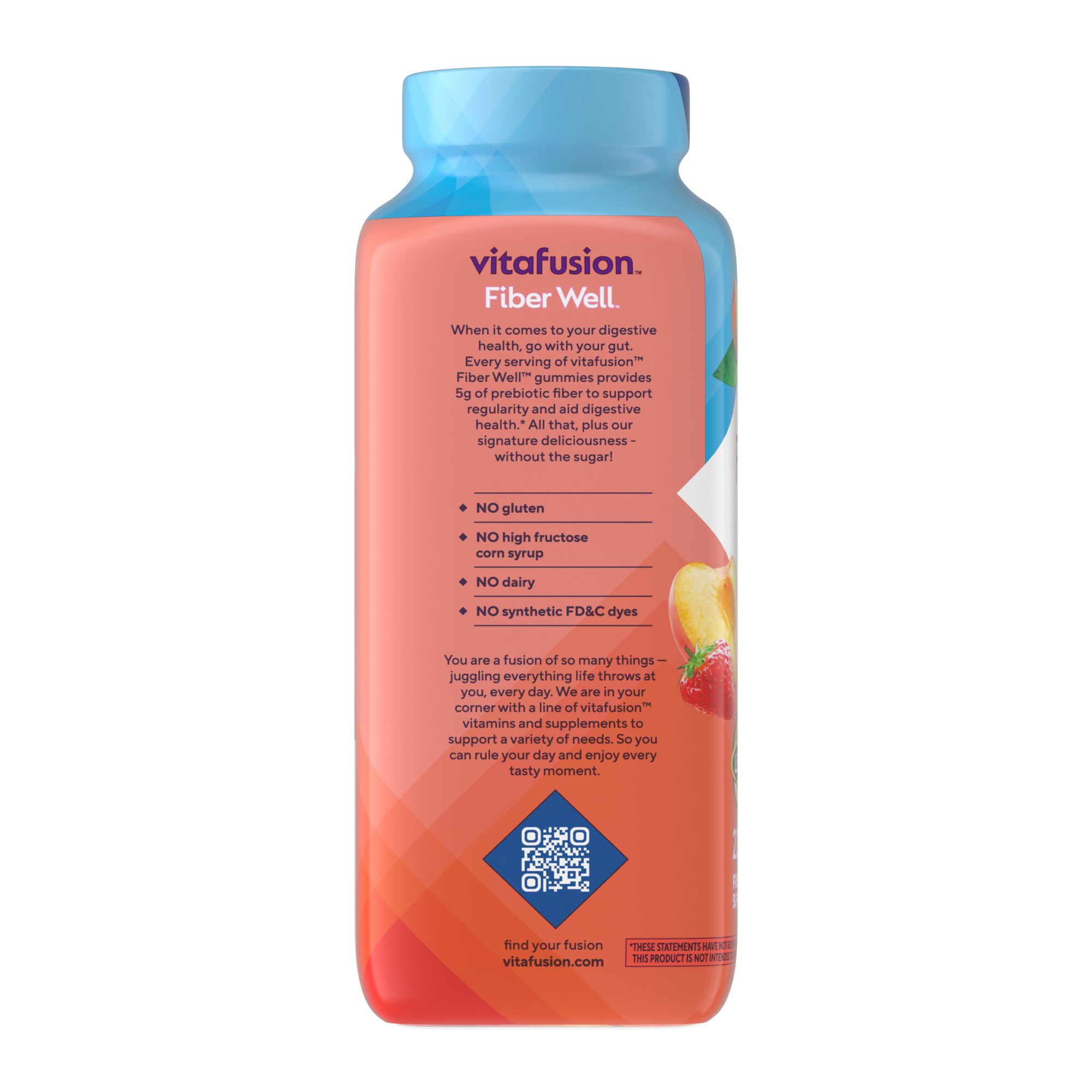Provides 5g of fiber in every serving to support digestion and regularity Gummy formula is convenient and tasty with peach, strawberry and blackberry flavors Sugar-free with natural colors and flavors As a fiber supplement, take 2 gummies per day