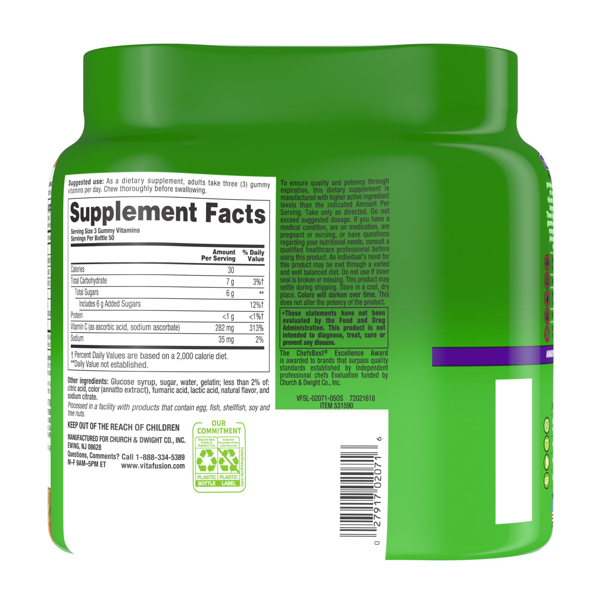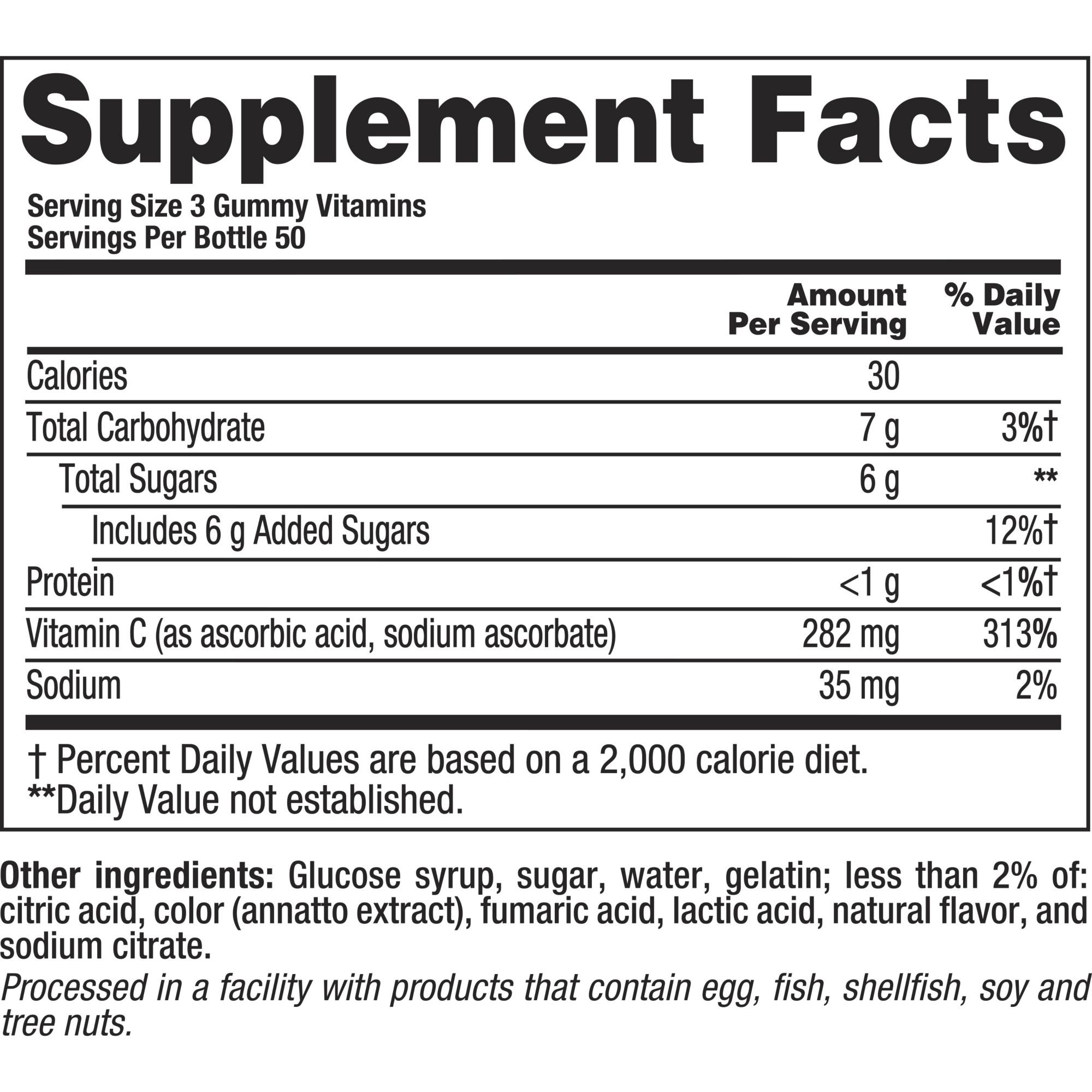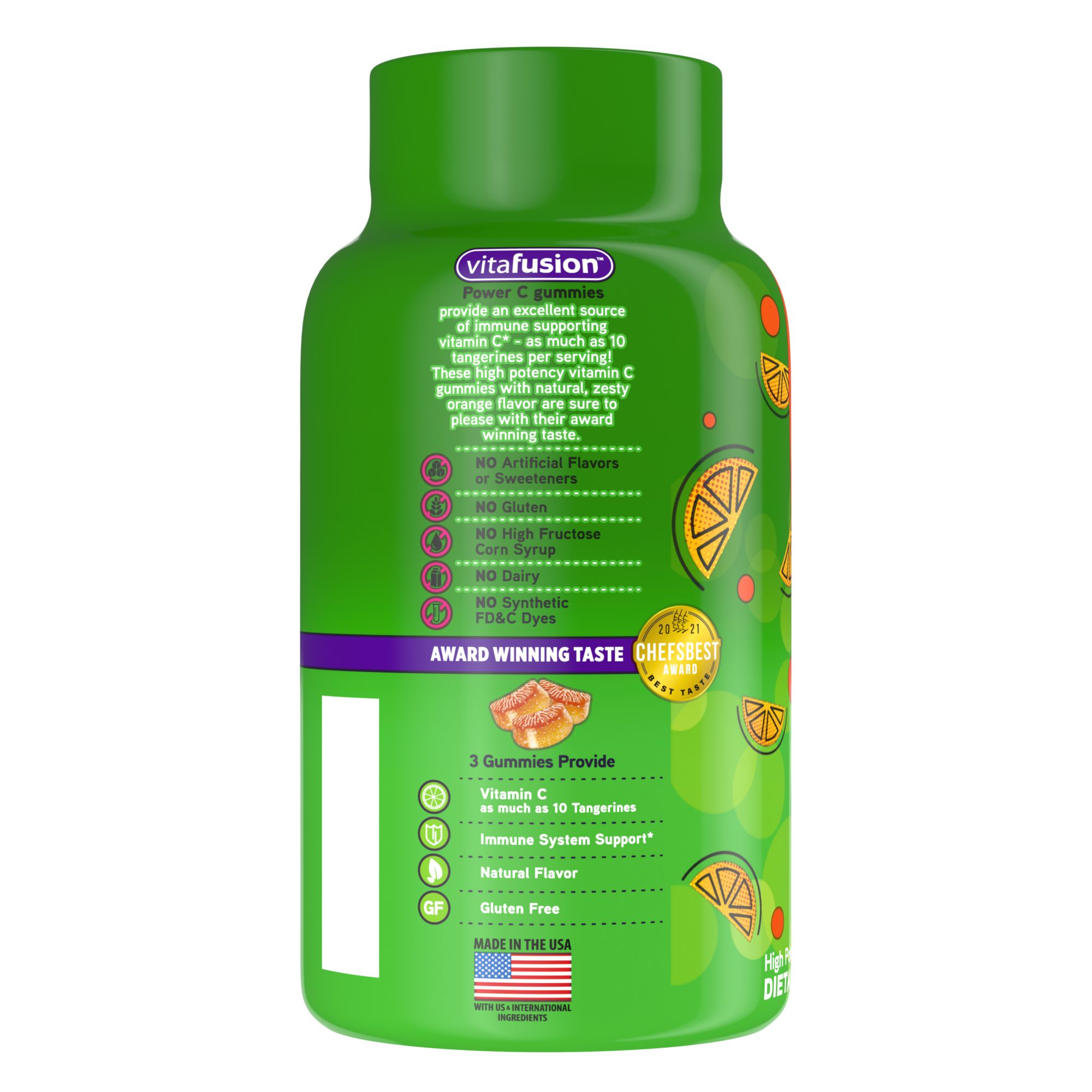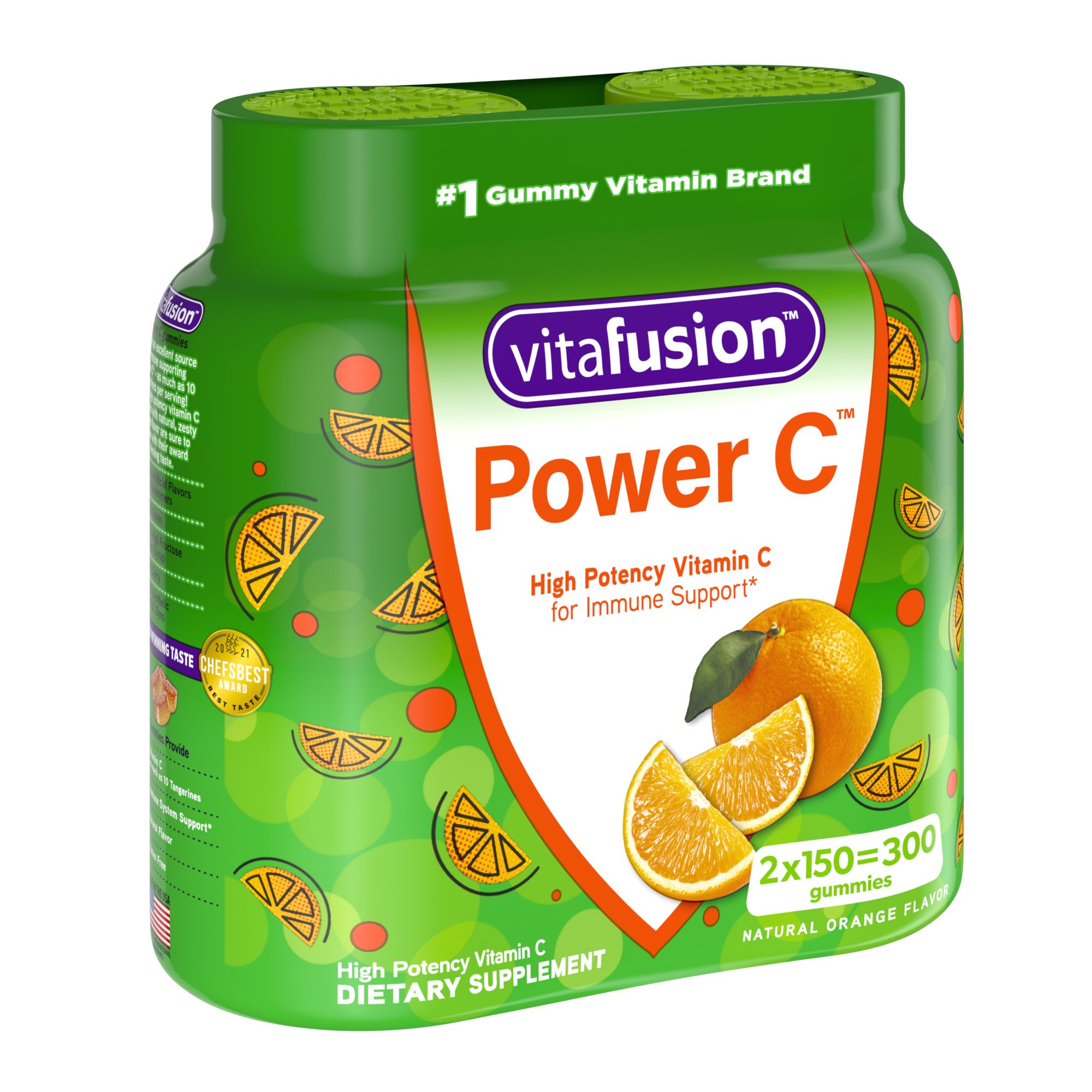 Two delicious Vitafusion Power C gummies provide an excellent source of immune supporting vitamin C with as much vitamin C as 10 tangerines. You'll enjoy the tangy orange flavor and feel good knowing that these gummy vitamins are made with natural flavor. Included are two 150-count bottles of vitamin C, for a total for 300 vitamin C supplements.