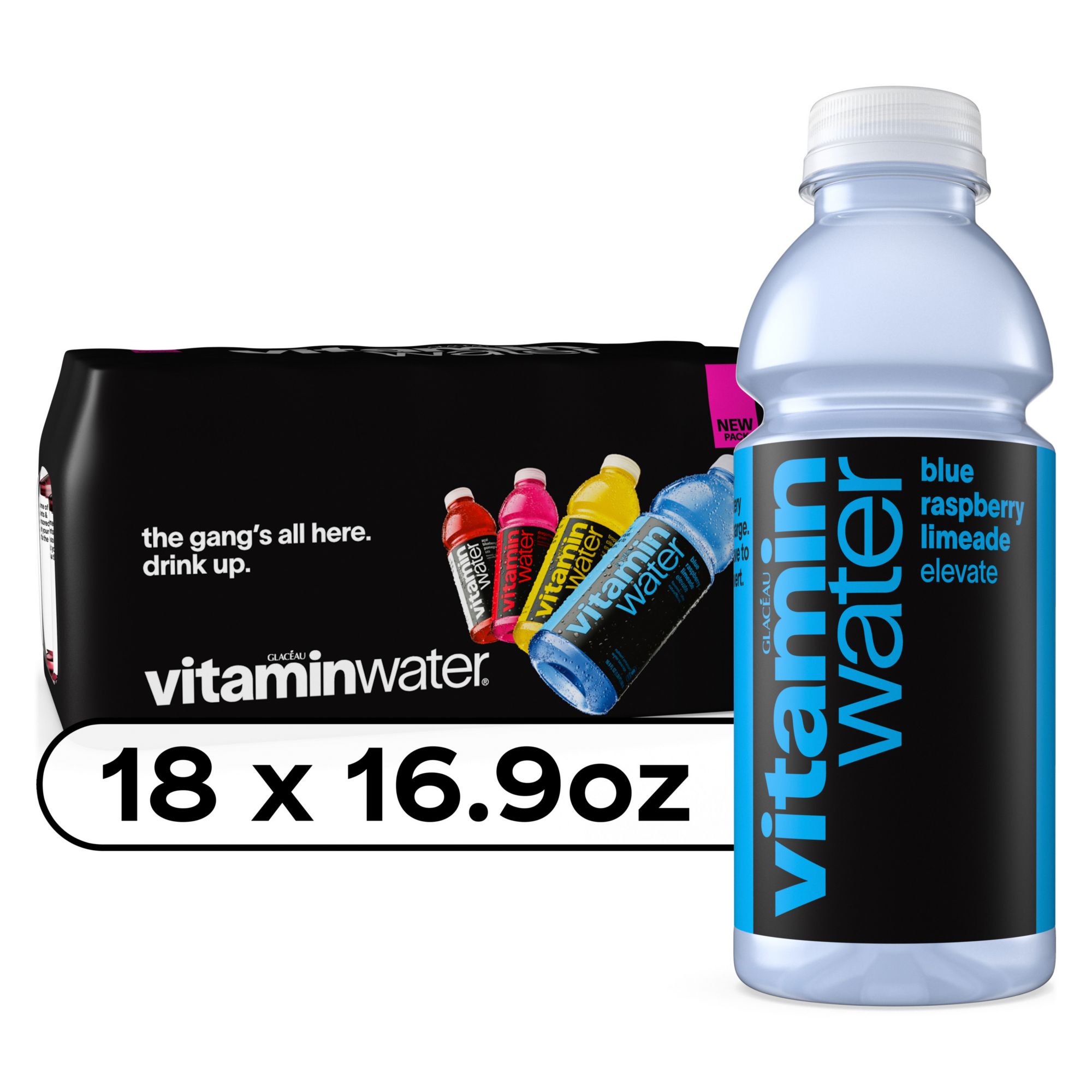 Ingredients: Vitaminwater Xxx Açai Blueberry Pomegranate: Reverse Osmosis Water, Crystalline Fructose, Less Than 0.5% Of: Vitamins A, C, B3, B5, B6, B12 (Beta-carotene, Ascorbic Acid, Niacinamide, Calcium Pantothenate, Pyridoxine Hydrochloride, Cyanocobalamin), Sodium Selenate, Manganese Citrate, Electrolytes (Magnesium And Calcium Lactates And Potassium Phosphate), Cane Sugar, Citric Acid, Gum Acacia, Natural Flavors, Fruit And Vegetable Juices (For Color). Vitaminwater Power-c Dragonfruit: Reverse Osmosis Water, Crystalline Fructose, Less Than 0.5% Of: Vitamins C, B5, B6, B12 (Ascorbic Acid, Calcium Pantothenate, Pyridoxine Hydrochloride, Cyanocobalamin), Electrolytes (Calcium And Magnesium Lactates And Potassium Phosphate), Taurine, Zinc Gluconate, Chromium Polynicotinate, Cane Sugar, Citric Acid, Natural Flavors, Vegetable Juices (For Color). Vitaminwater Energy Tropical Citrus: Reverse Osmosis Water, Crystalline Fructose, Less Than 0.5% Of: Vitamins C, B3, B5, B6, B12 (Ascorbic Acid, Niacinamide, Calcium Pantothenate, Pyridoxine Hydrochloride, Cyanocobalamin), Electrolytes (Calcium And Magnesium Lactates And Potassium Phosphate), Guarana Seed Extract, Caffeine, Cane Sugar, Citric Acid, Gum Acacia, Natural Flavors, Glycerol Ester Of Rosin, Beta-carotene (For Color), Stevia Leaf Extract. Vitaminwater Elevate Blue Raspberry Limeade: Reverse Osmosis Water, Crystalline Fructose, Less Than 0.5% Of: Electrolytes (Calcium And Magnesium Lactate And Calcium And Potassium Phosphate), Fruit Juice (For Color), Natural Flavors, Citric Acid, Cane Sugar, Vitamins A, C, E, B3, B5, B6, B7 (Retinyl Palmitate, Ascorbic Acid, Alpha-tocopheryl Acetate, Niacinamide, Calcium Pantothenate, Pyridoxine Hydrochloride, Biotin), Zinc Gluconate, Stevia Leaf Extract, Sodium Selenate (Selenium).