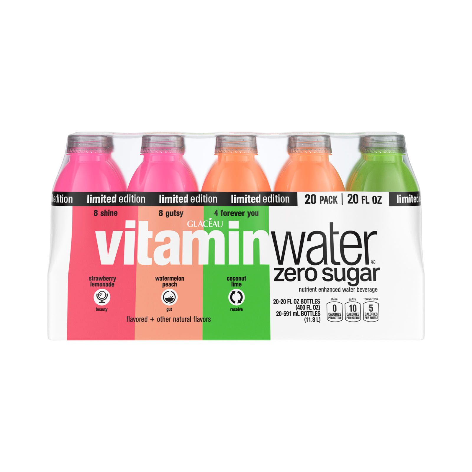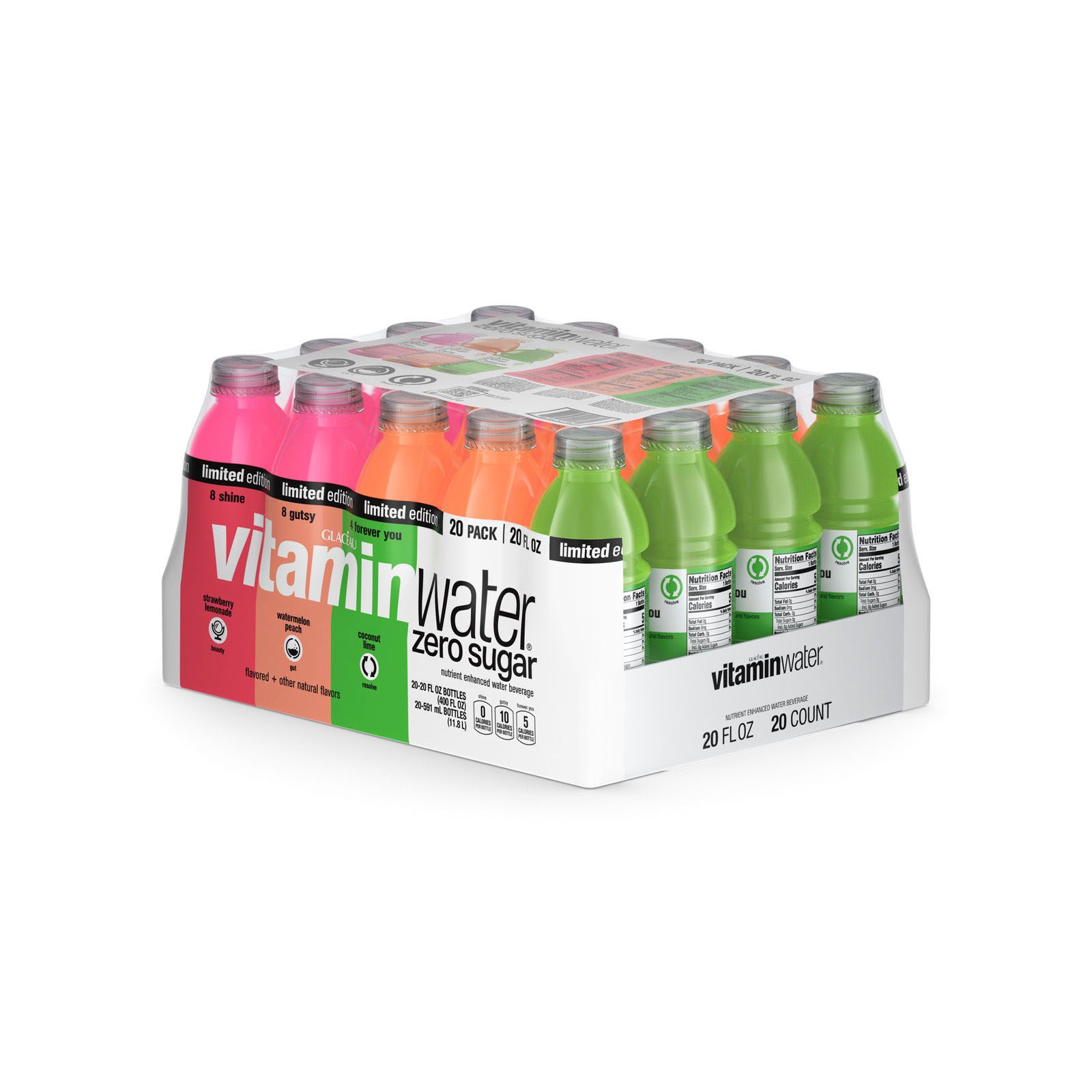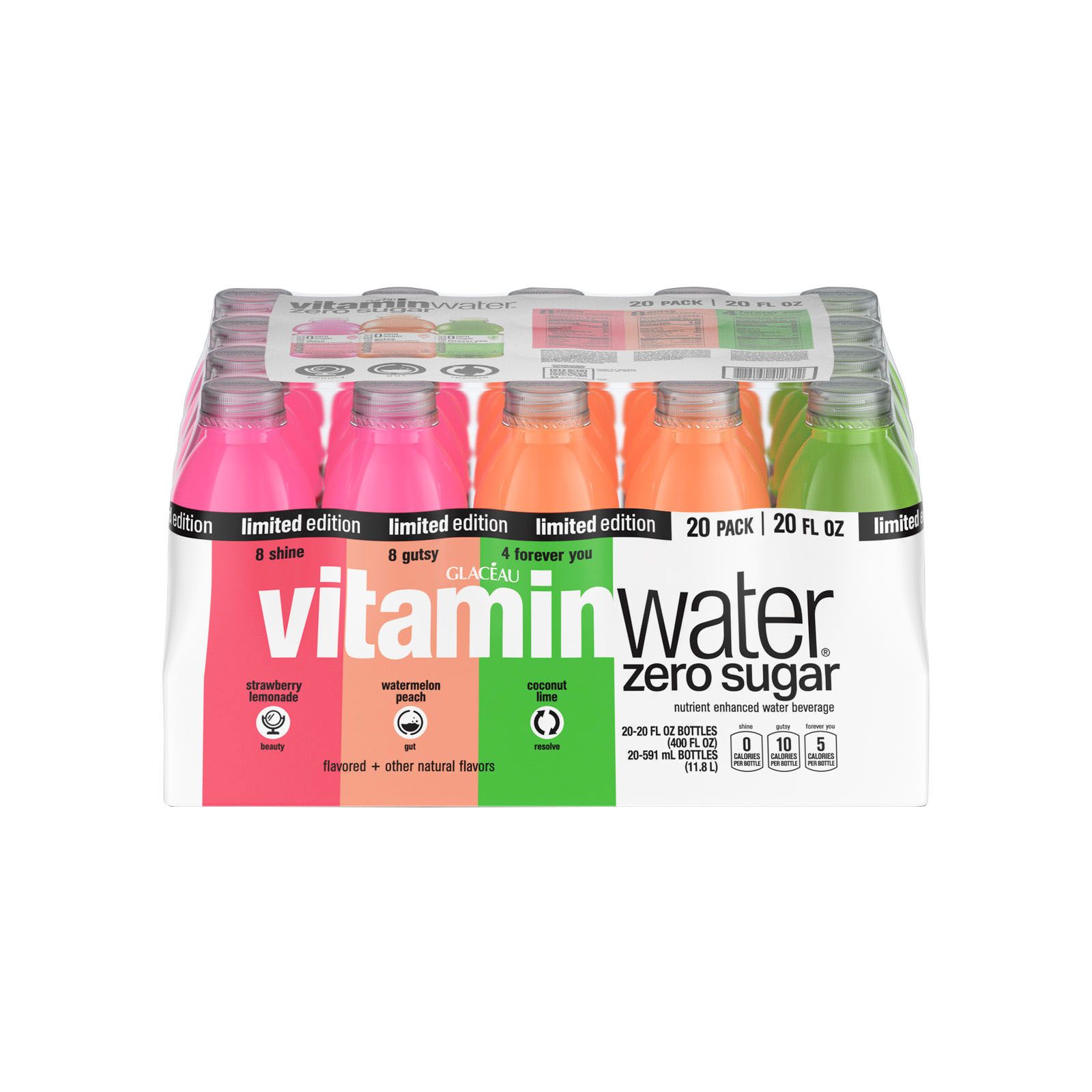 Pack with eight Shine (Strawberry Lemonade) 20 oz. bottles, eight Gutsy (Watermelon Peach) 20 oz. bottles, four Forever You (Coconut Lime) 20 oz. Bottles