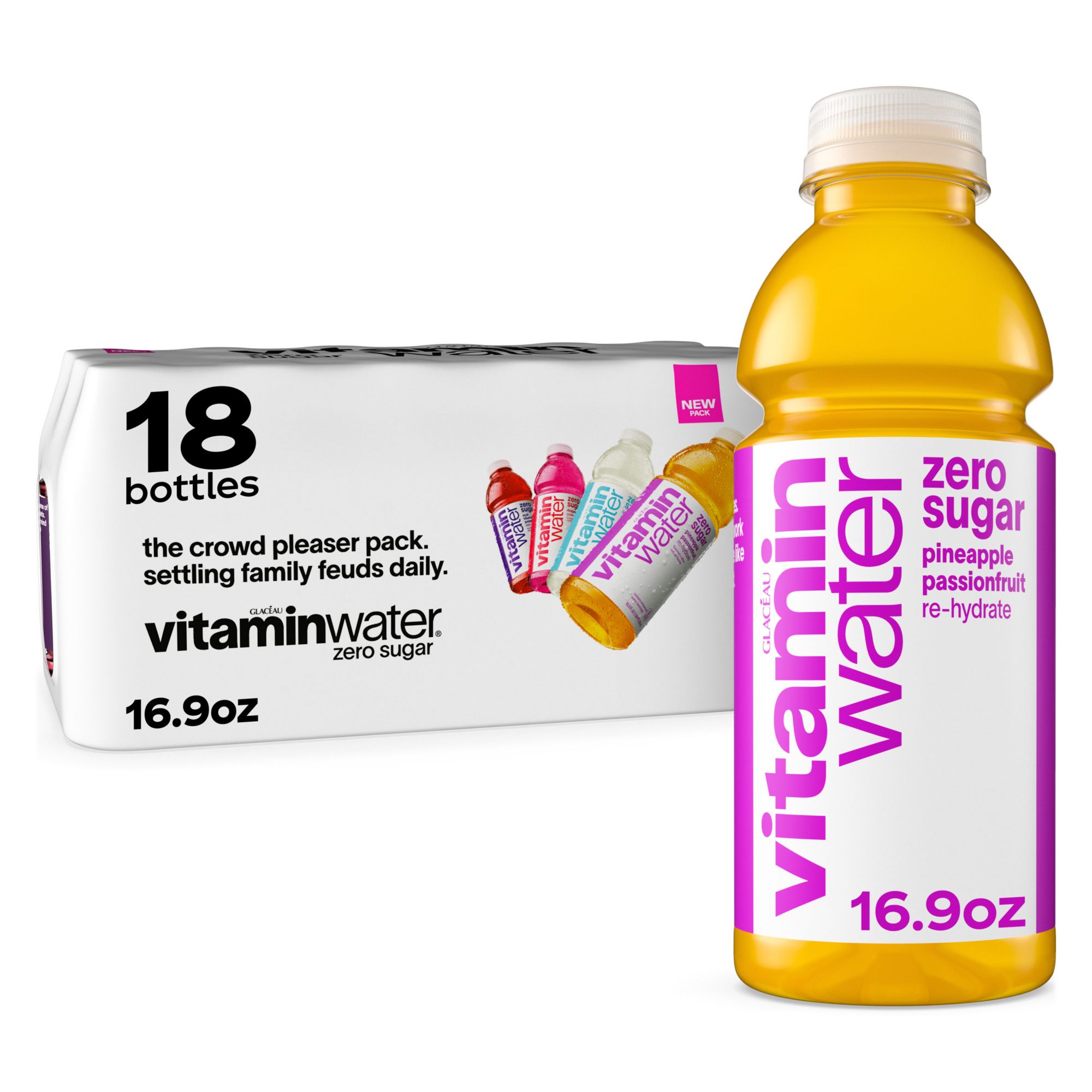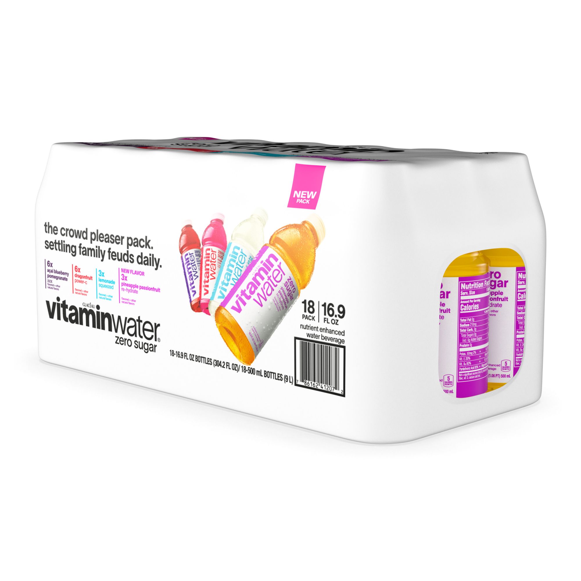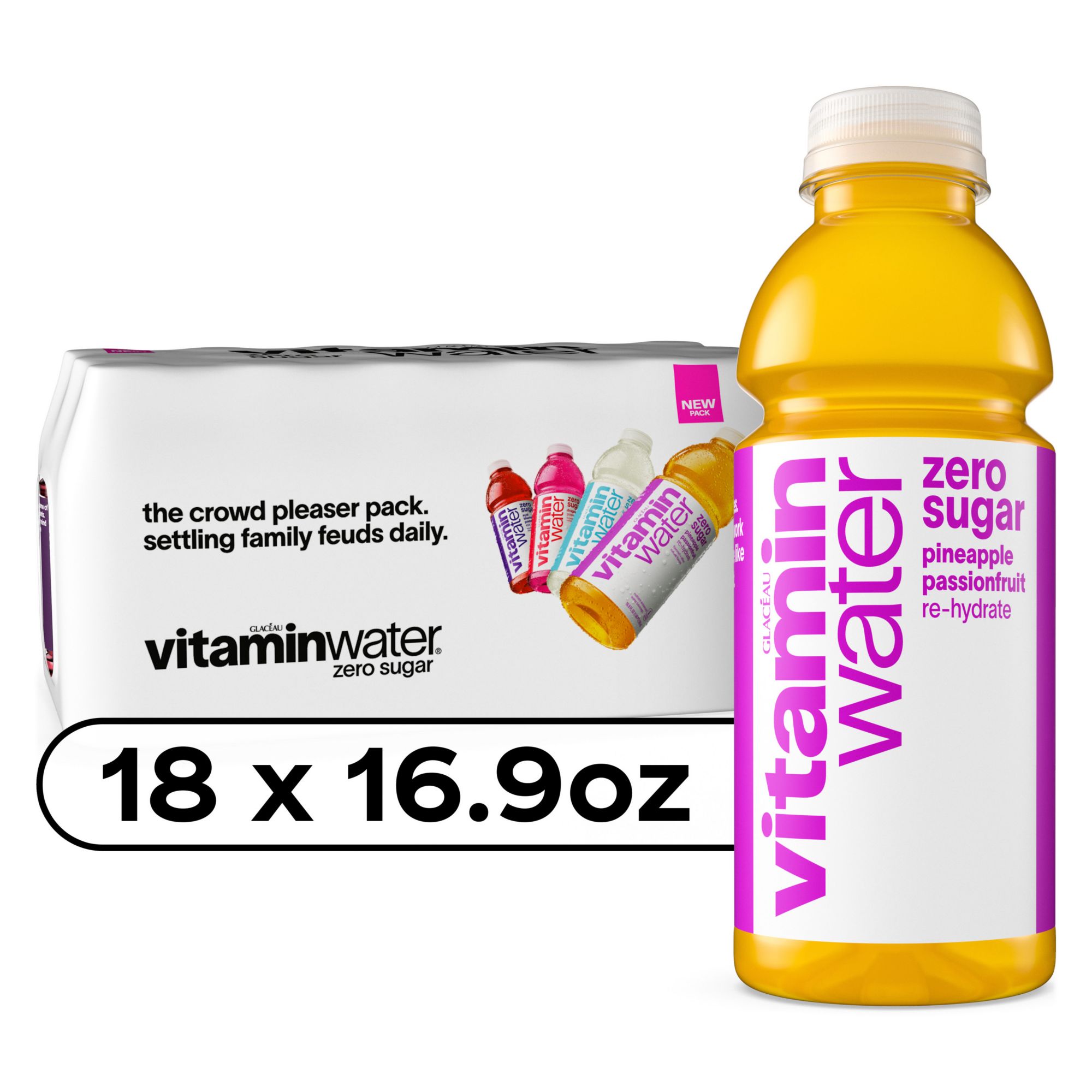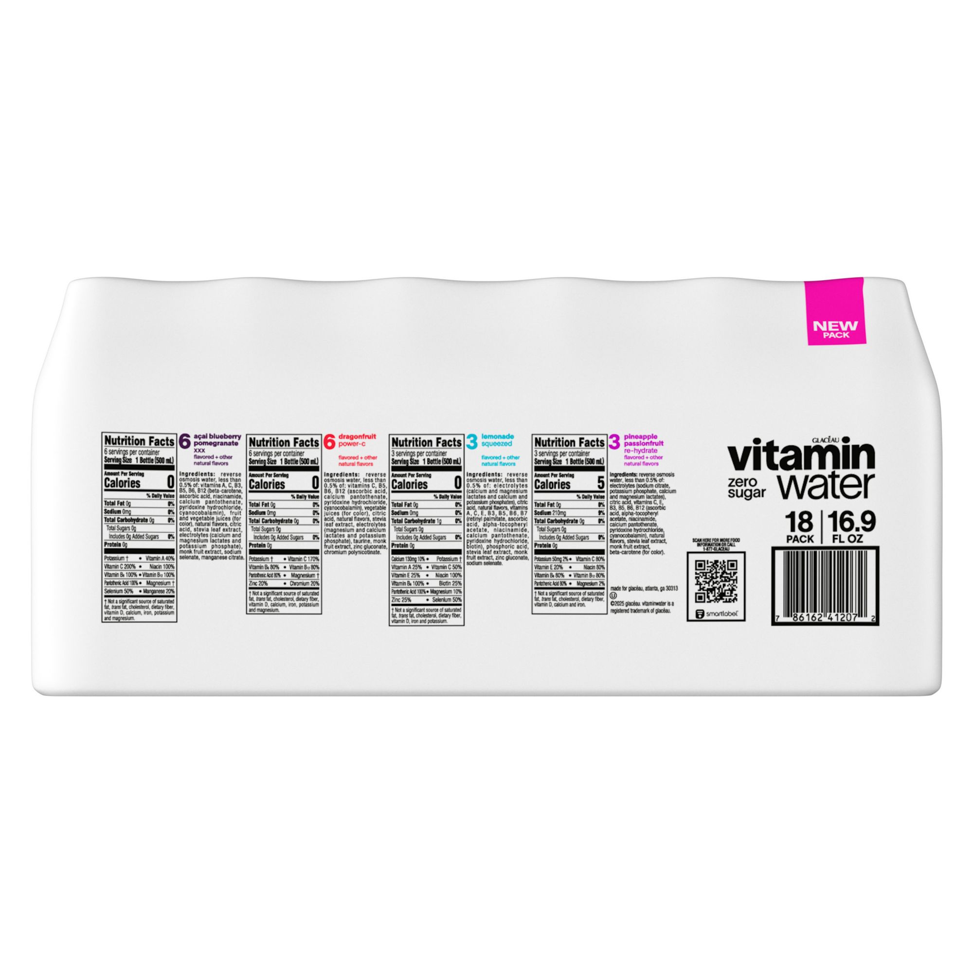 Ingredients: vitaminwater Zero Sugar XXX Açai Blueberry Pomegranate: reverse osmosis water, crystalline fructose, less than 0.5% of: vitamins A, C, B3, B5, B6, B12 (beta-carotene, ascorbic acid, niacinamide, calcium pantothenate, pyridoxine hydrochloride, cyanocobalamin), sodium selenate, manganese citrate, electrolytes (magnesium and calcium lactates and potassium phosphate), cane sugar, citric acid, gum acacia, natural flavors, fruit and vegetable juices (for color). vitaminwater Zero Sugar Power-C Dragonfruit: reverse osmosis water, less than 0.5% of: vitamins A, C, B3, B5, B6, B12 (beta-carotene, ascorbic acid, niacinamide, calcium pantothenate, pyridoxine hydrochloride, cyanocobalamin), fruit and vegetable juices (for color), natural flavors, citric acid, stevia leaf extract, electrolytes (calcium and magnesium lactates and potassium phosphate), monk fruit extract, sodium selenate, manganese citrate. vitaminwater Zero Sugar Squeezed Lemonade: reverse osmosis water, less than 0.5% of: electrolytes (calcium and magnesium lactates and calcium and potassium phosphates), citric acid, natural flavors, vitamins A, C, E, B3, B5, B6, B7 (retinyl palmitate, ascorbic acid, alpha-tocopheryl acetate, niacinamide, calcium pantothenate, pyridoxine hydrochloride, biotin), phosphoric acid, stevia leaf extract, monk fruit extract, zinc gluconate, sodium selenate. vitaminwater Zero Sugar Re-hydrate Pineapple Passionfruit: reverse osmosis water, less than 0.5% of: electrolytes (sodium citrate, potassium phosphate, calcium and magnesium lactates), citric acid, vitamins C, E, B3, B5, B6, B12 (ascorbic acid, alpha-tocopheryl acetate, niacinamide, calcium pantothenate, pyridoxine hydrochloride, cyanocobalamin), natural flavors, stevia leaf extract, monk fruit extract, beta-carotene (for color).