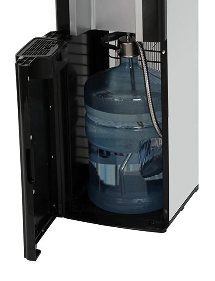 This innovative bottom load water dispenser makes changing empty water bottles a snap. Lifting heavy bottles and cleaning accidental spills are eliminated, as the bottle is connected and stored in the bottom cabinet. With a rich black and platinum finish, the dispenser is sure to complement any room. Energy Star-rated, the patented kettle features uses 70% less energy than traditional hot and cold water dispensers that heat water constantly.