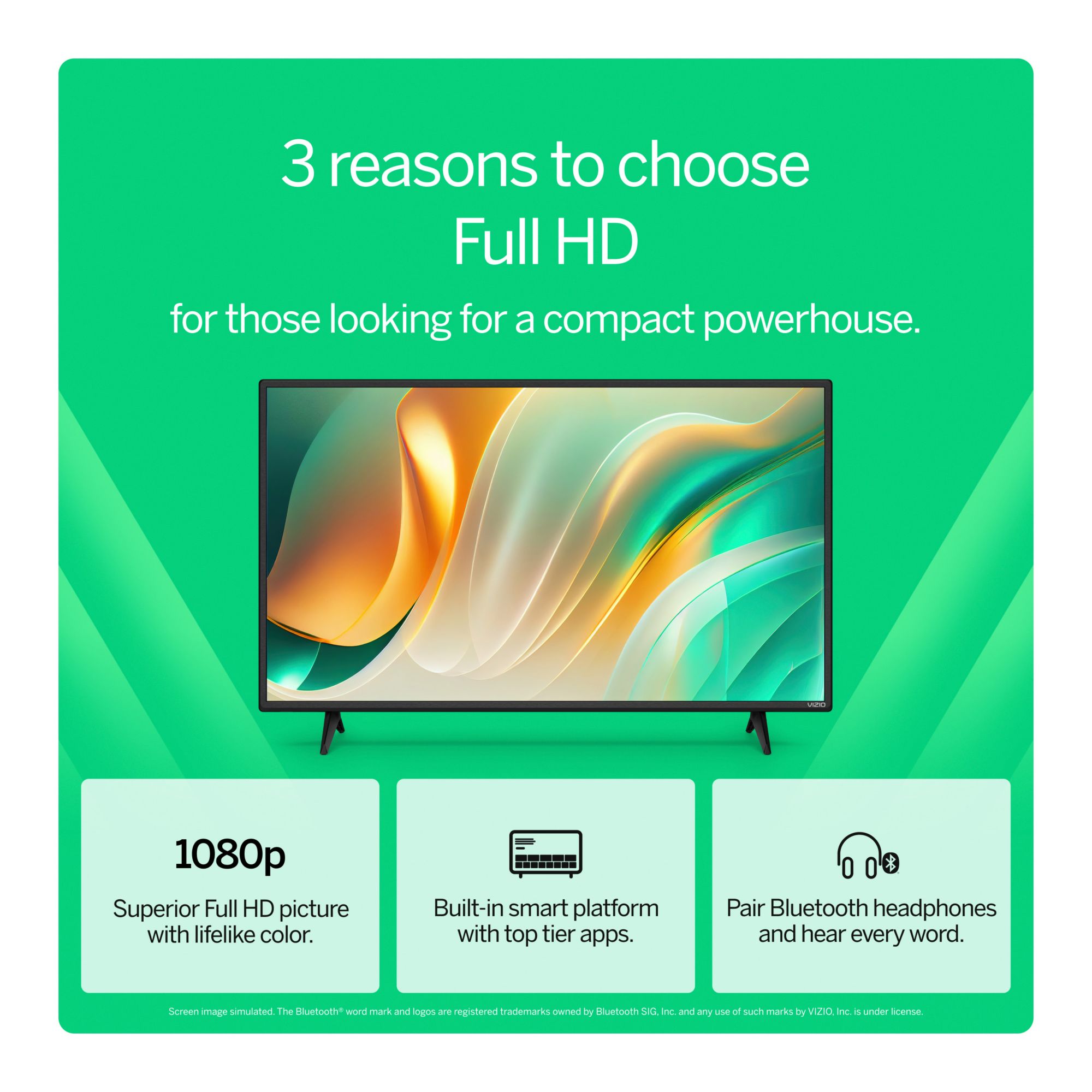 Built for those who appreciate the (not-so) little things. Discover clarity in Full HD, vivid contrast, and color with Full Array LED Backlight and Active Pixel Tuning. Plus, enjoy instant access to built-in apps, a customizable Home Screen, and Bluetooth headphone support for uninterrupted listening. Captivating clarity - Full HD delivers a step up in clarity from HD with richer contrast and true-to-life color achieved with Full Array LED Backlight and fine-tuned at a granular level with Active Pixel Tuning. Smart and easy - Enjoy instant access to the best selection of built-in apps from top-tier streaming services and explore new apps as they are automatically added and updated. Stream 275+ free channels and 15,000+ movies and shows On Demand with the built-in WatchFree+ app. Bluetooth listening - Pair your Bluetooth headphones for uninterrupted listening, whether streaming your favorite show, playing a podcast, or blasting your top tunes. Game-ready - See details your opponent won’t with HDR10 support on HDMI. Plus, when a console or PC is detected, FHD models automatically enable Auto Low Latency Mode and integrated gaming menu for optimal gaming performance.
