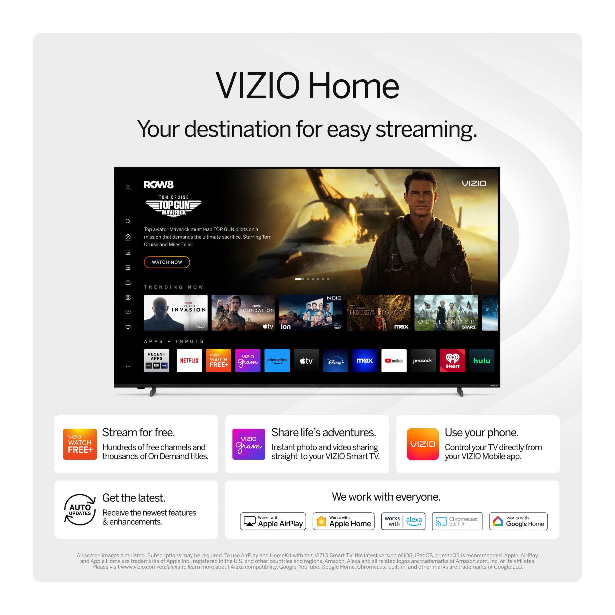 To use AirPlay and HomeKit with this VIZIO Smart TV, the latest version of iOS, iPadOS, or macOS is recommended. Apple, AirPlay, and Apple Home are trademarks of Apple Inc., registered in the U.S. and other countries and regions.