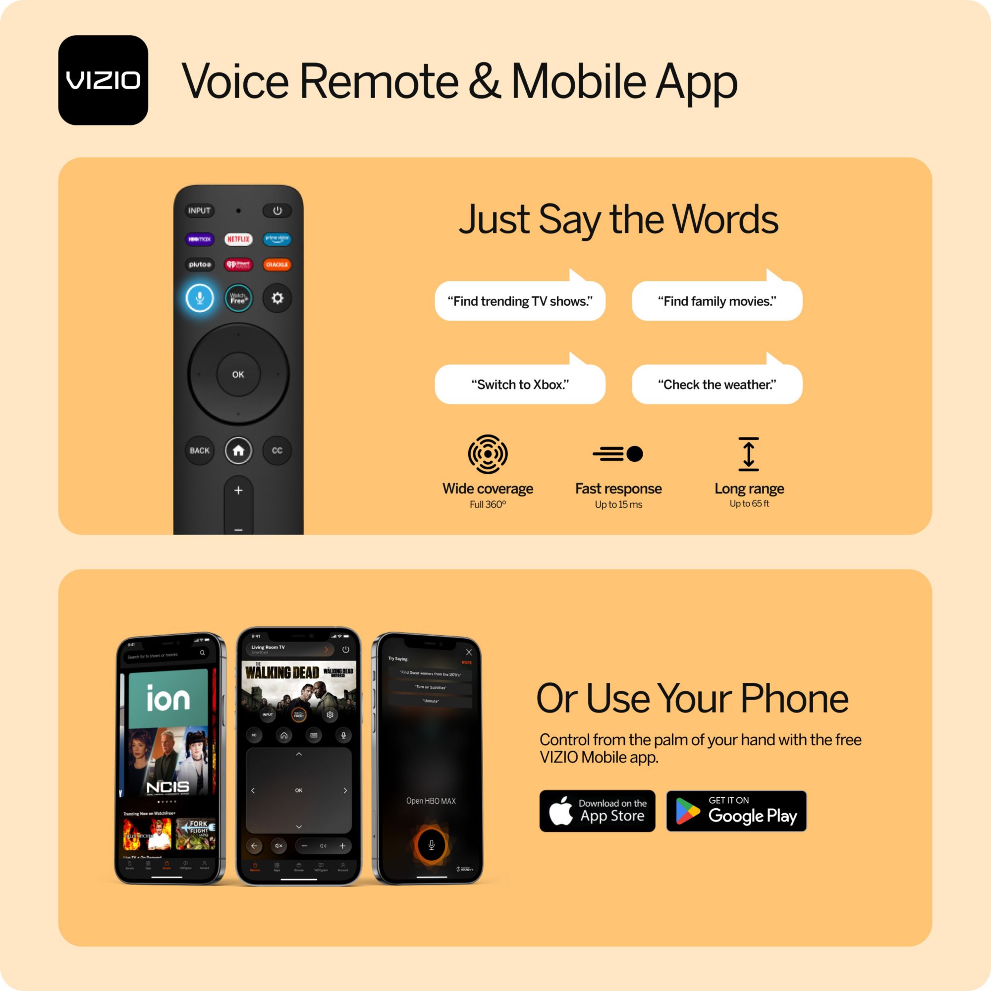 Browse your favorite apps and easily search and discover content with one click from your home screen. Even easier? Just say the words and the included VIZIO Voice Remote and free mobile app will do the work.