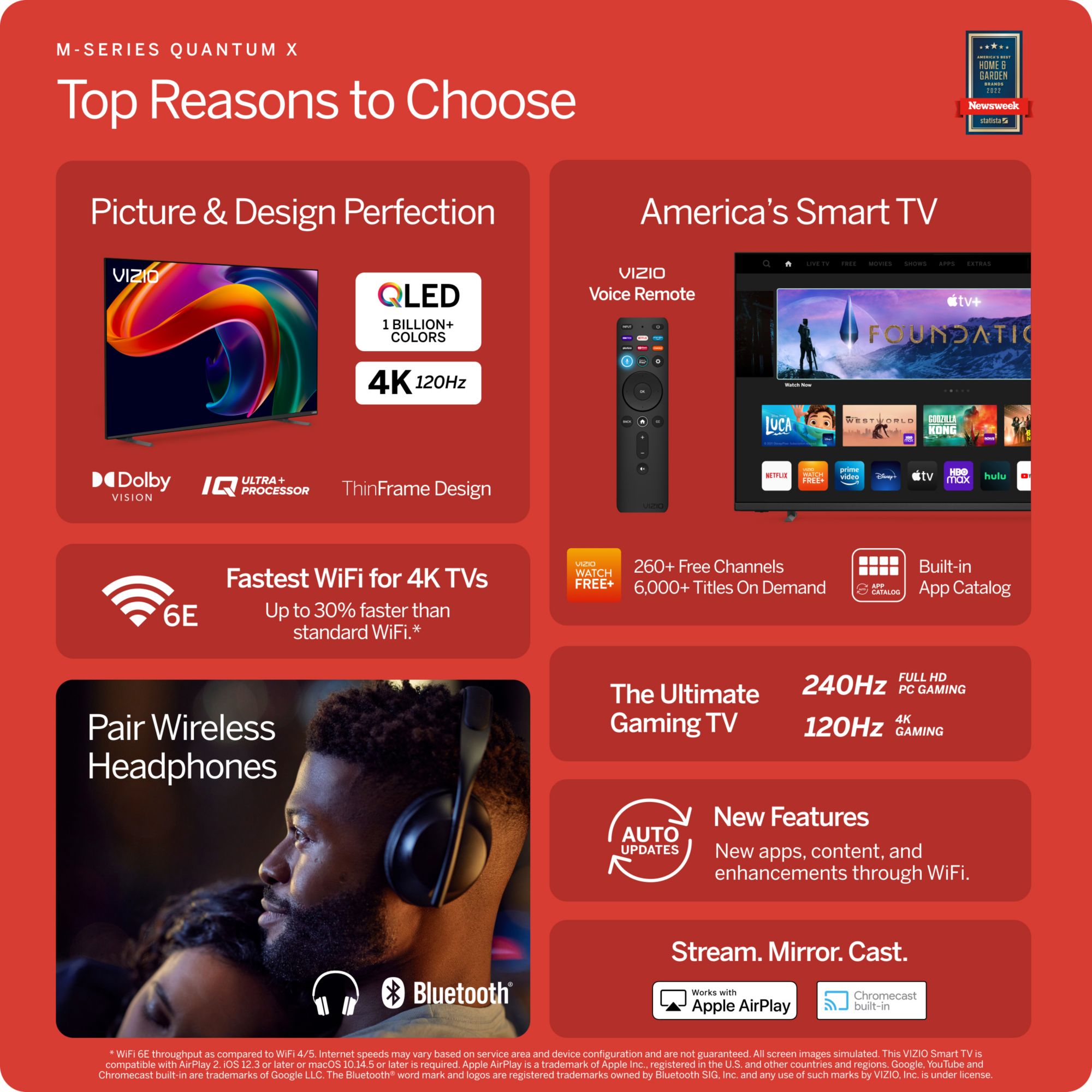 Experience the extraordinary. Celebrate VIZIO’s 20th Anniversary with the new VIZIO M-Series Quantum X 4K QLED HDR Smart TV. Step up to immersive Active Full Array LED streaming and gaming with 1 billion+ colors of picture perfection, all wrapped in VIZIO’s ThinFrame Design. America’s Smart TV gives you millions of movies, shows, sports, news, free channels, and more in seconds.