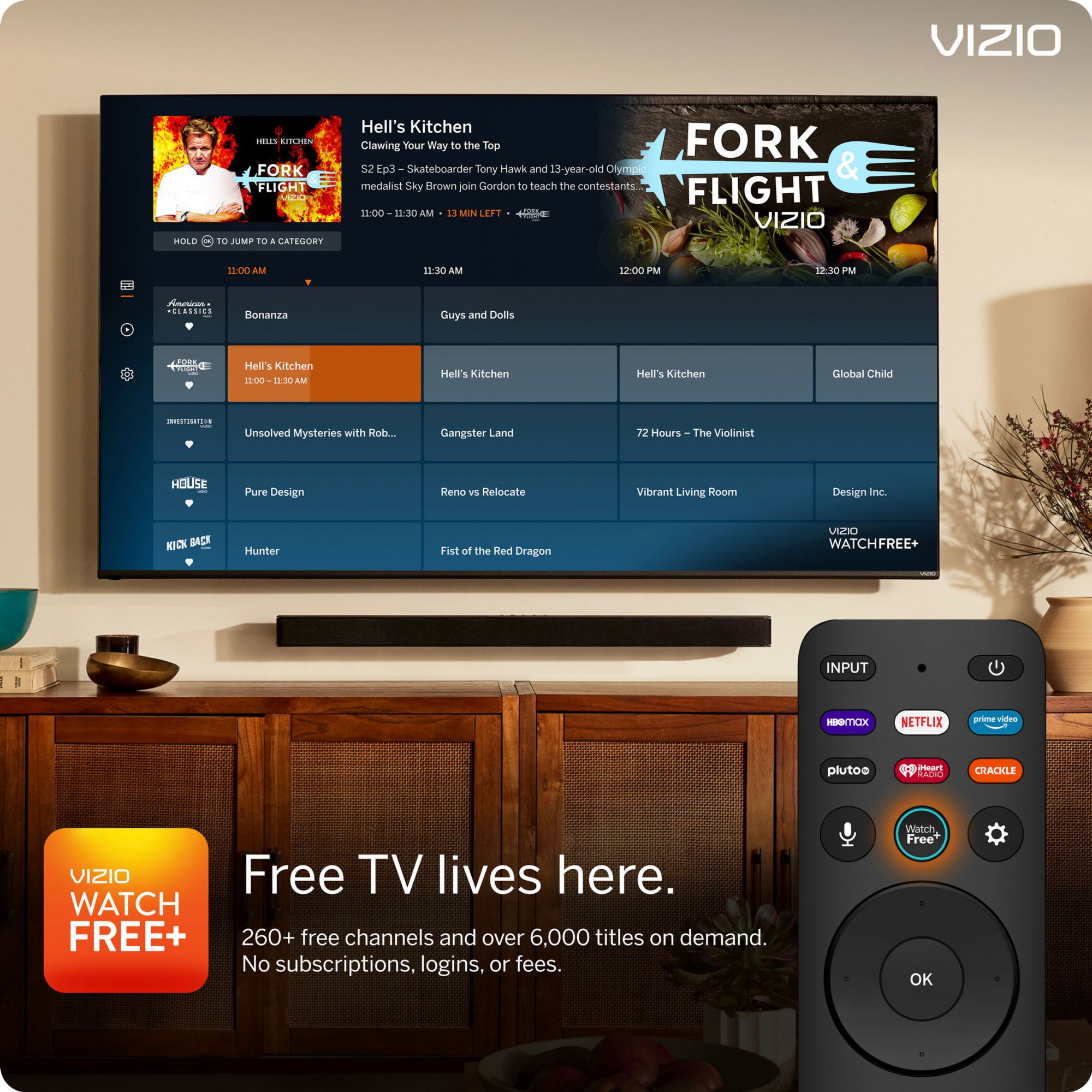 Save on cable bills and stream for free with VIZIO WatchFree+. Built-in to every new VIZIO TV, WatchFree+ gives you 250+ live streaming channels and over 5,000 titles on demand. No subscriptions, logins, or fees.