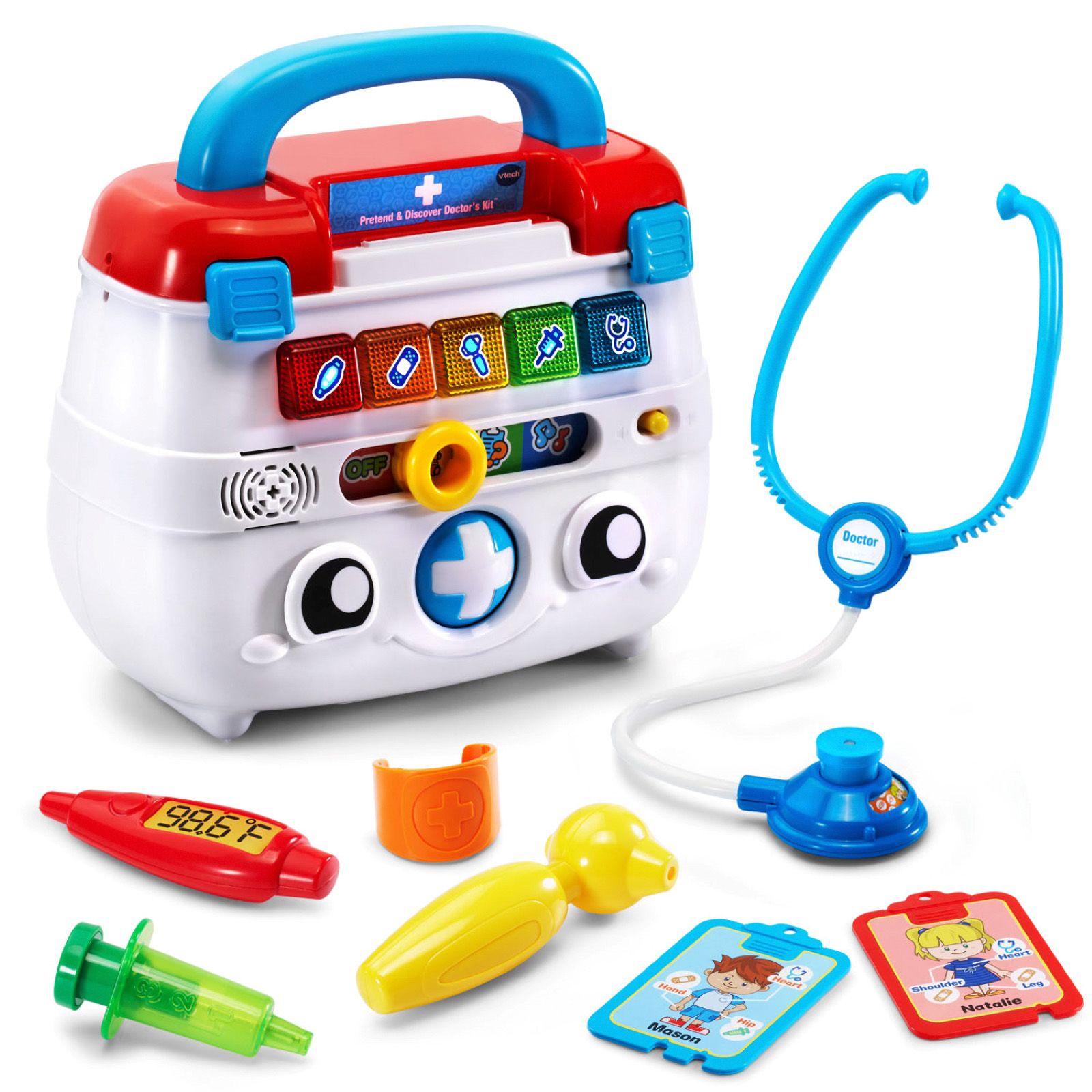 Includes toy stethoscope, otoscope, bandage, syringe, and thermometer. Two double-sided patient cards, doctor kit